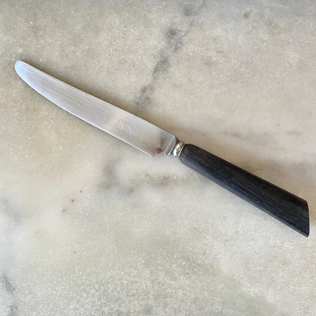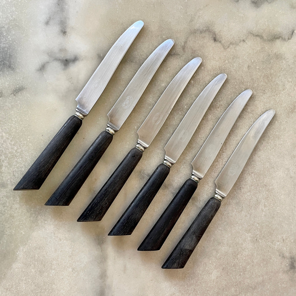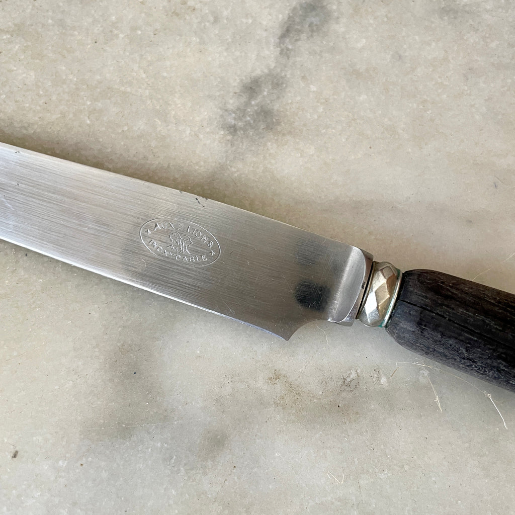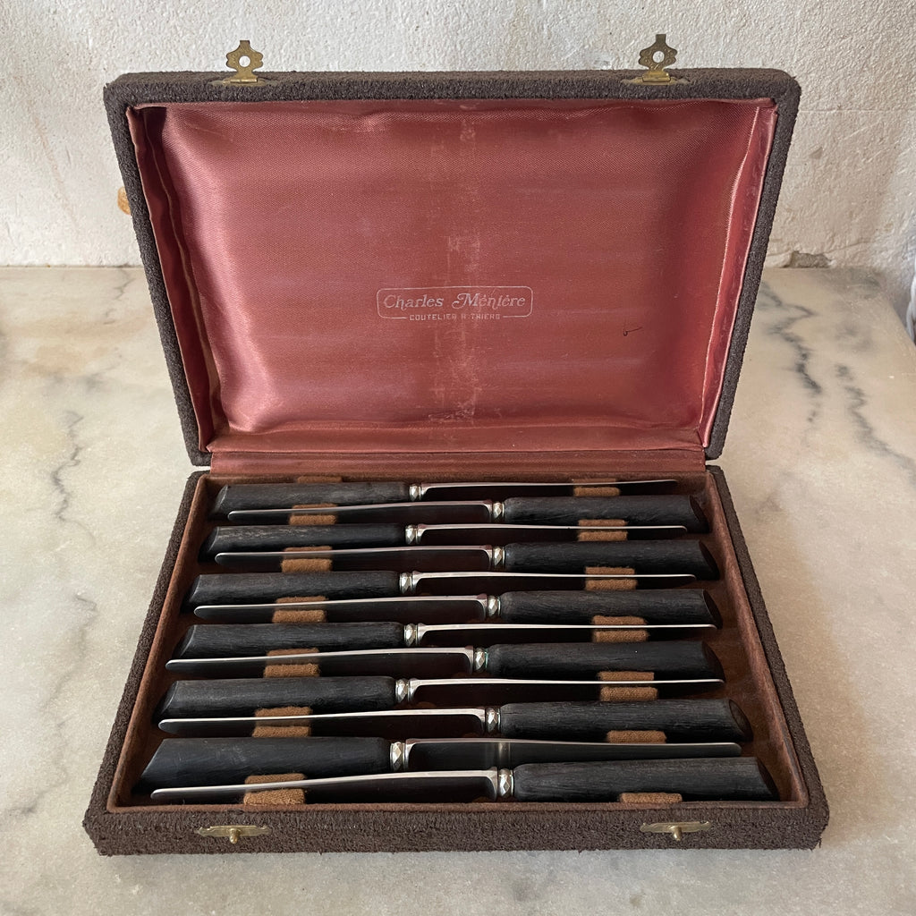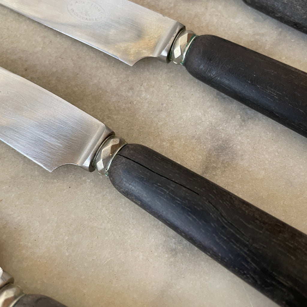 / Lot de 12 couteaux à fromage manche en bois noirci "Aux 2 Lions"