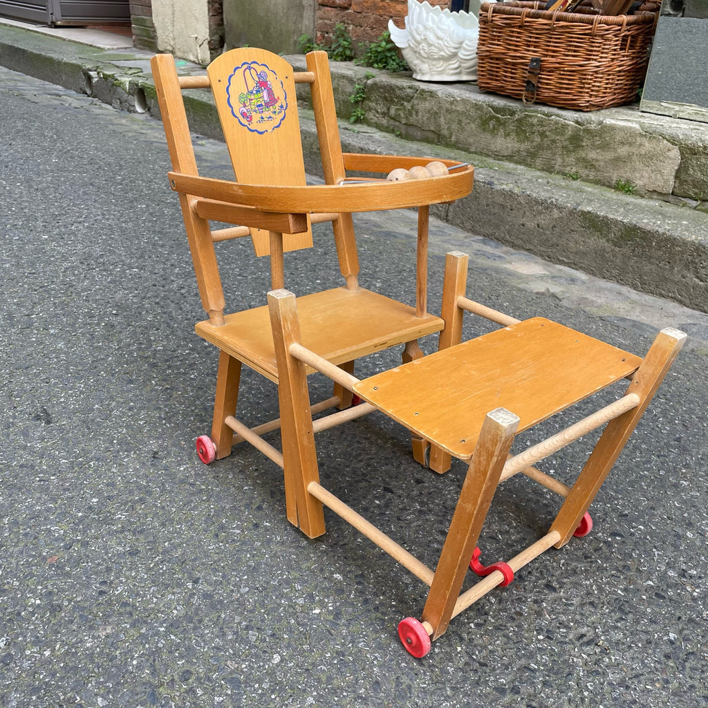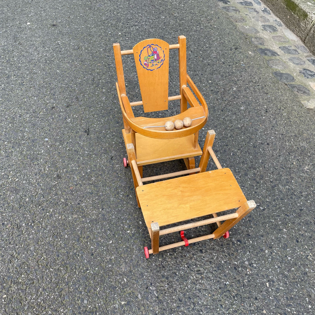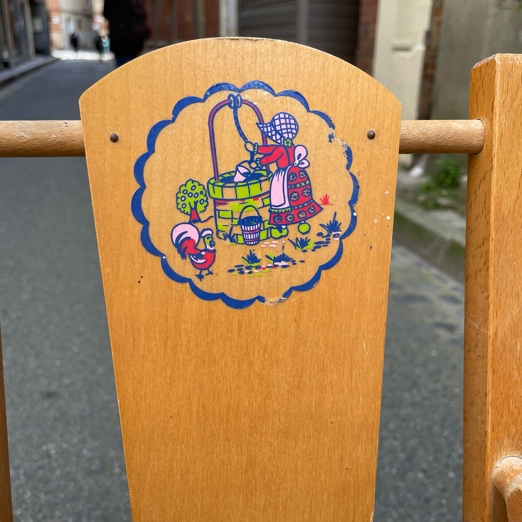 En bois avec un charmant dessin d'une petite fille près d'un puits peint sur le dossier.