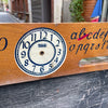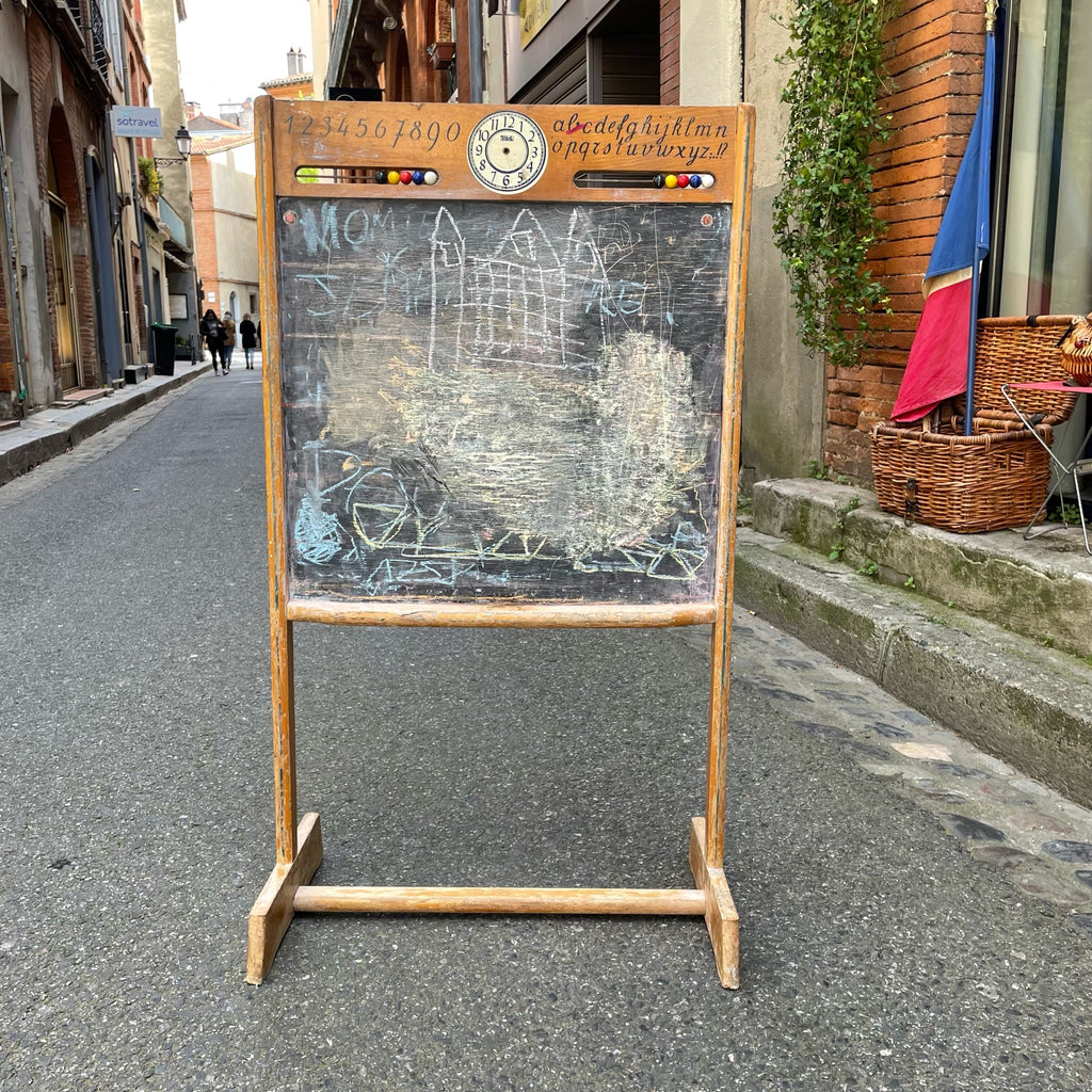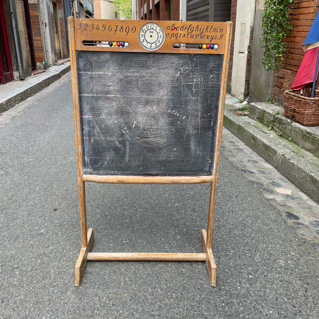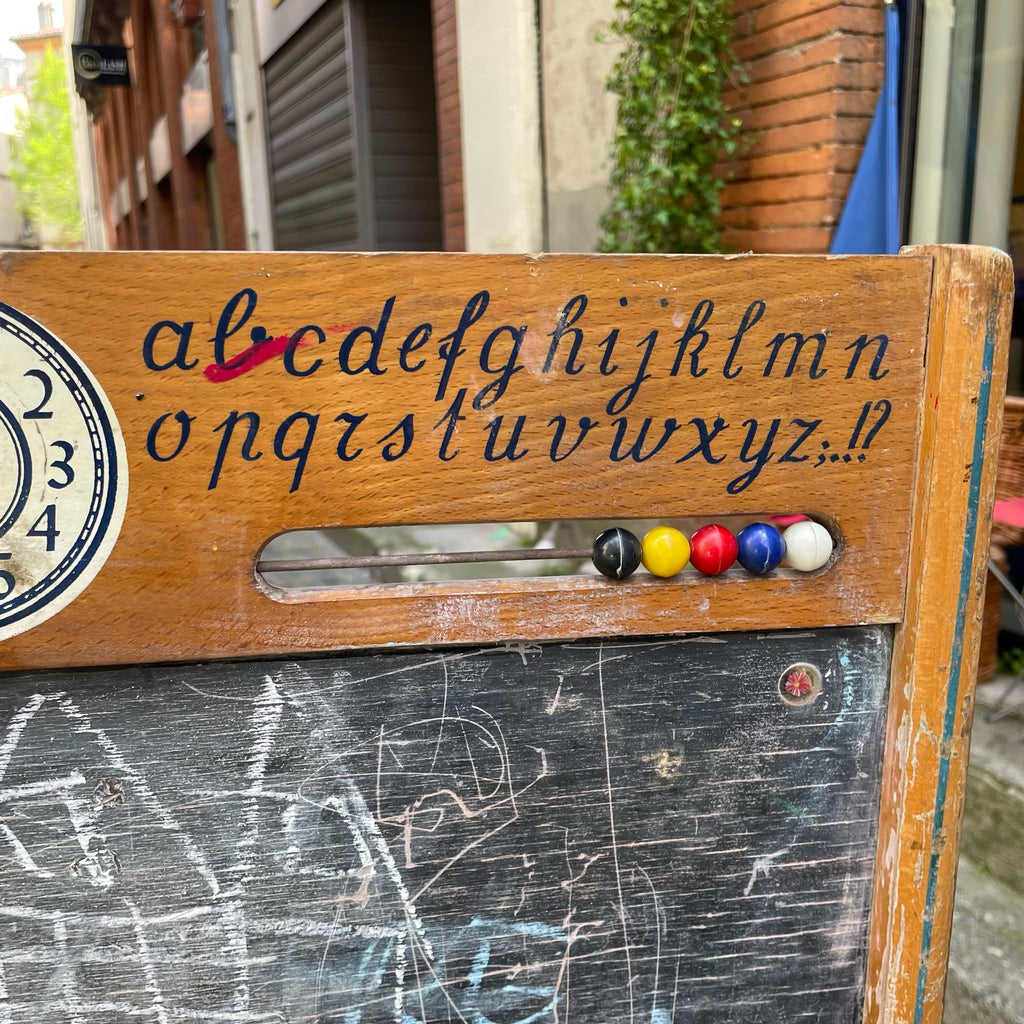Joli petit tableau en ardoise pour enfant recto-verso avec support pour craies, boulier et horloge (aiguilles manquantes). Marque Torck.