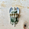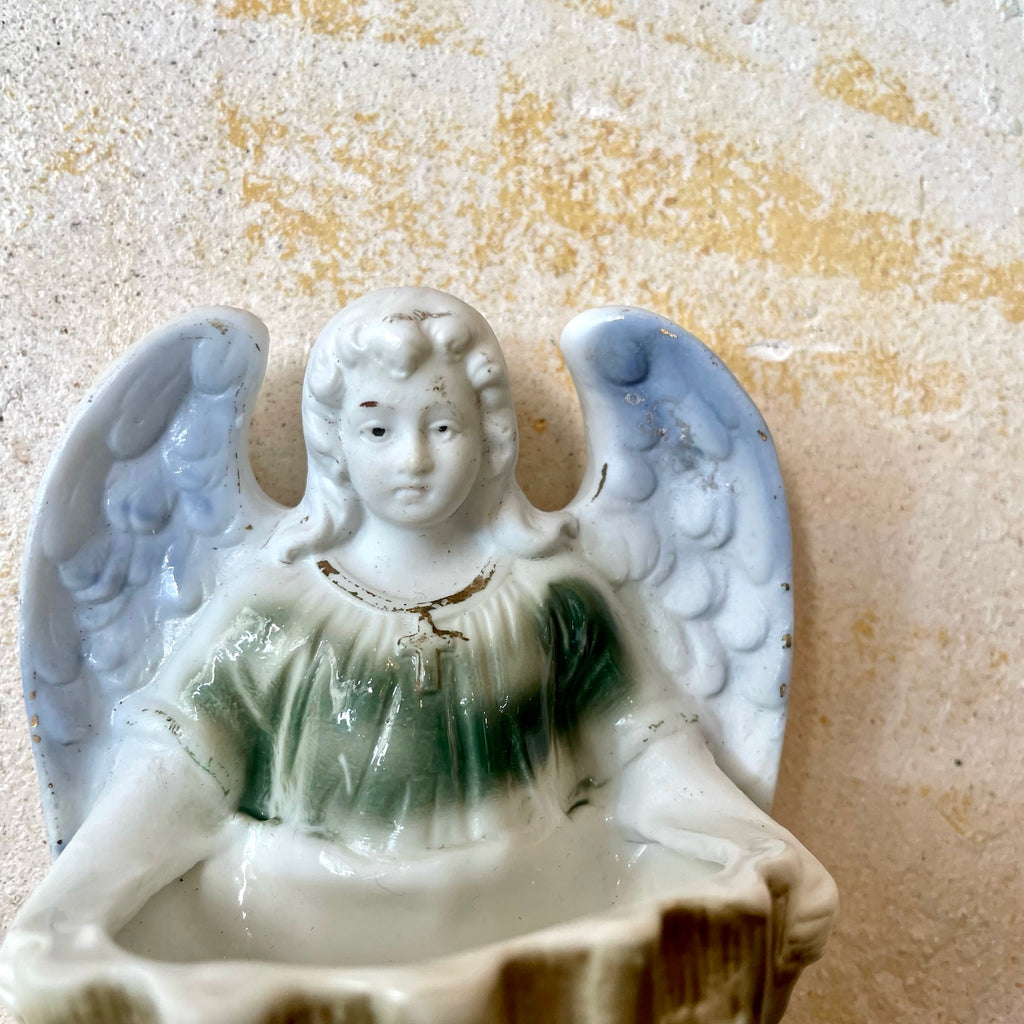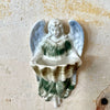 Représente un ange à la longue chevelure, aux ailes bleu ciel et au drapé émaillé de couleur verte. Inscription au dos Germany 8672.