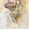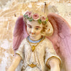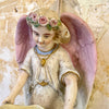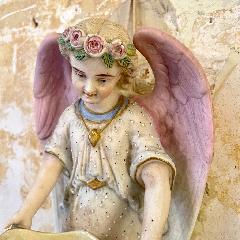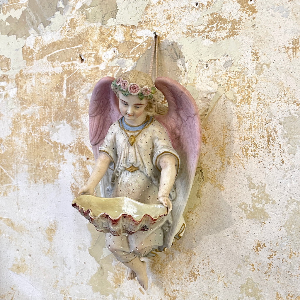 Bénitier XL en biscuit polychrome représentant un ange. Couronne de fleurs sur la tête.