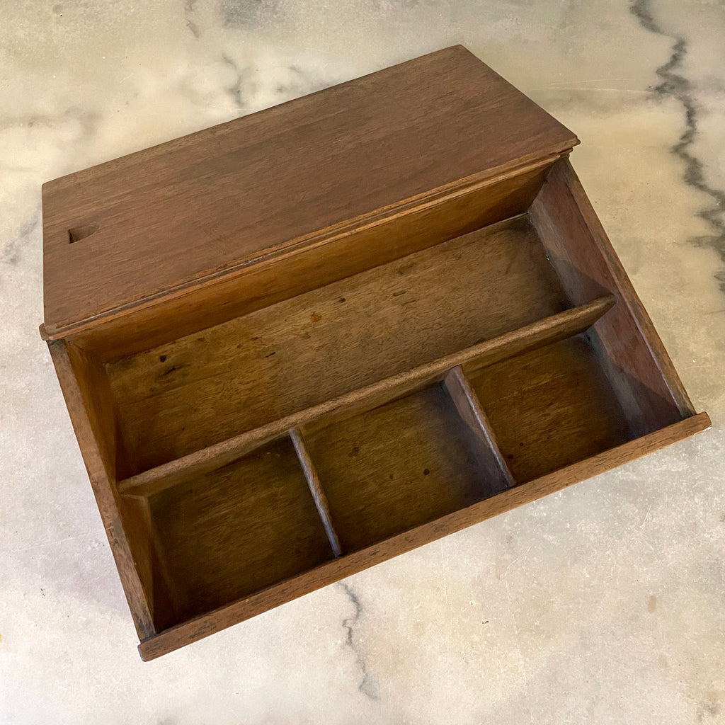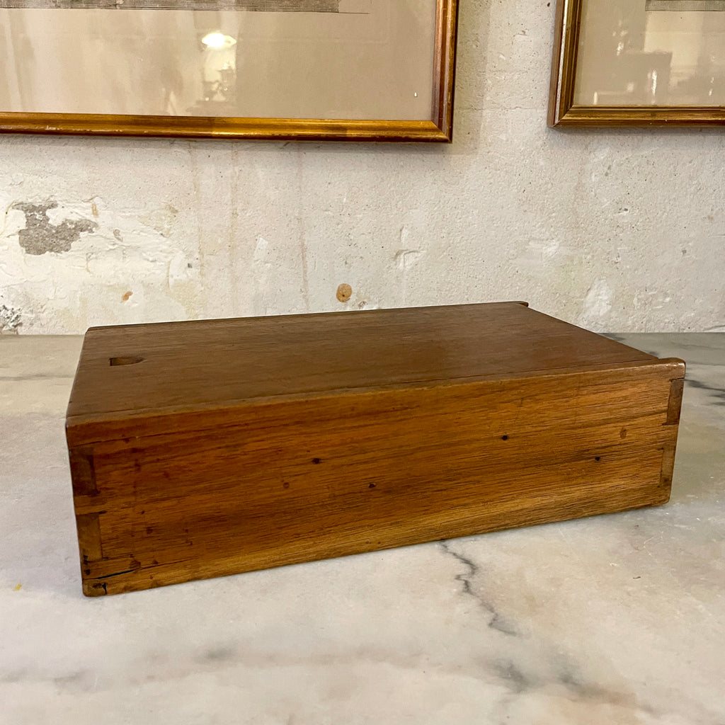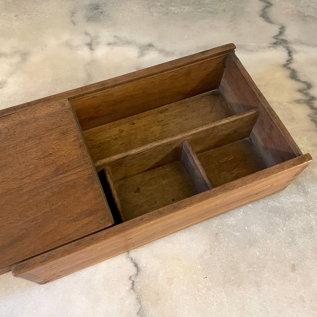 Ancien coffret de rangement en bois, couvercle coulissant avec petite encoche. 4 compartiments. Utilisée par l'ancien propriétaire comme boîte à cirage.