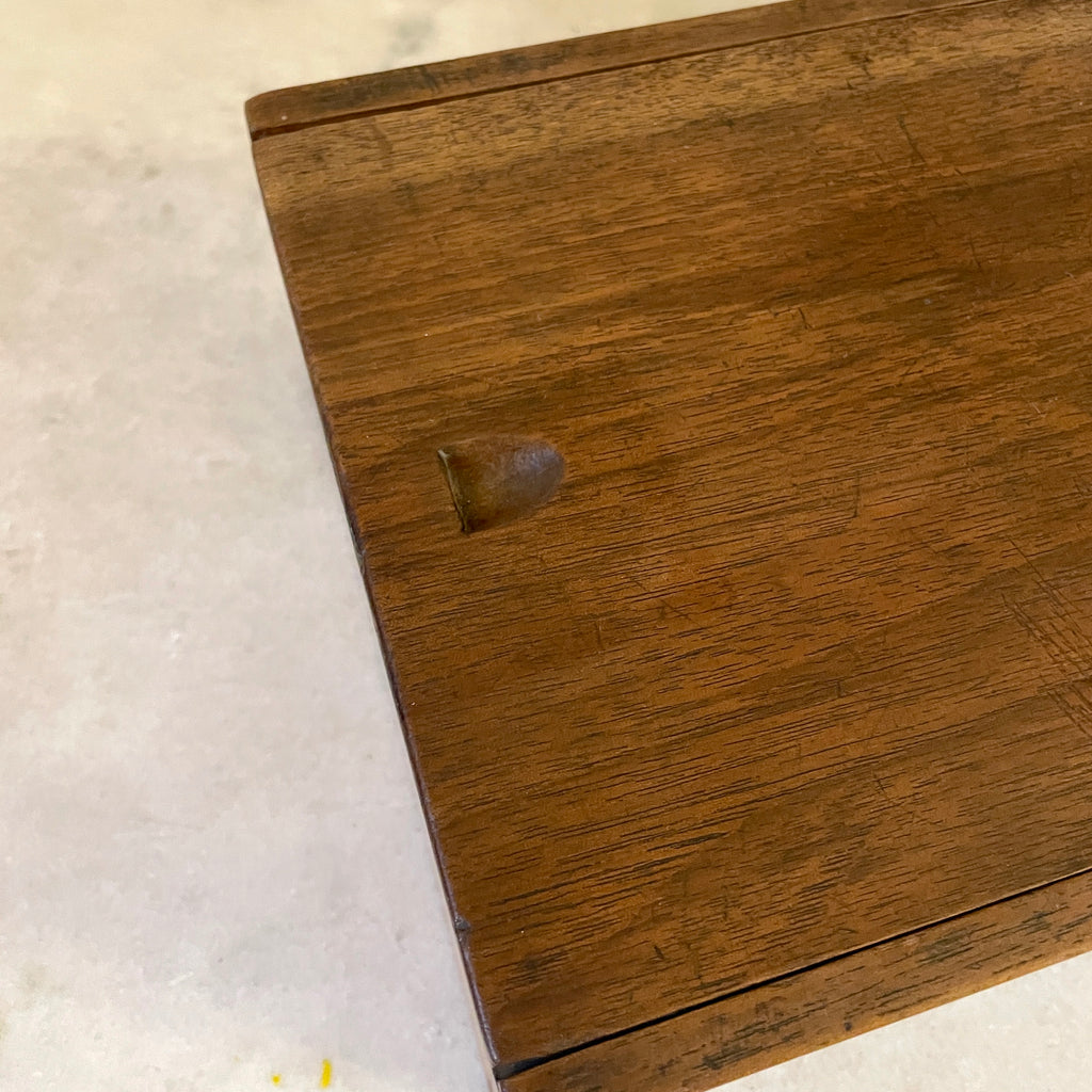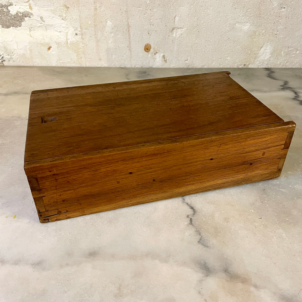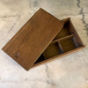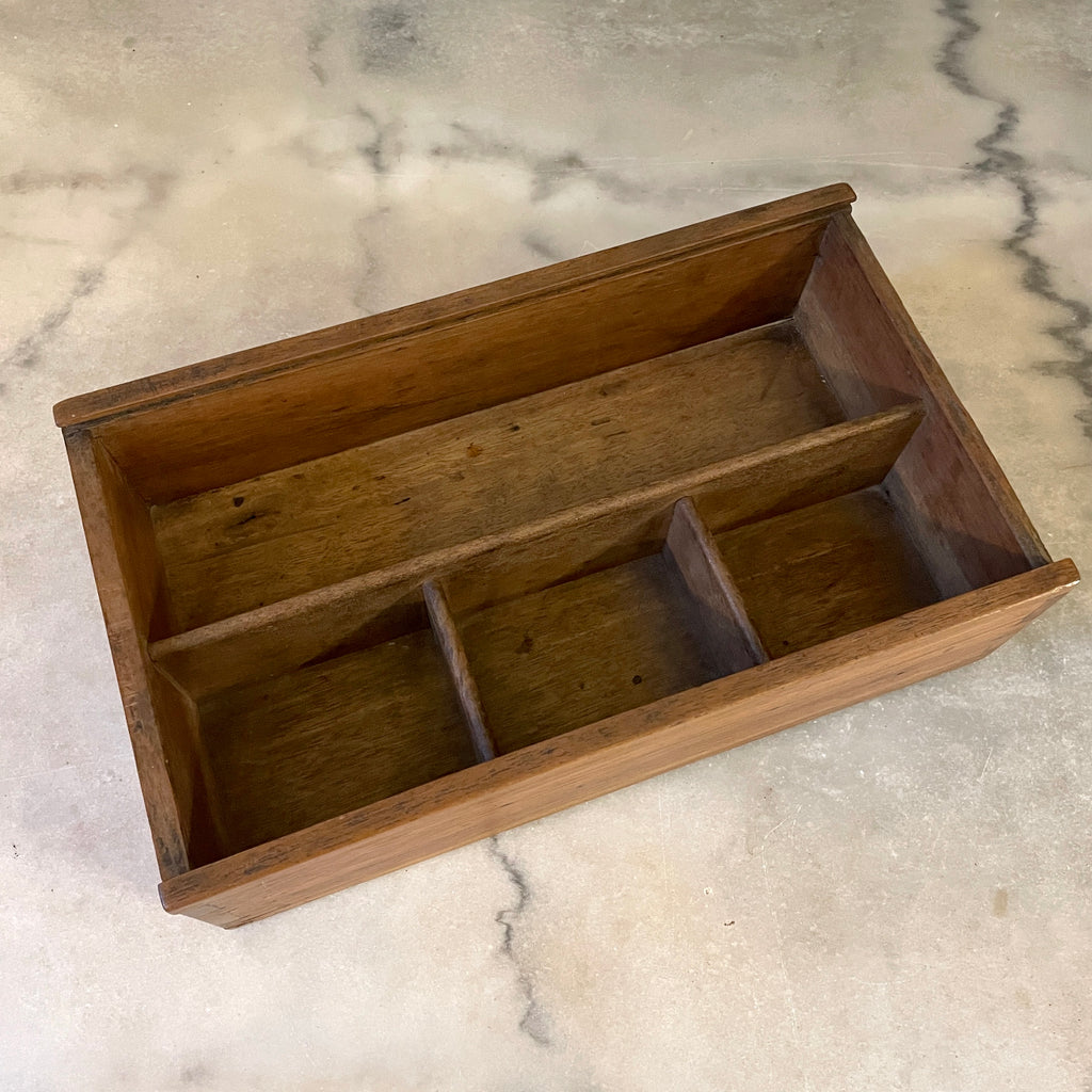 Ancien coffret de rangement en bois, couvercle coulissant avec petite encoche. 4 compartiments. Utilisée par l'ancien propriétaire comme boîte à cirage.