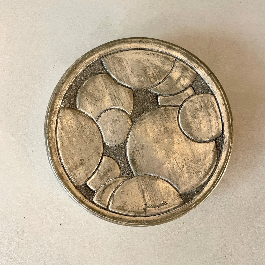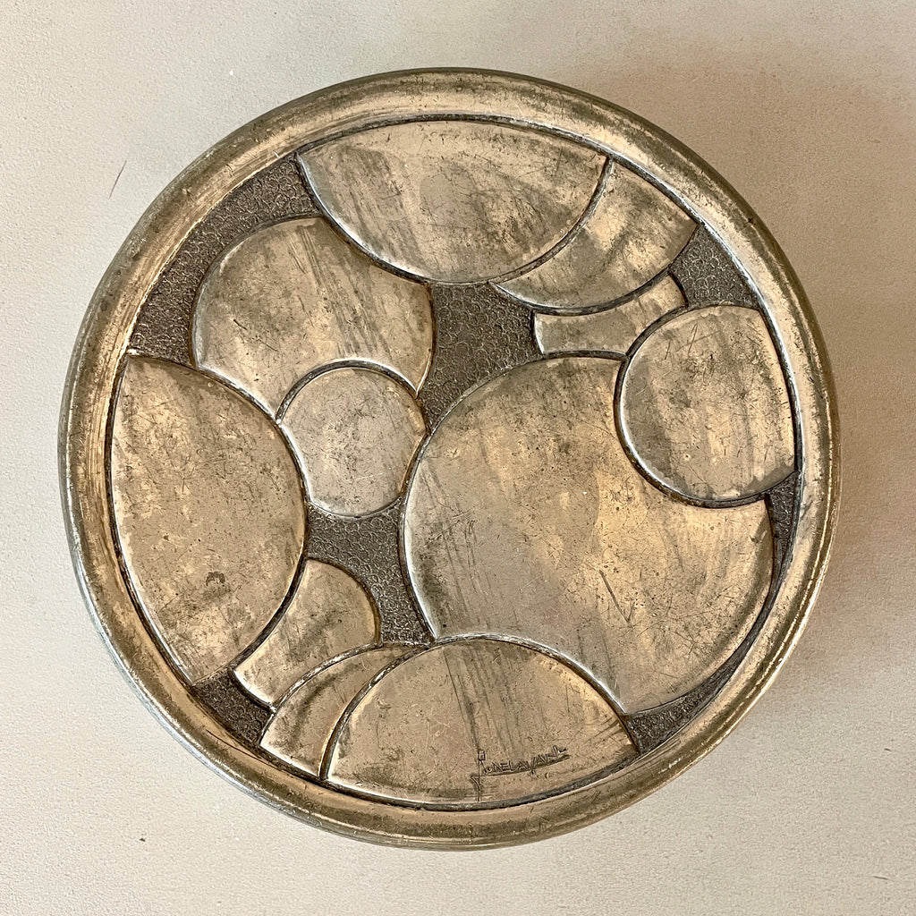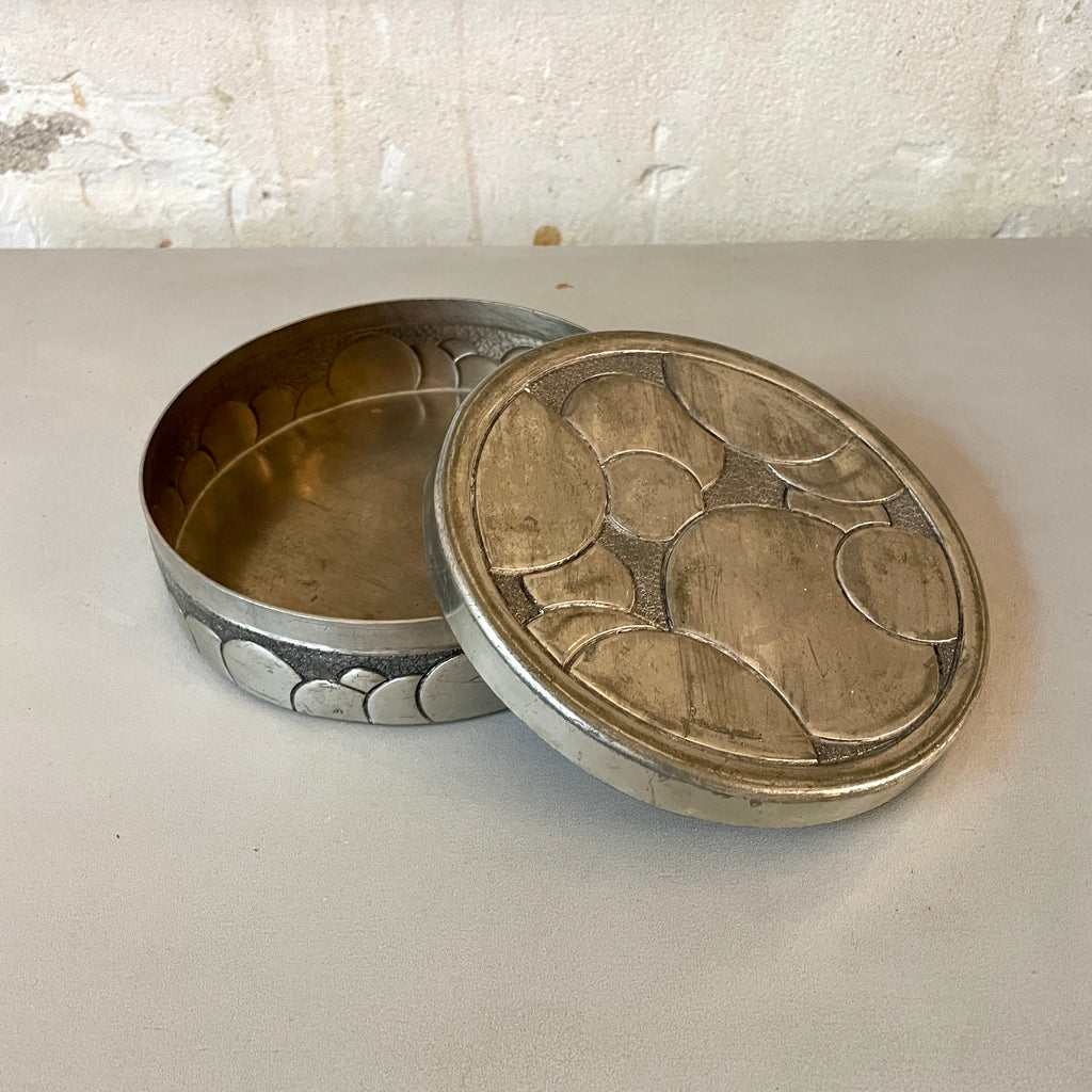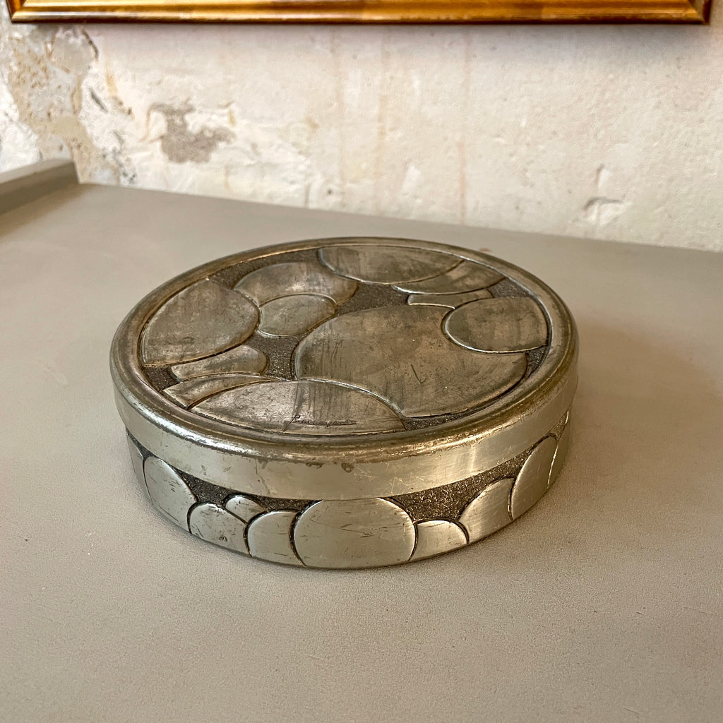 / Boîte ronde en étain repoussé signée René Delavan Art Déco