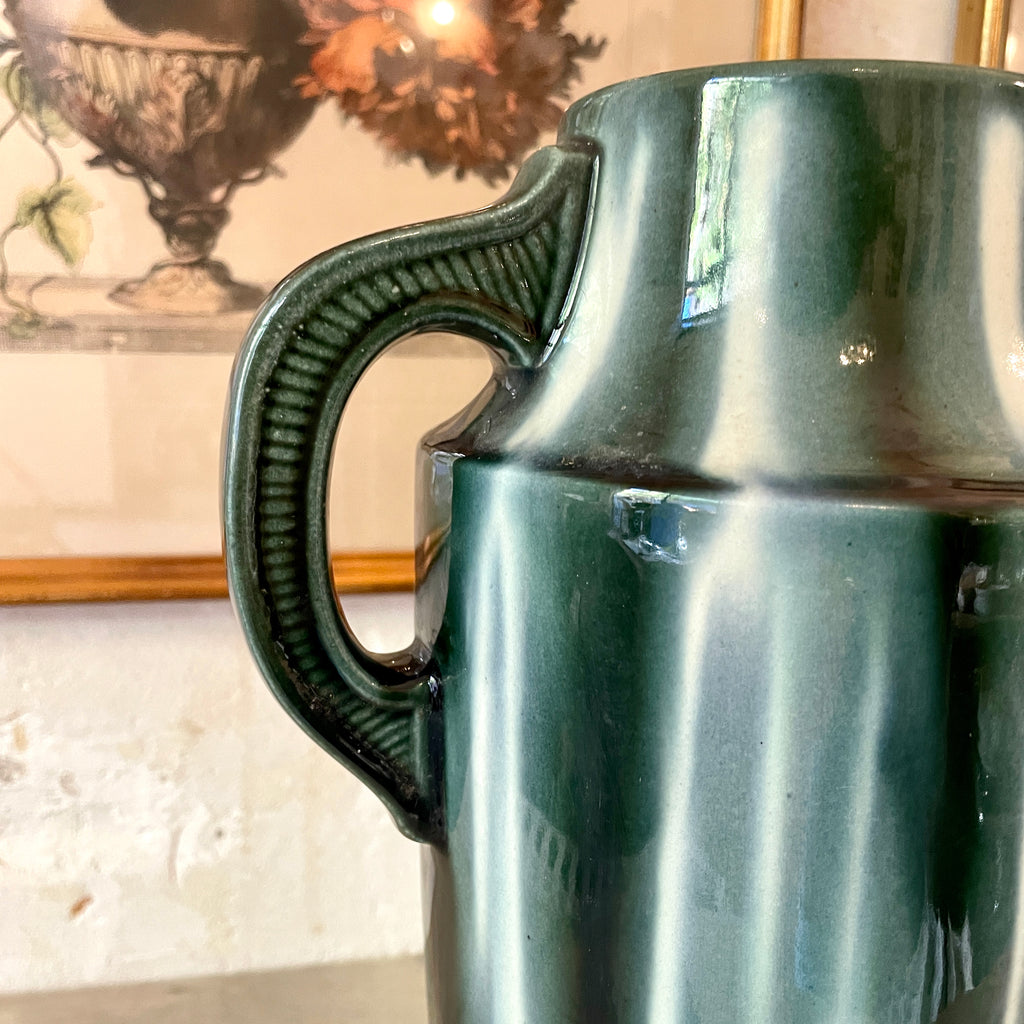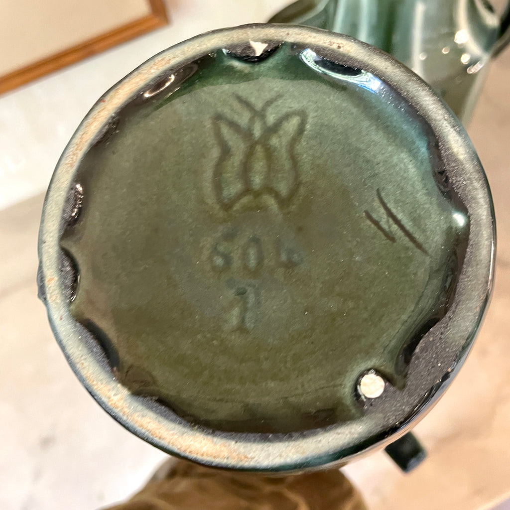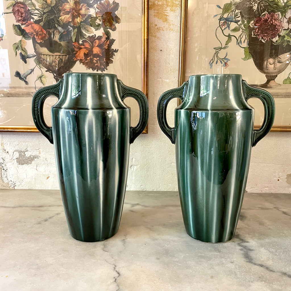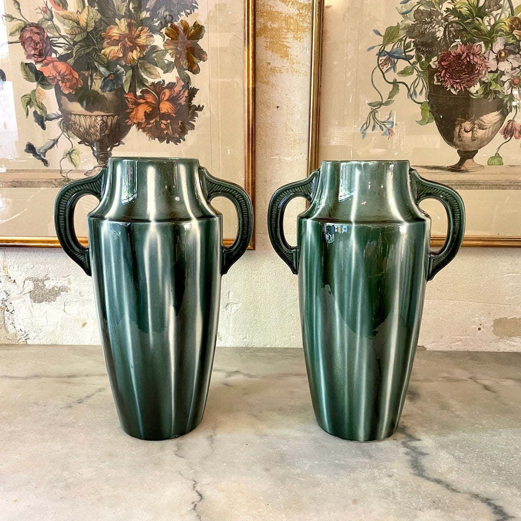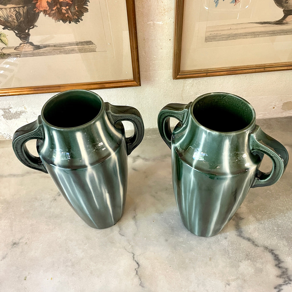Paire de vases à anses Art Déco en céramique émaillée dans des tons de vert de la fabrique de Vierzon dont le fondateur est Louis Gueule. Signés sur la base du papillon et numéroté 604.