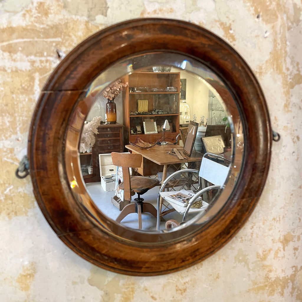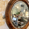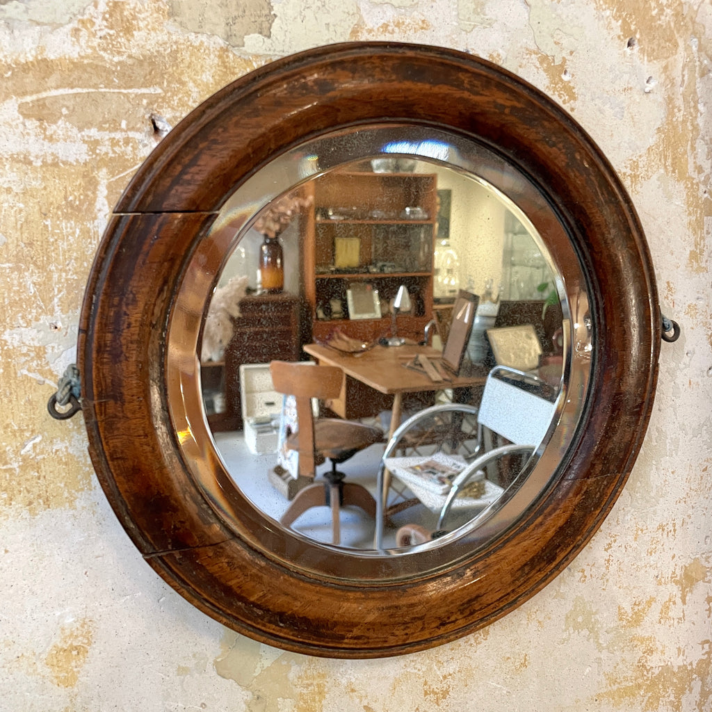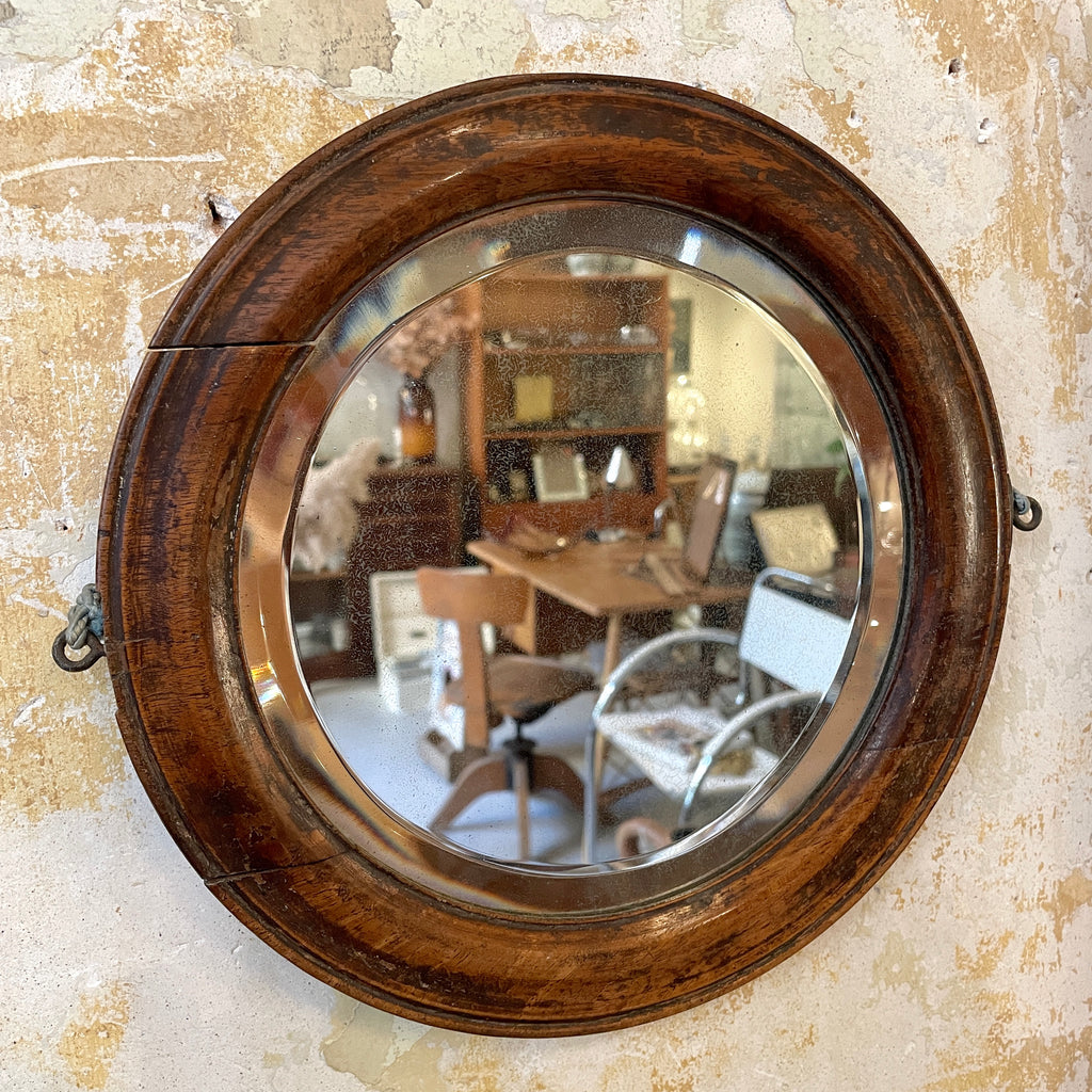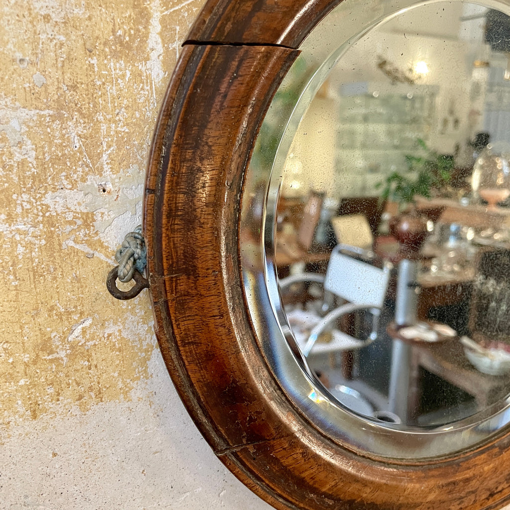 Ravissant petit miroir en bois mural avec cadre en bois et glace biseauté. Jolie patine.