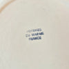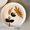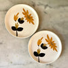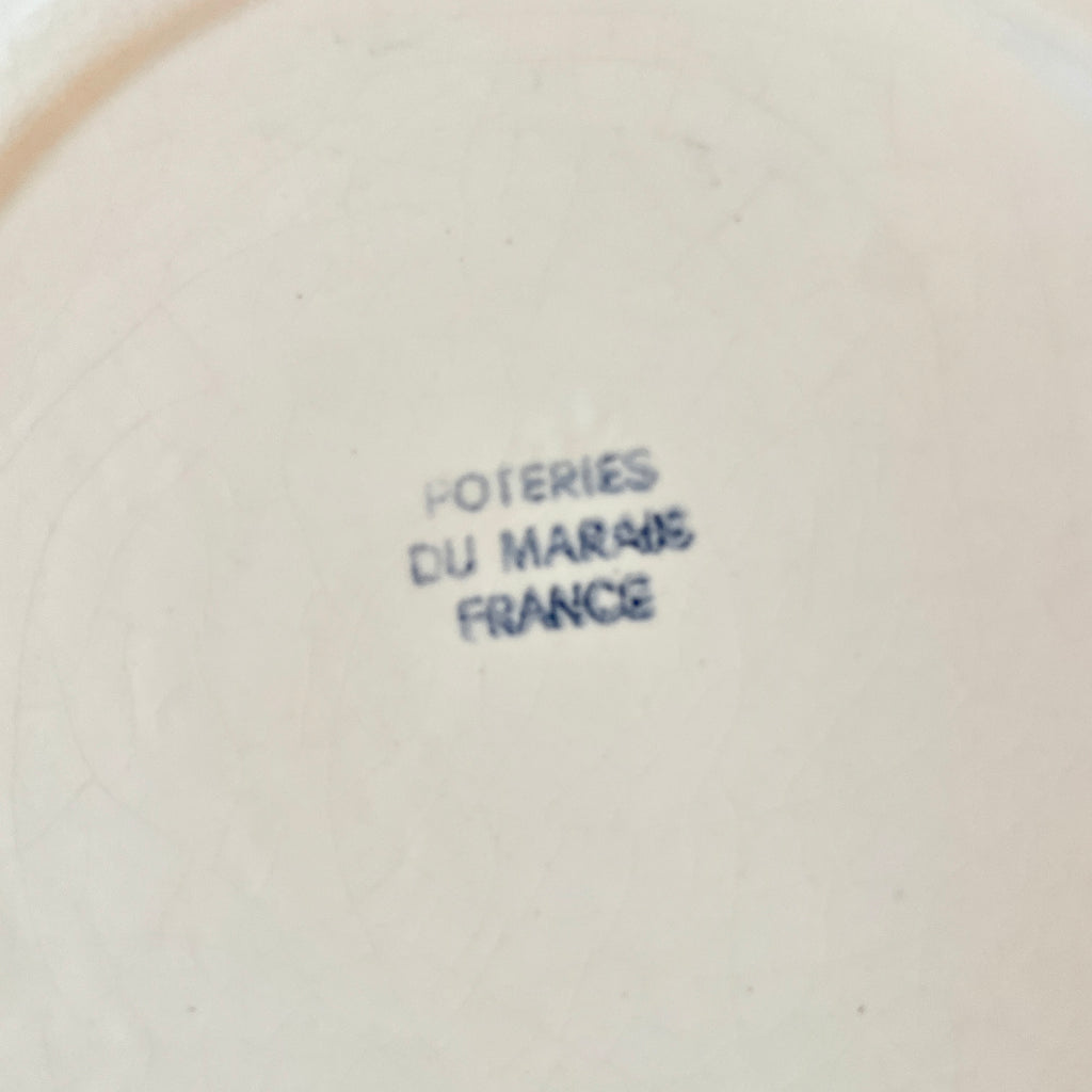 Duo d'assiettes plates estampillées Poteries du Marais, France. Décor de fleurs orange et marron sur fond crème.