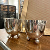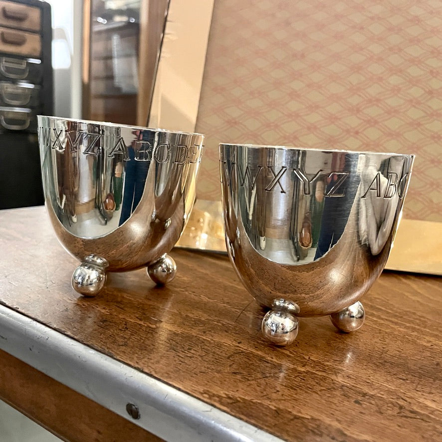 Duo de timbales ou gobelets en métal argenté sur trois petits pieds ronds, gravés de l'abécédaire, typographie Art Déco