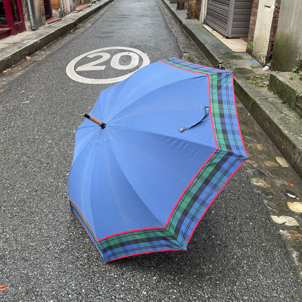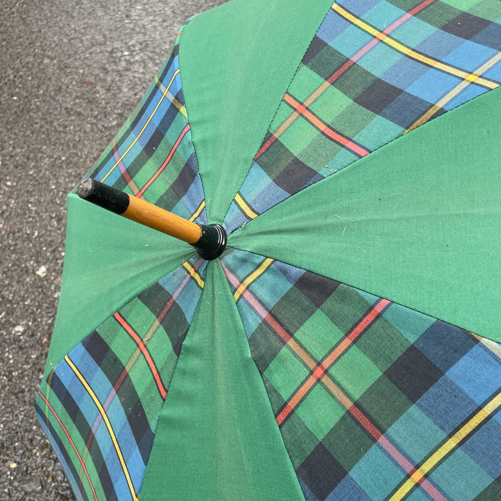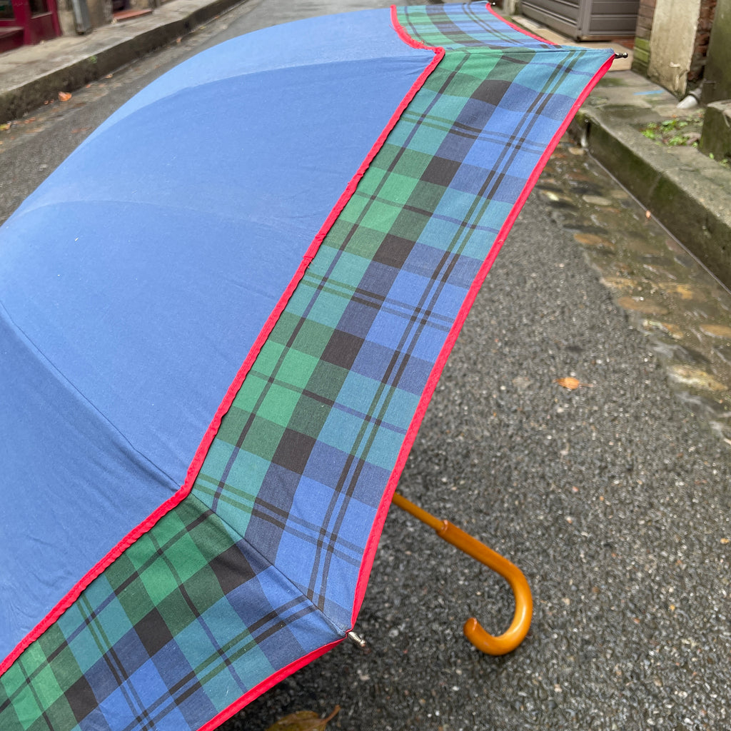 Parapluie vintage Cyrillus, l'un bleu, l'autre vert et carreaux.