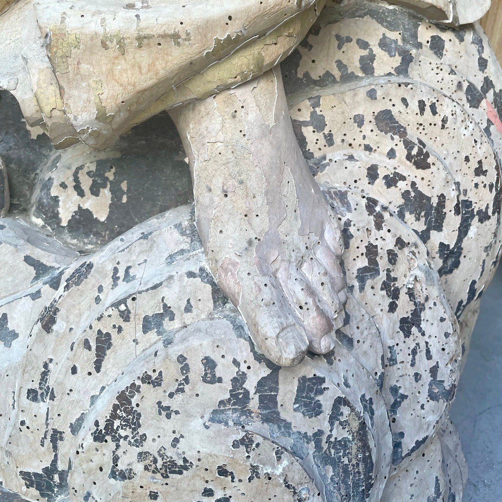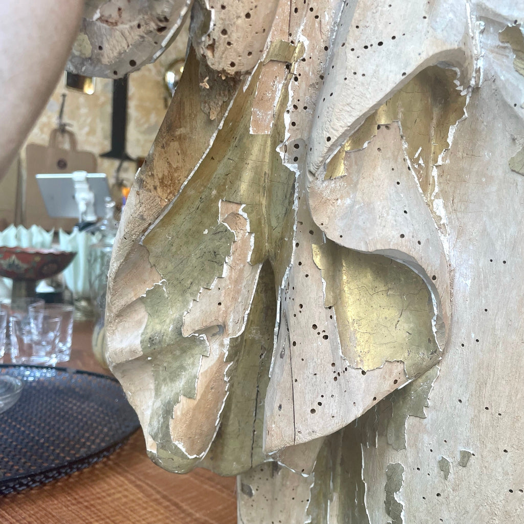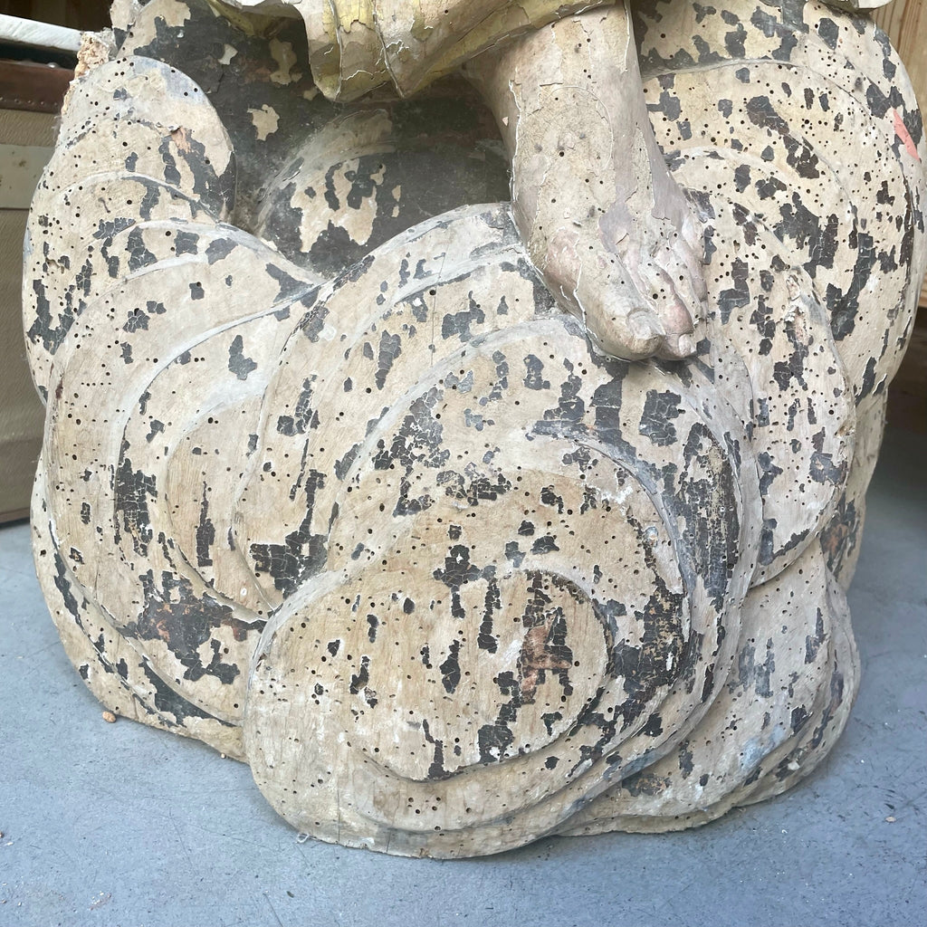Majestueuse par sa taille, elle est en position debout les bas et mains écartés, il reste des traces de dorure et polychrome notamment sur le visage, le drapé ainsi que la base en forme de nuage.