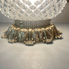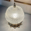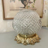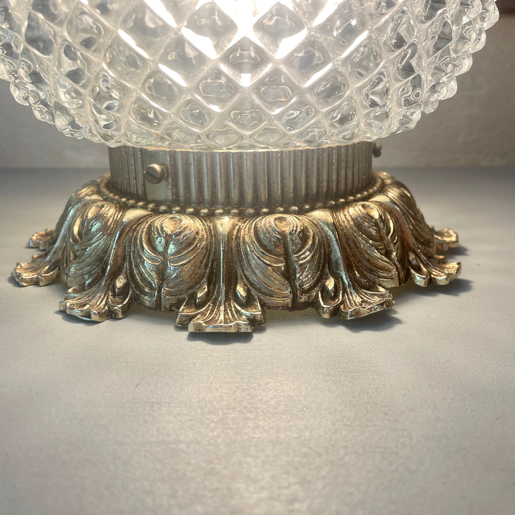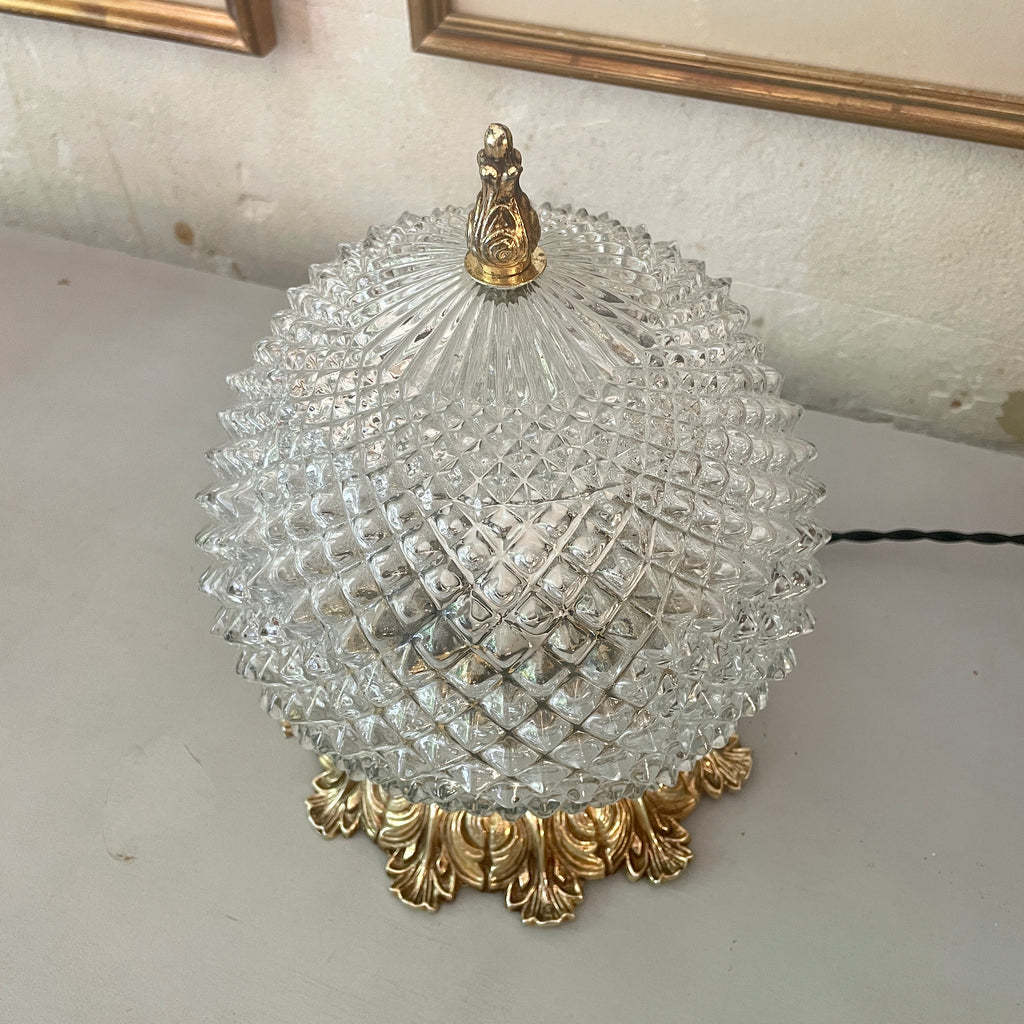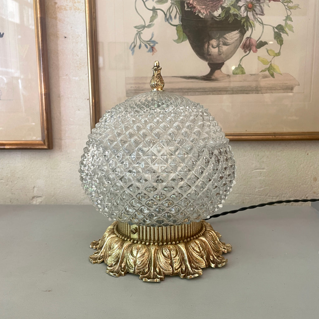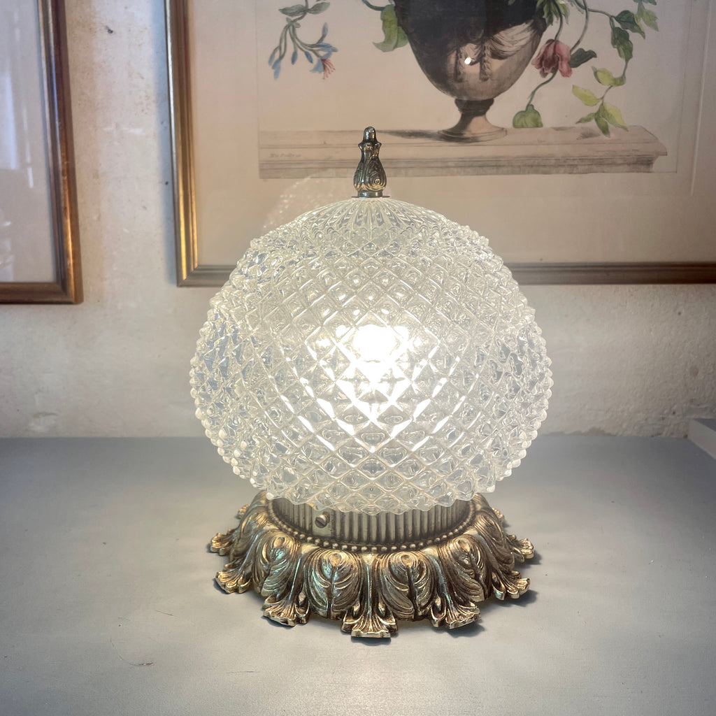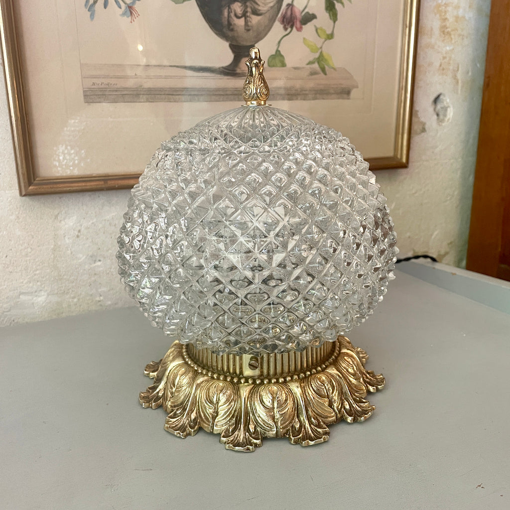 Jolie lampe à poser en bronze et globe arrondie en pointe de diamants qui diffuse une belle lumière.