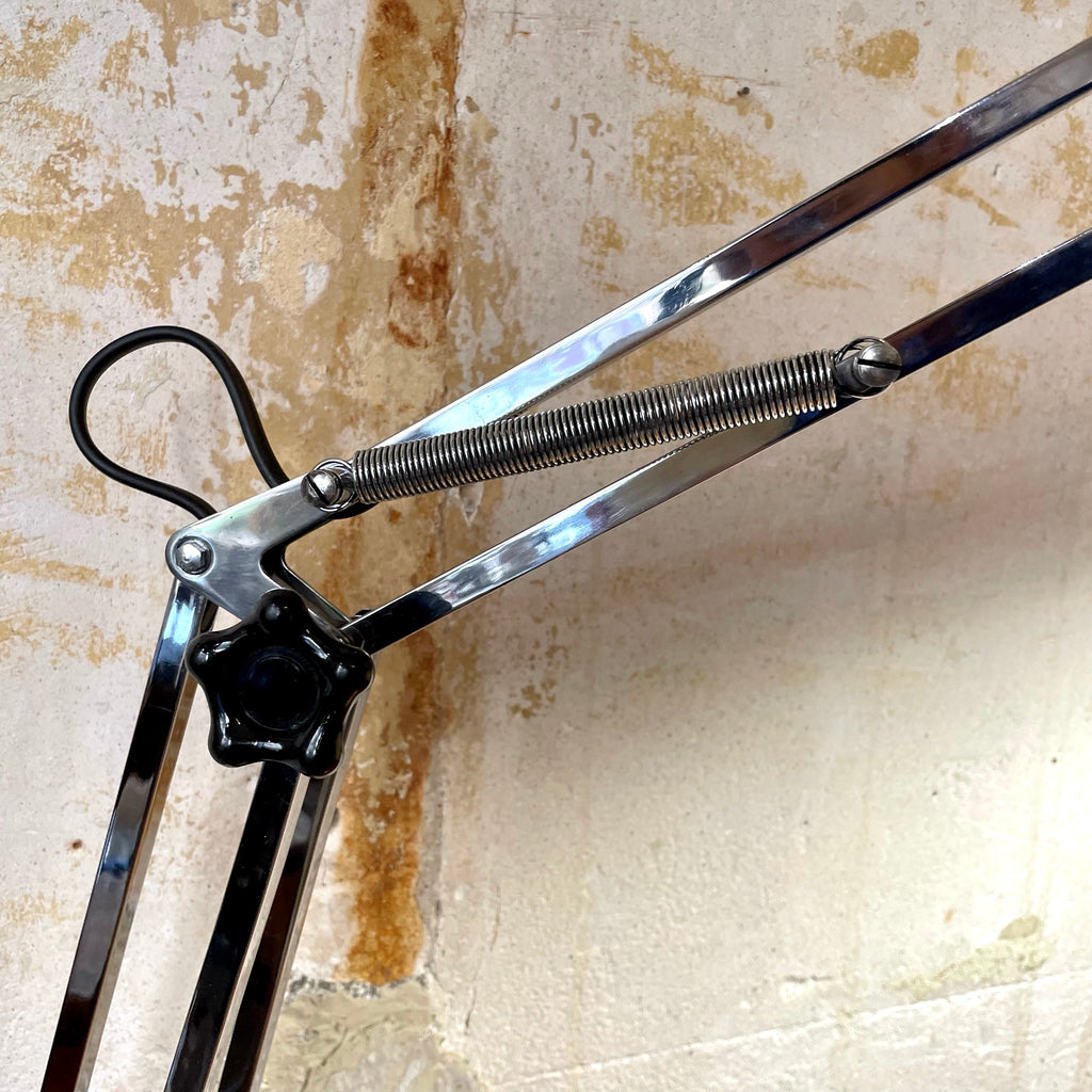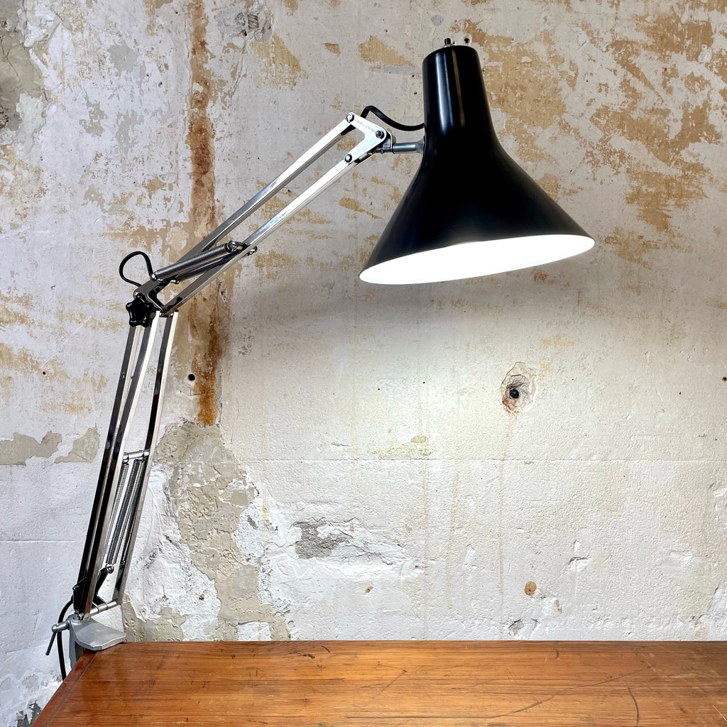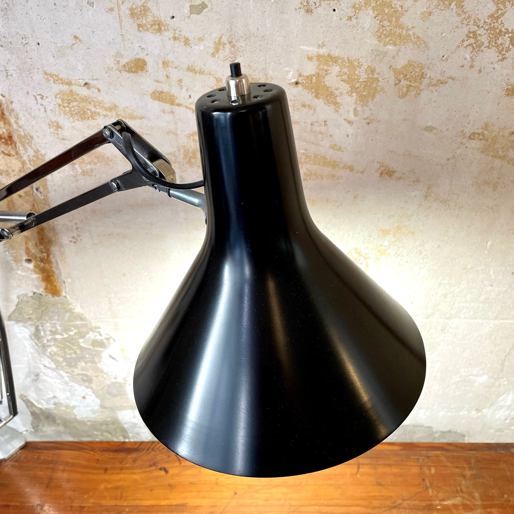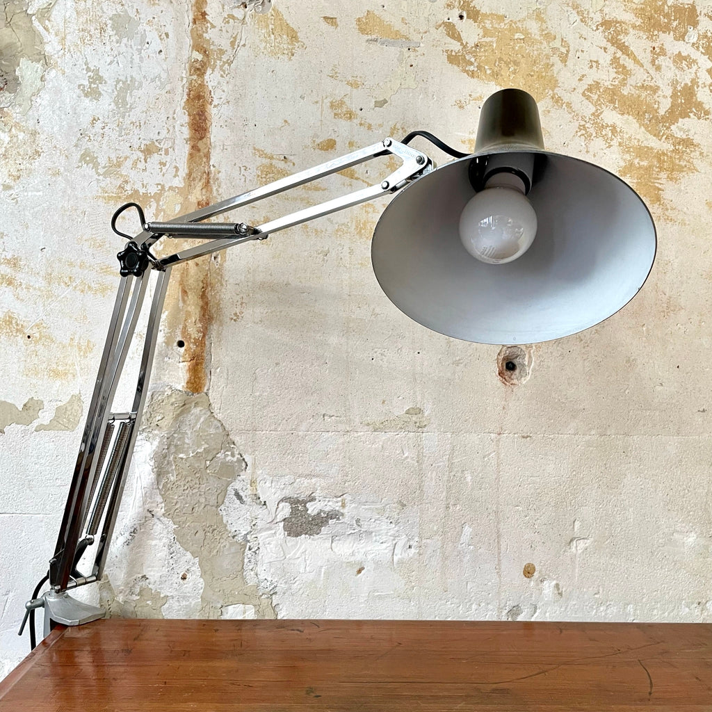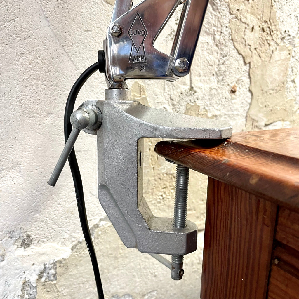 Lampe des années 50 de la marque LUXO du designer norvégien Jacob Jacobsen, modèle L-2 dite d'atelier ou d'architecte, elle est à fixer à l'aide d'un étau non d'origine.