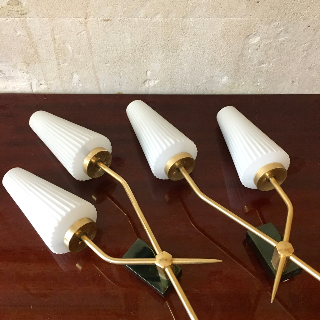 Deux appliques avec deux feux chacune. Les cônes striés en opaline diffusent la lumière de manière uniforme. Le support est en laiton.