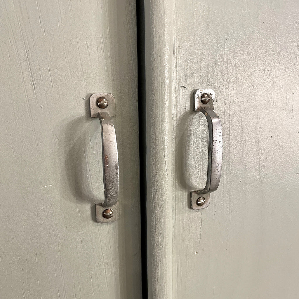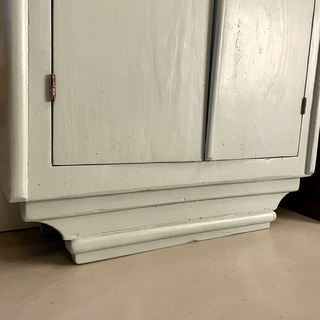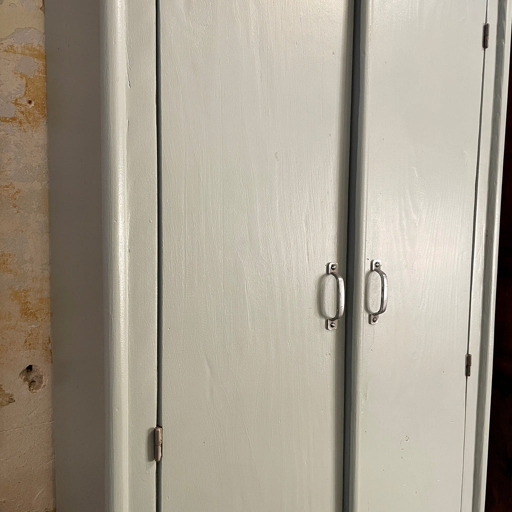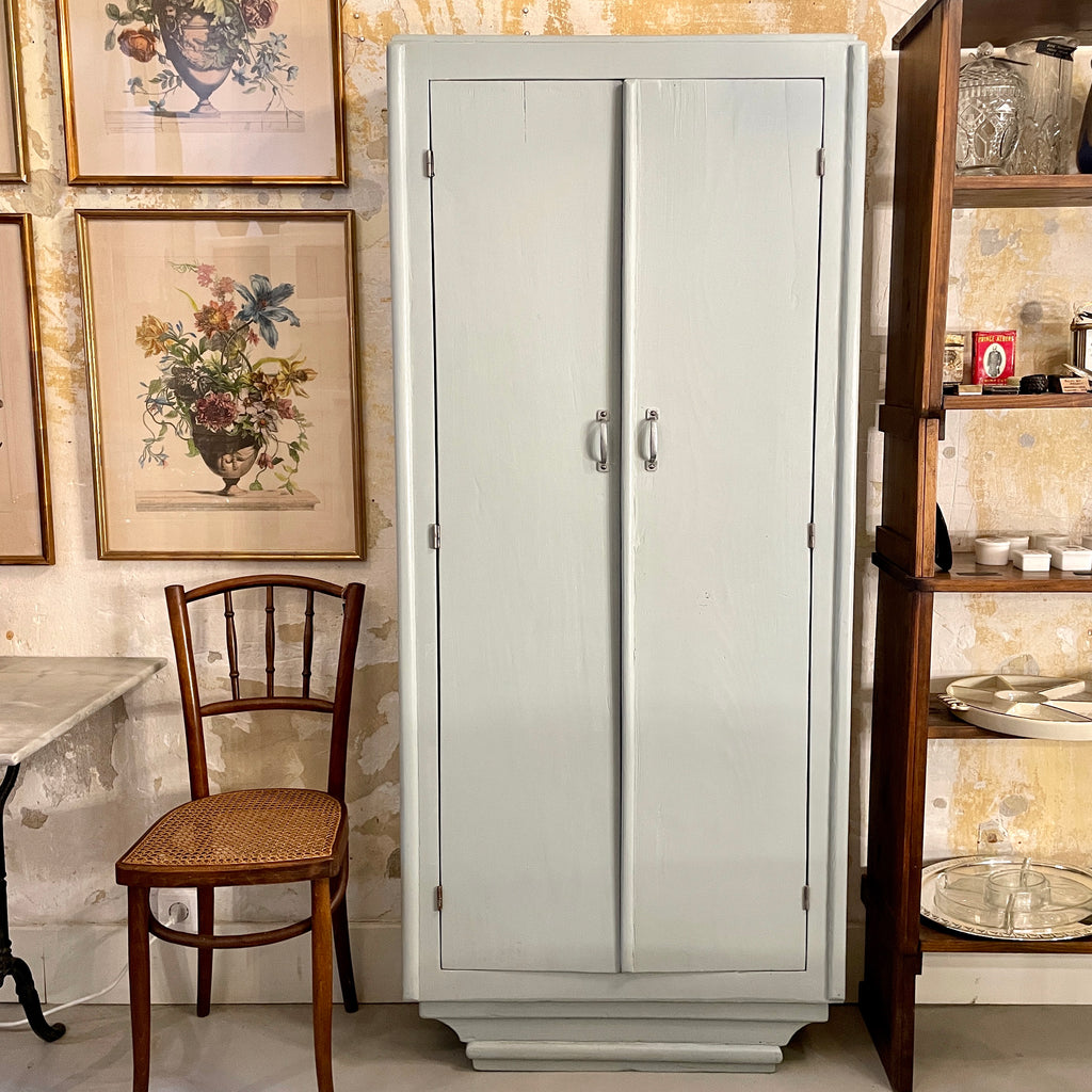 Petite armoire rare par ses dimensions, étroite et peu profonde elle est toute mignonne avec son piètement central Art Déco. Elle a été entièrement décapée, traitée et repeinte en un doux vert pâle. Elle garde malgré tous quelques traces de son vécu ce qui apporte beaucoup de charme.