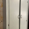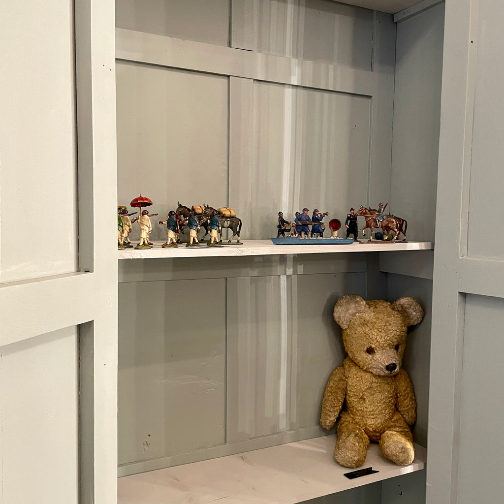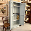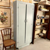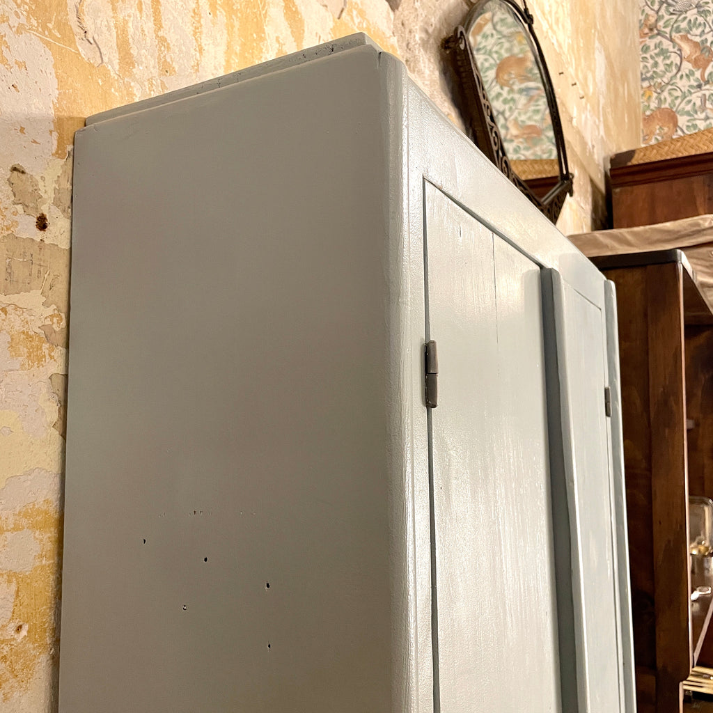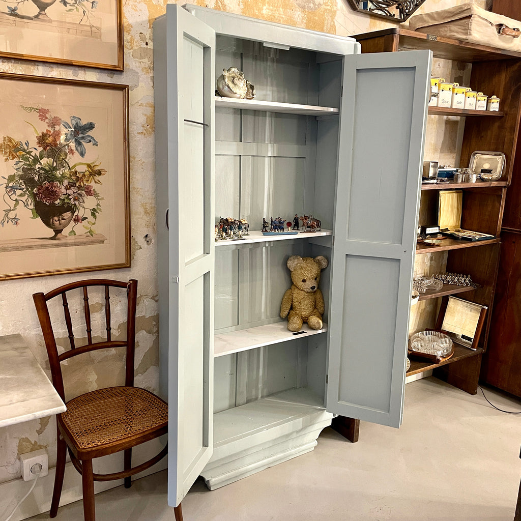 Petite armoire rare par ses dimensions, étroite et peu profonde elle est toute mignonne avec son piètement central Art Déco. Elle a été entièrement décapée, traitée et repeinte en un doux vert pâle. Elle garde malgré tous quelques traces de son vécu ce qui apporte beaucoup de charme.