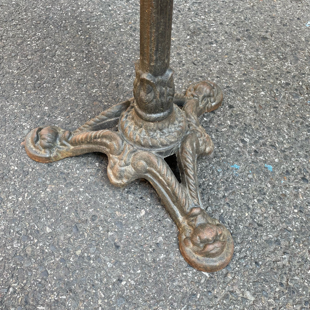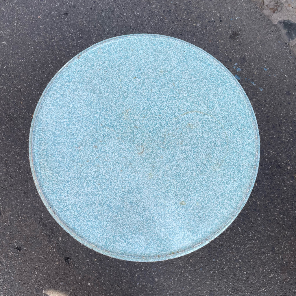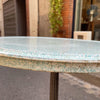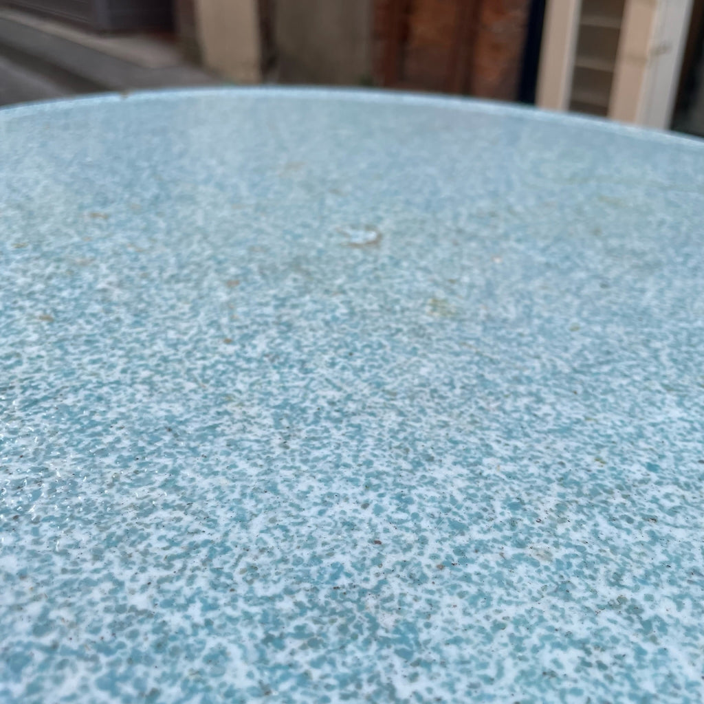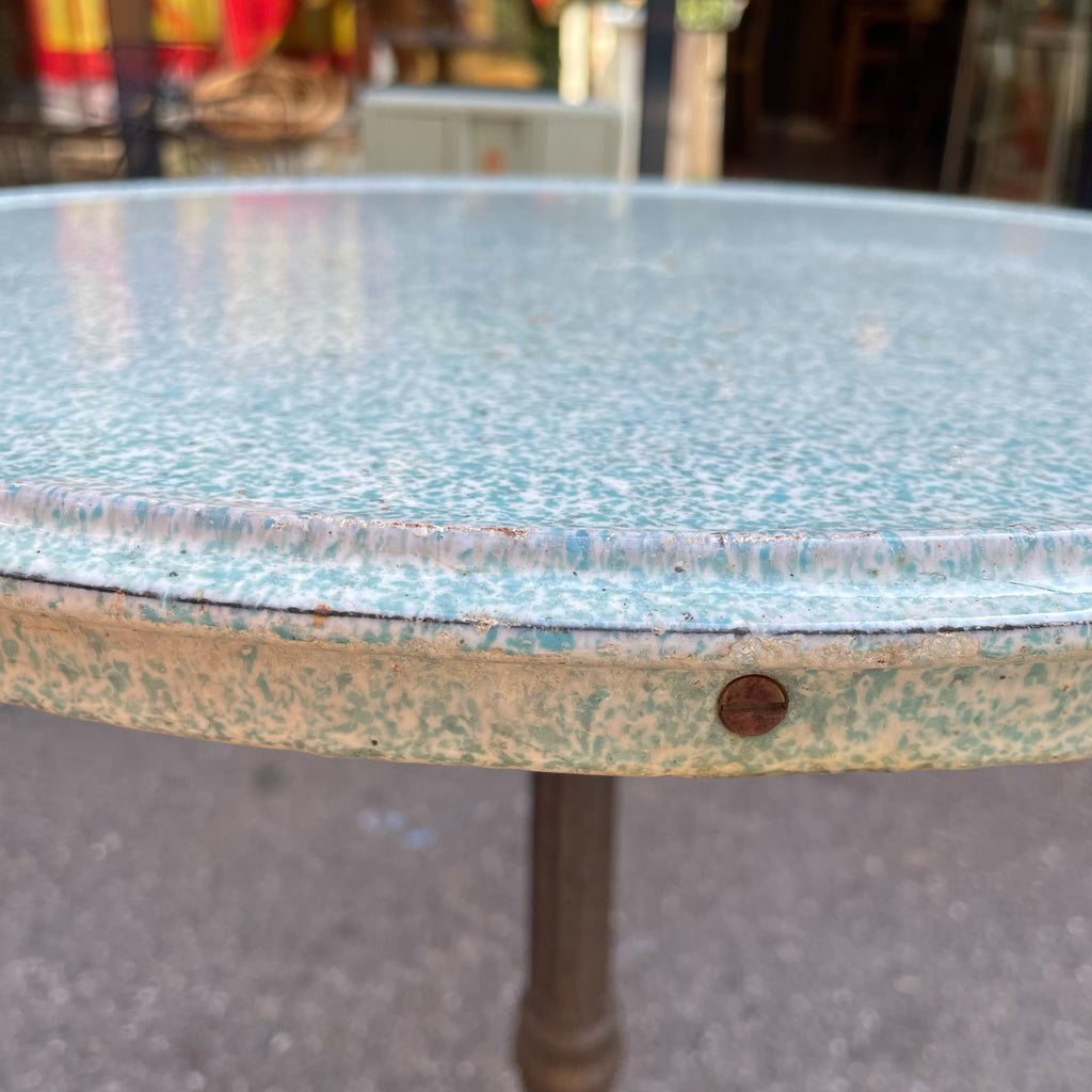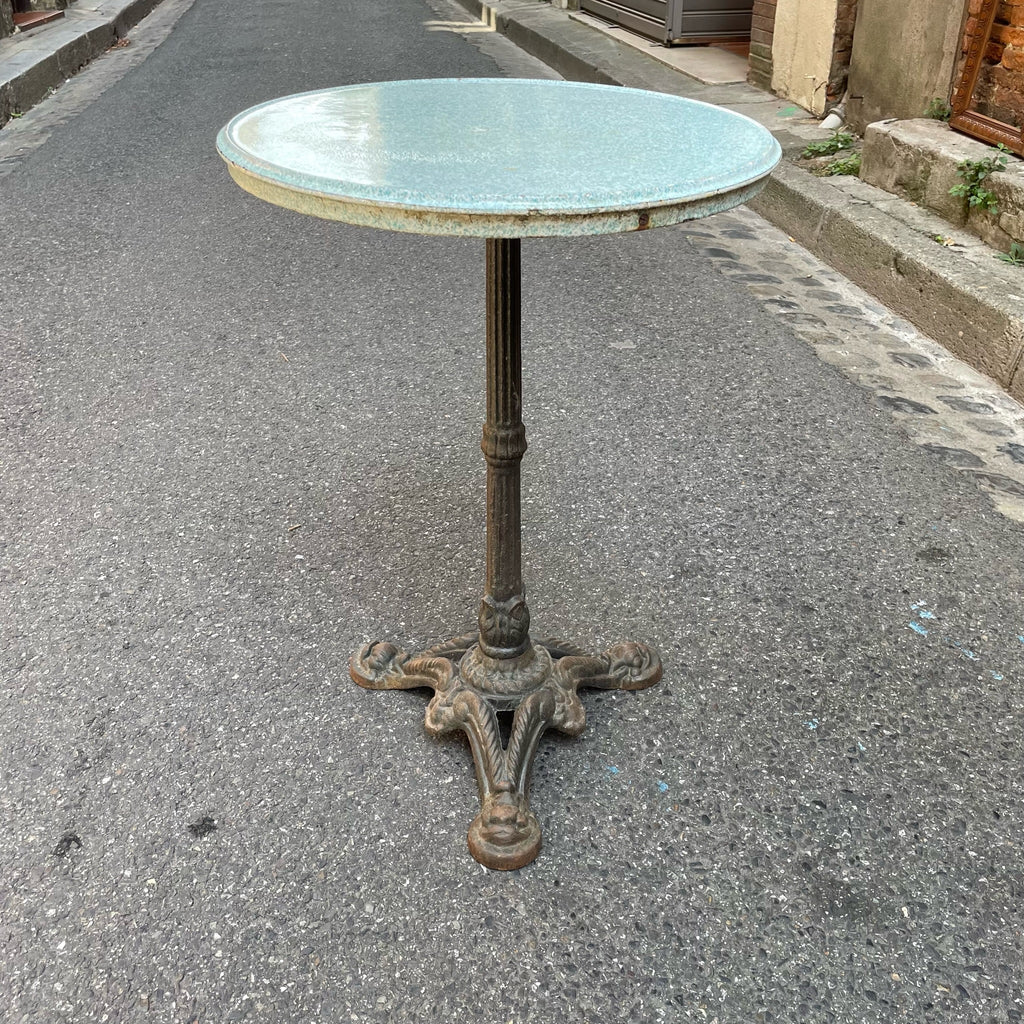 Table de bistrot ancienne avec son pied tripode en fonte et le plateau en tôle émaillée et non en marbre comme cela se trouve le plus fréquemment. Très jolie couleur vert d'eau chinée. Conviendra parfaitement en intérieur ou en extérieur.