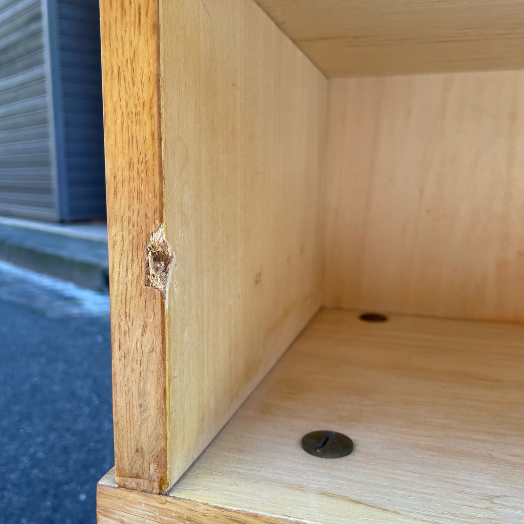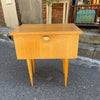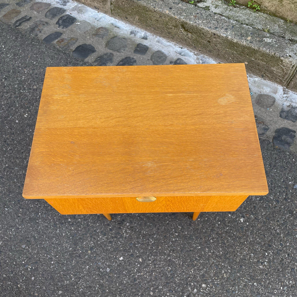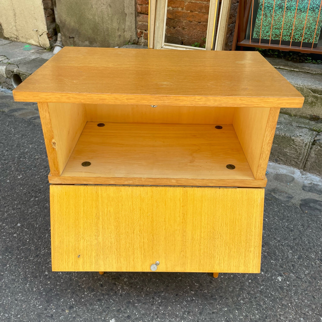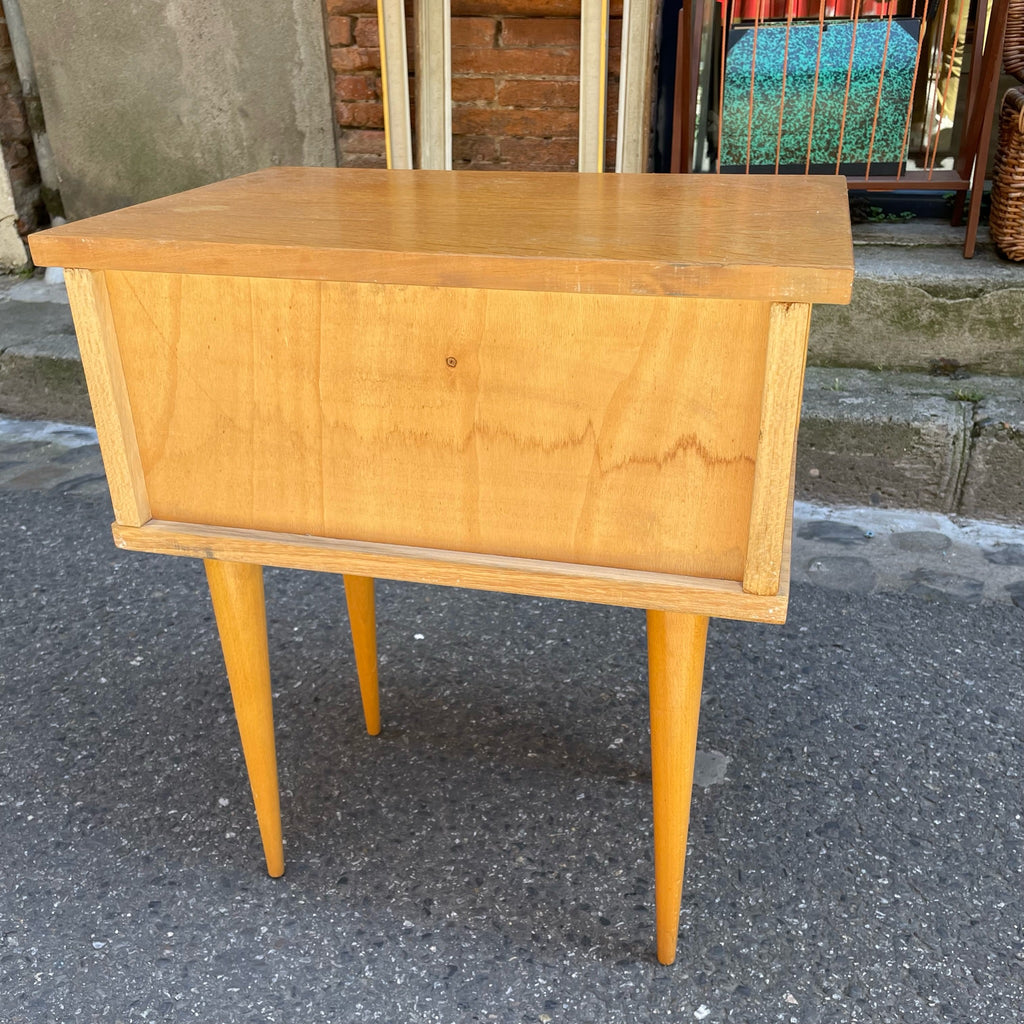 Table de chevet en vois blond avec une porte à battant. Pieds fuseaux.