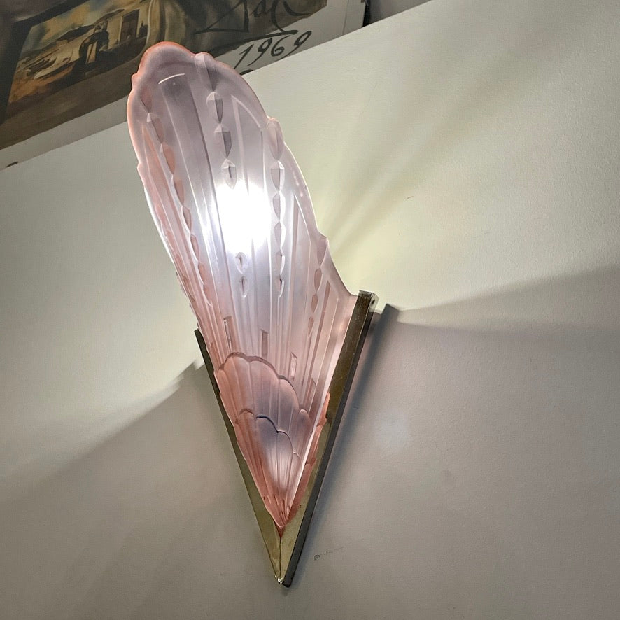 Grande applique en pâte de verre époque Art Déco, caractérisée par ses reflets rose-violet subtils qui diffusent une lumière douce et enveloppante. Le socle chromé apporte une finition épurée et intemporelle, typique de l'esthétique Art Déco.