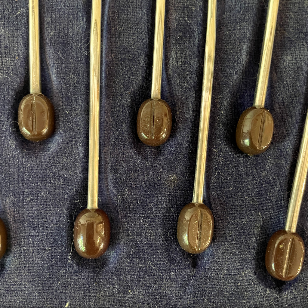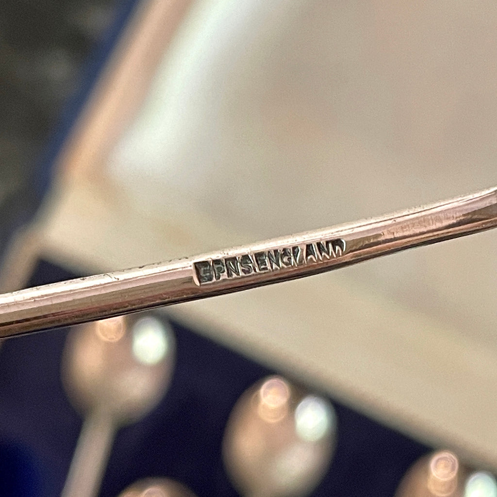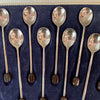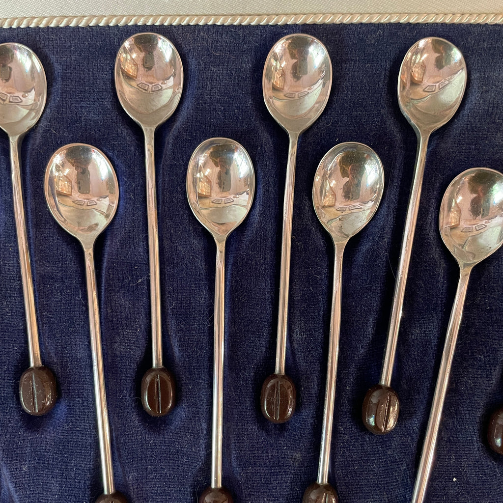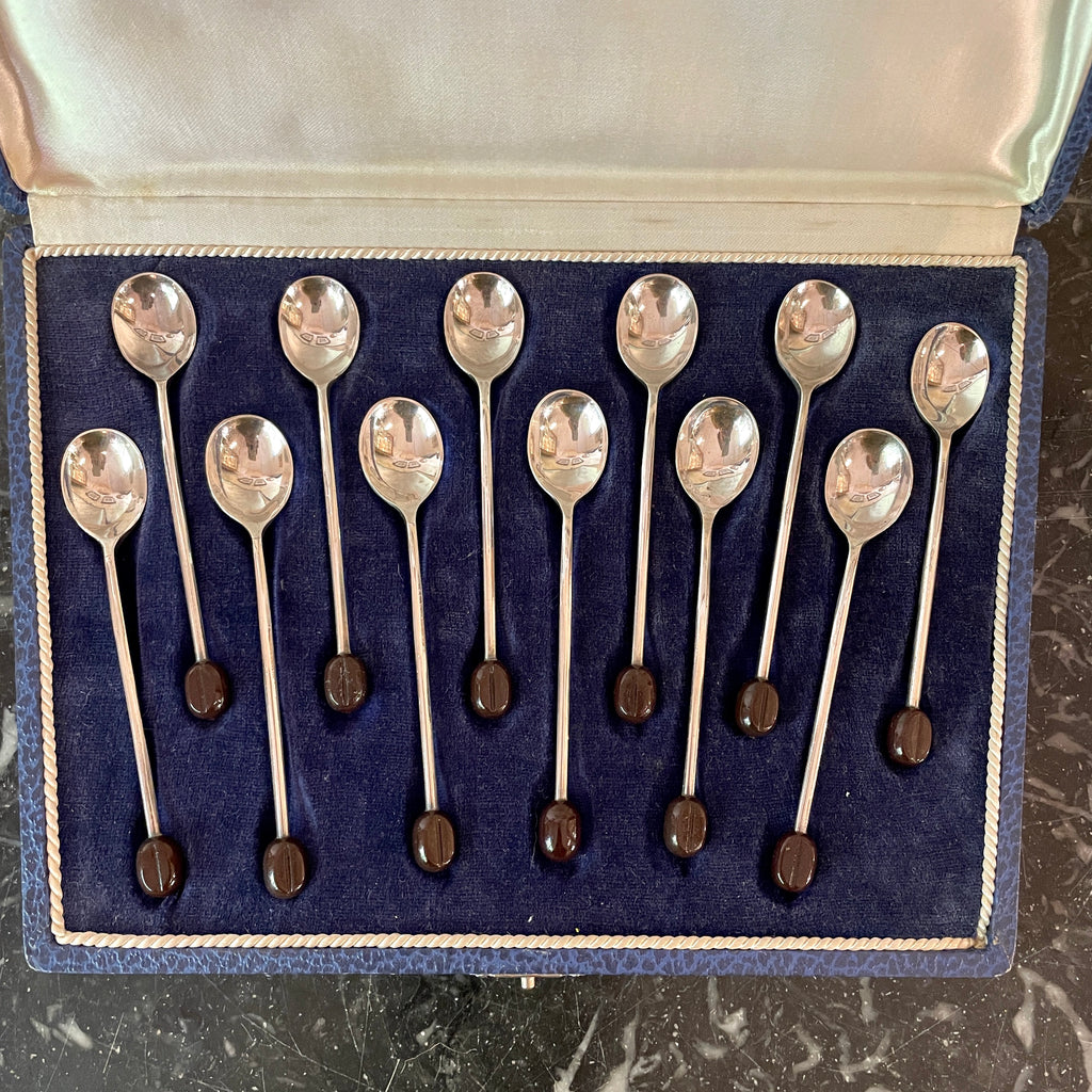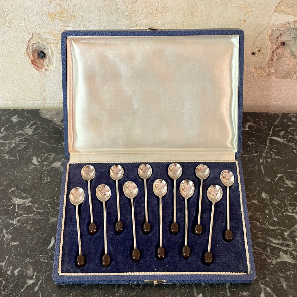 / Coffret de 12 cuillères à moka en métal argenté, Angleterre