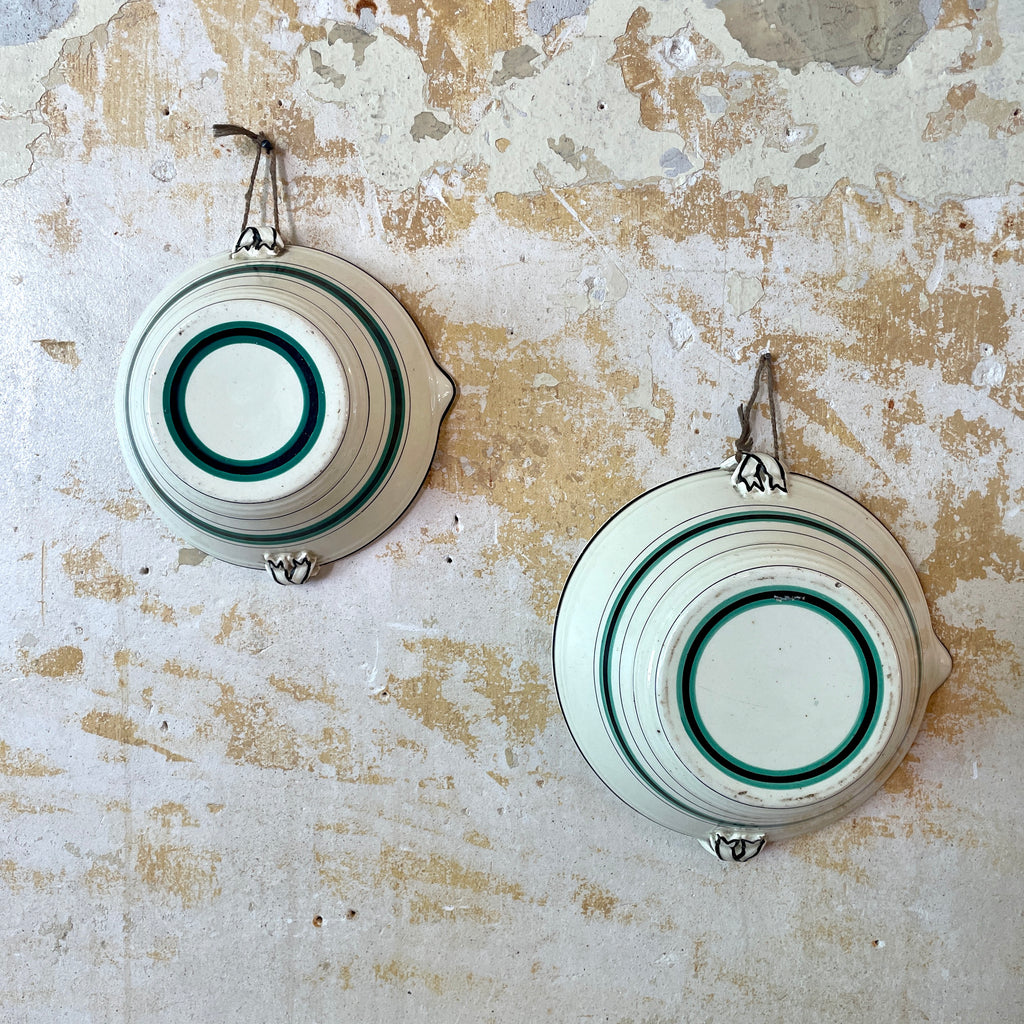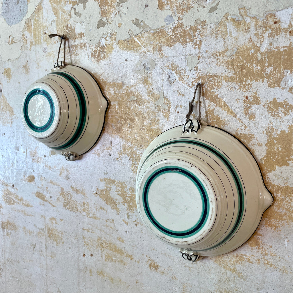 Ensemble de 2 grands bols ou saladiers avec 2 petites anses en faïence ancienne décoré sur l'extérieur. Ce duo était suspendu au mur chez leur ancien propriétaire.