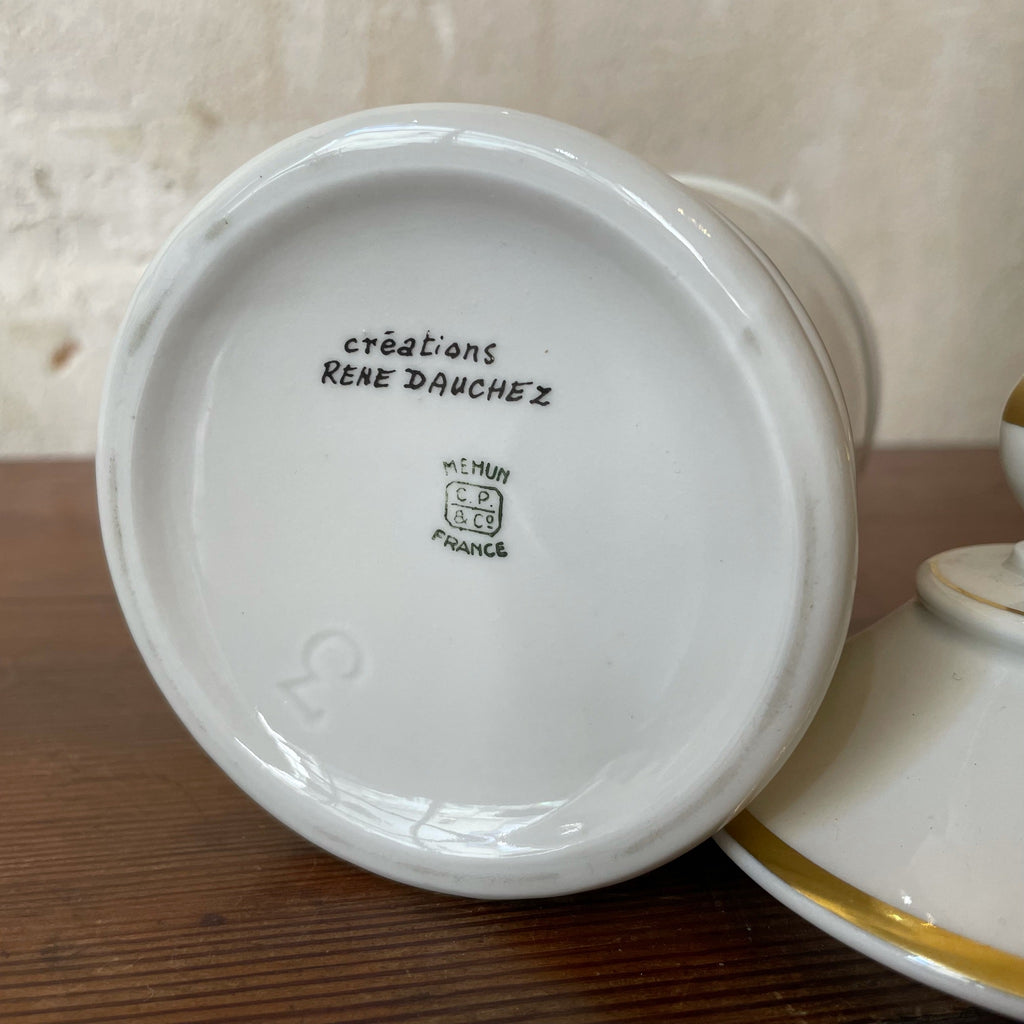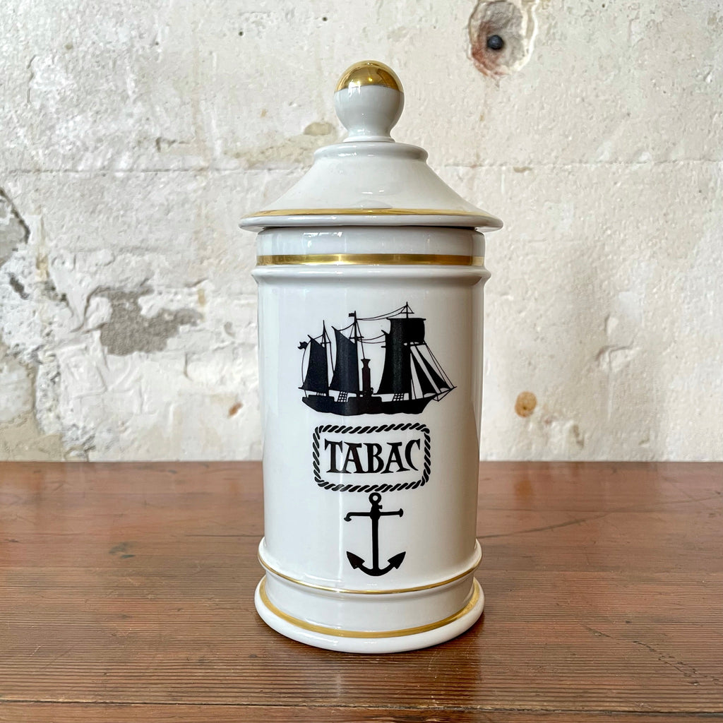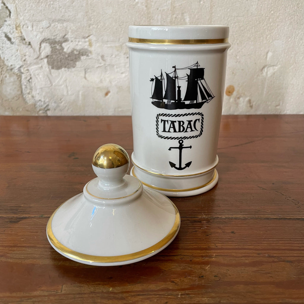 Ancien pot à Tabac en porcelaine blanche avec dorure décor ancre et voilier. Créations René Dauchez