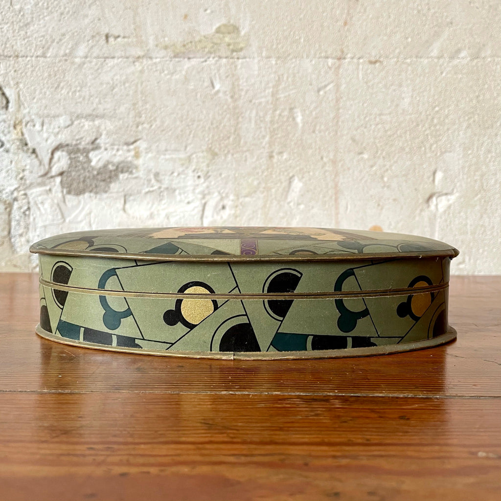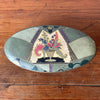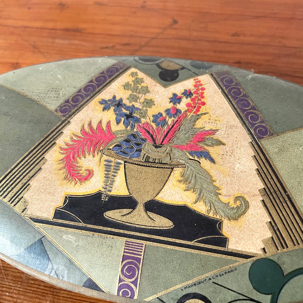 Dans les tons de vert, elle est ornée sur le couvercle d'un décor polychrome de bouquet de fleurs dans un vase médicis.
