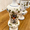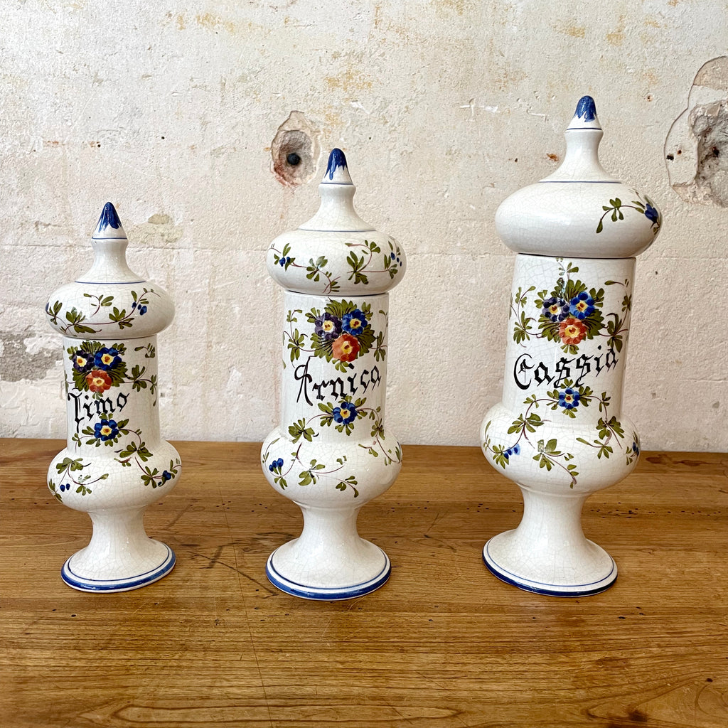 Série de 3 pots d'apothicaire en faïence peinte à la main : Limo, Cassia et arnica. Décor de fleurs bleues orange et violette et feuillage vert. Liseré et boutons bleus. Signés VG A, VG B et VG C
