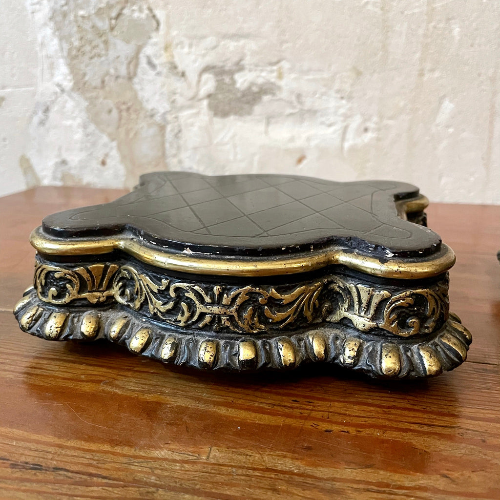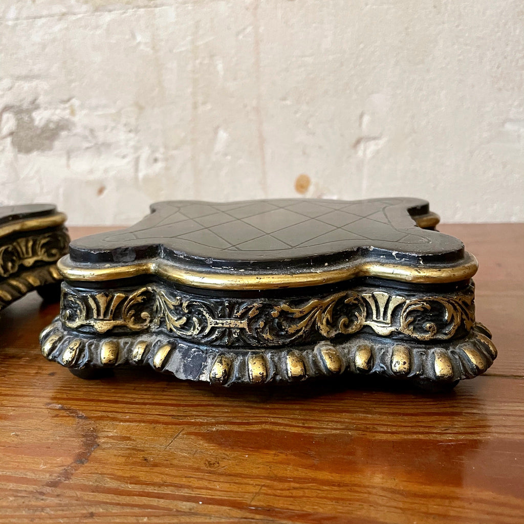 Deux socles identiques bois noirci et doré sur 4 petits pieds. Un petit accident sur l'un deux sur le devant (voir photo)