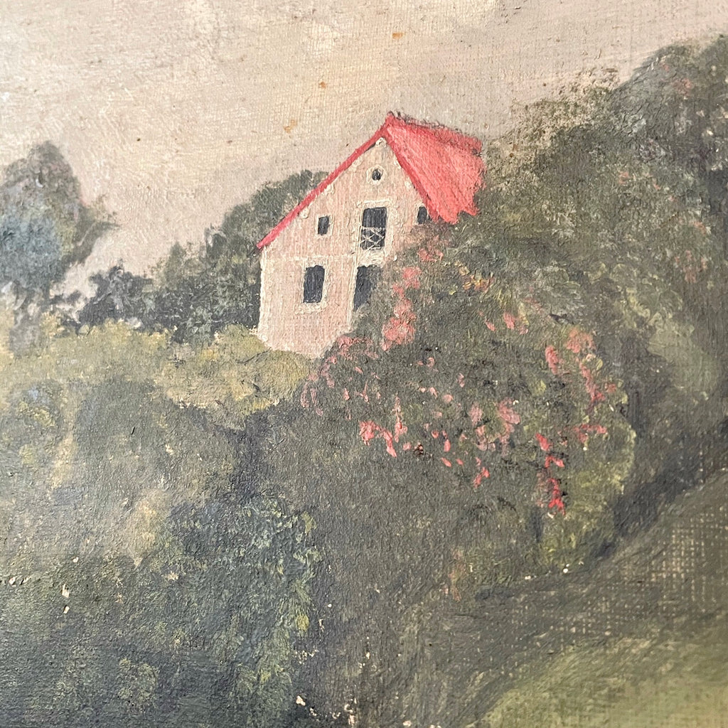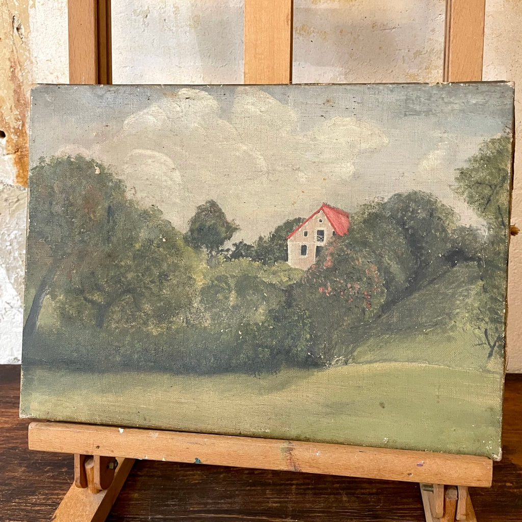 Huile sur toile représentant un paysage avec une maison derrière un bosquet. Pas de signature. Vers 1930