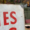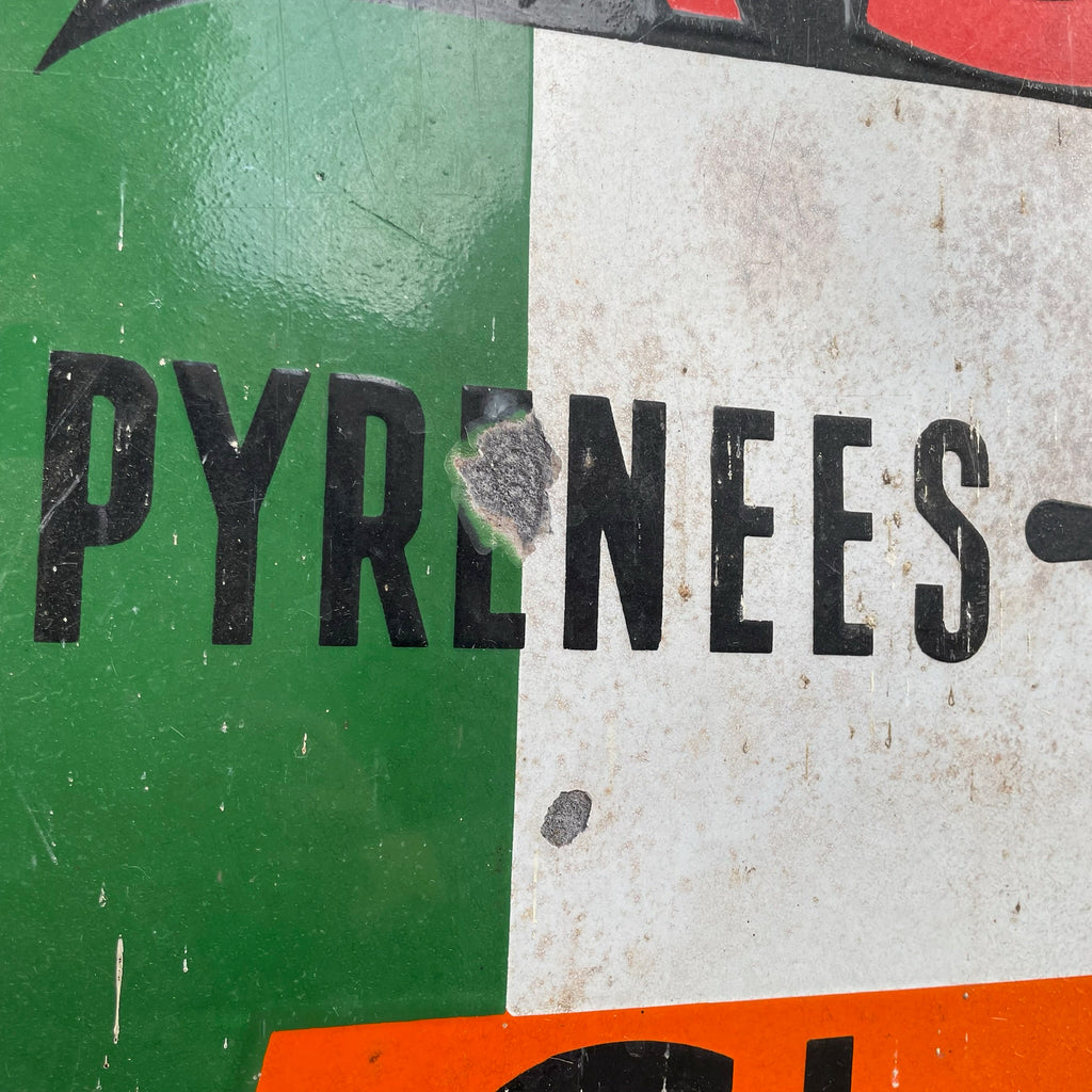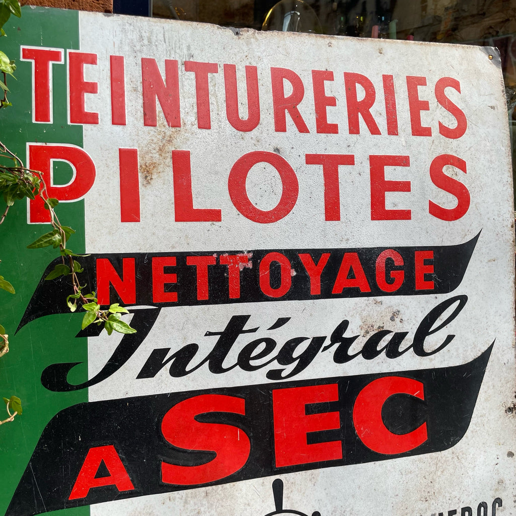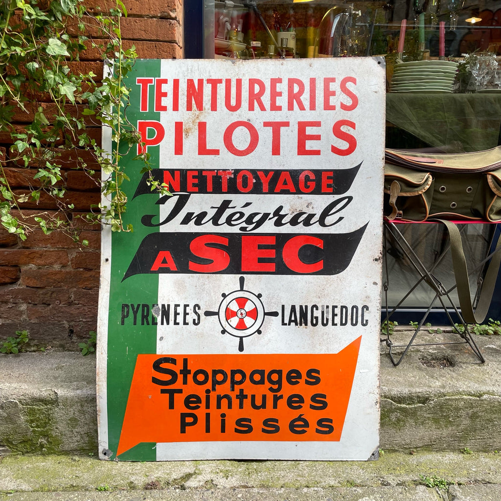 Grande plaque émaillée publicitaire pour les teintureries pilote. Lettrage en pochoir noir et rouge sur fond blanc, vert, noir et orange. Années 50 environ.