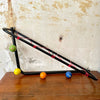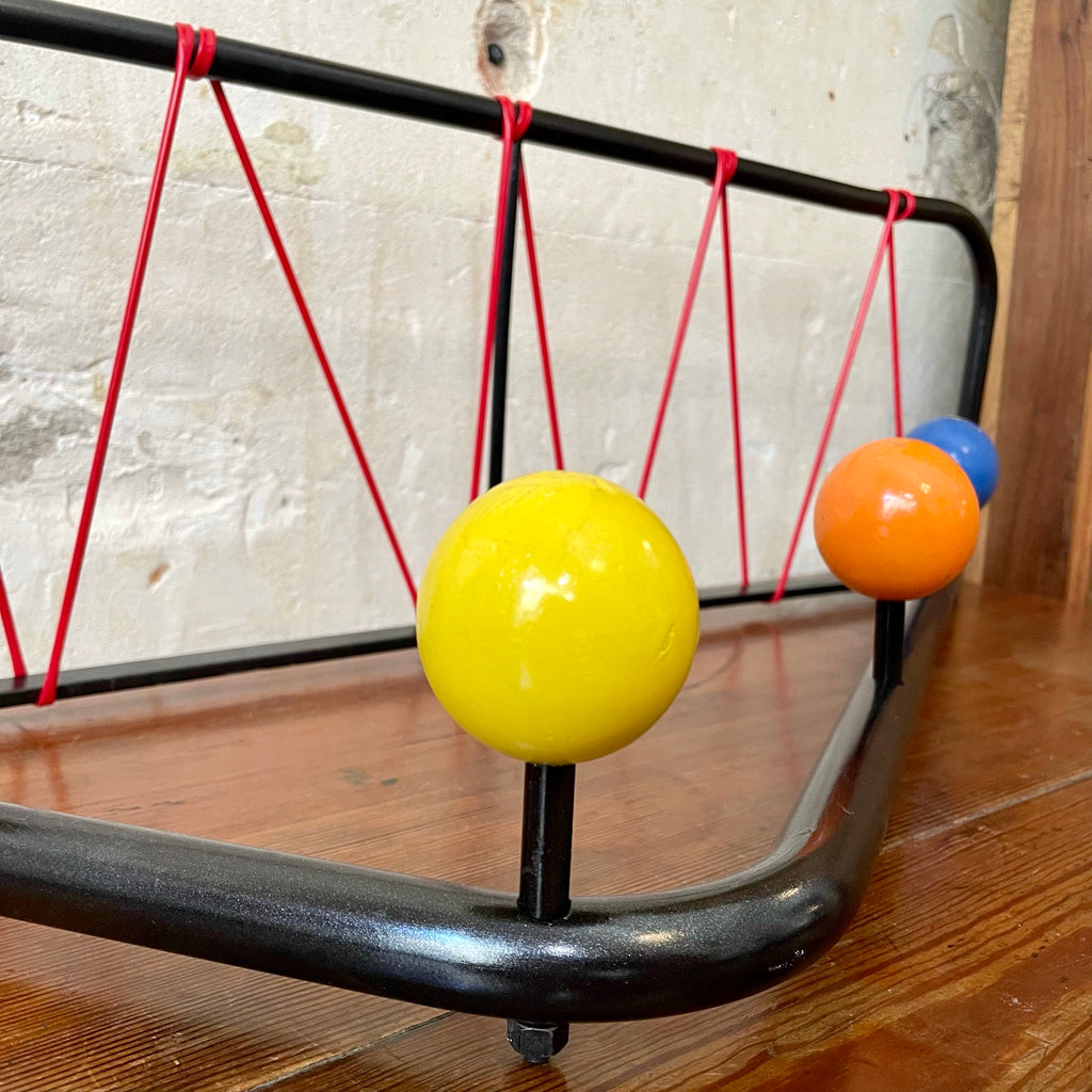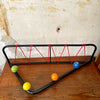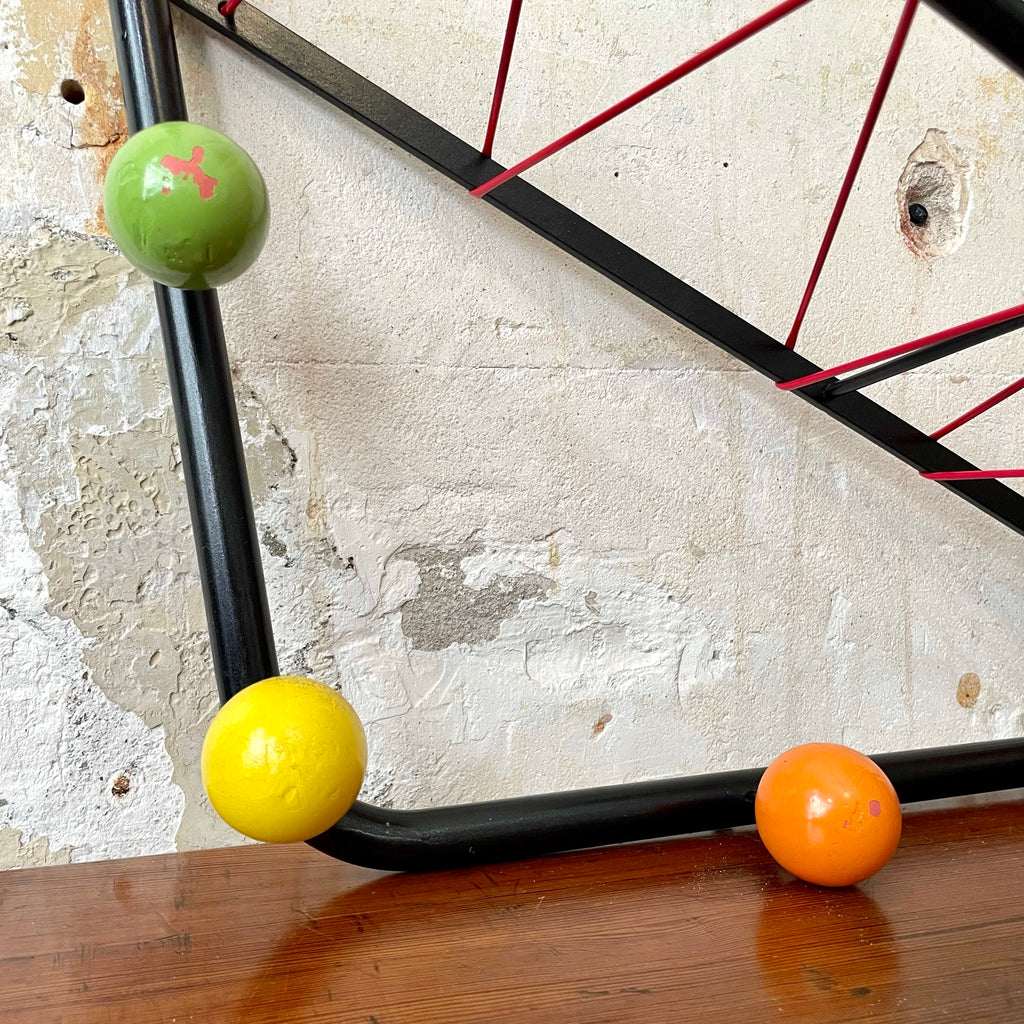 Superbe porte-manteaux et porte-chapeaux en métal, boules en bois peint de différentes couleurs et étagère en scoubidou rouge.