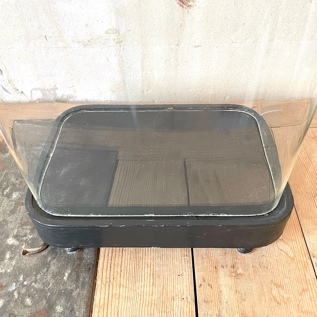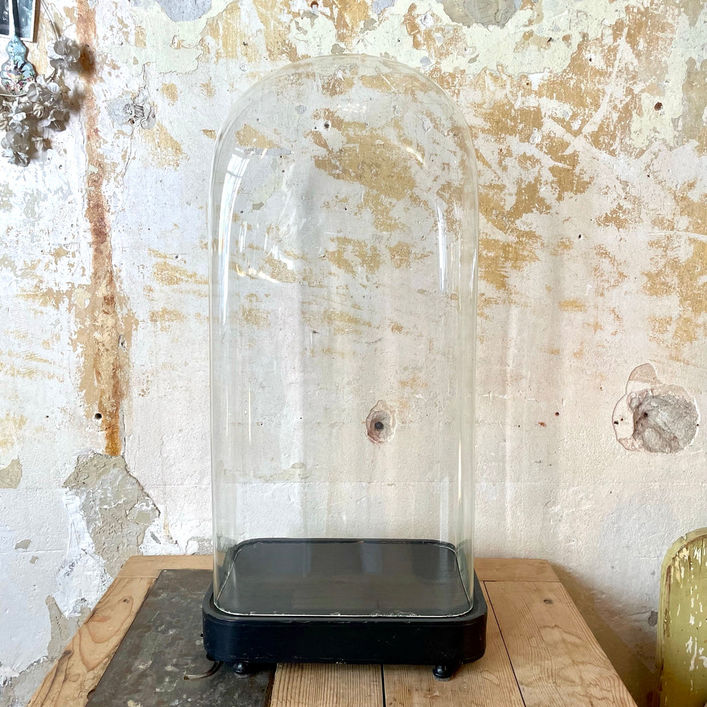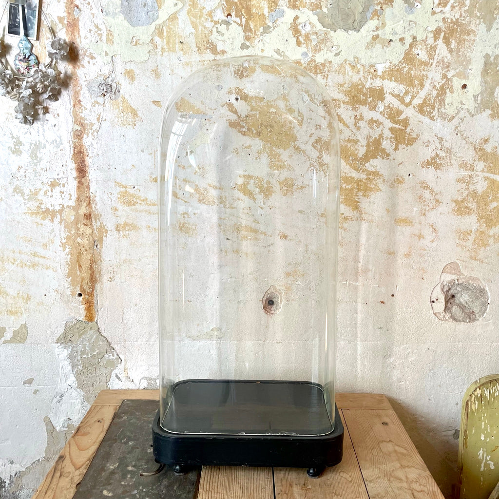 Cette énorme cloche en verre en impose par sa taille hors norme et sa forme rare et originale. Globe d'horloge à la fin du XIXe, elle intégrera facilement un intérieur moderne avec vos précieux objets de collection ou curiosités.