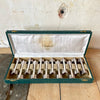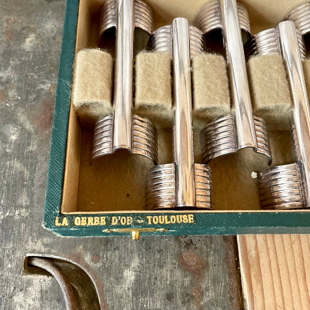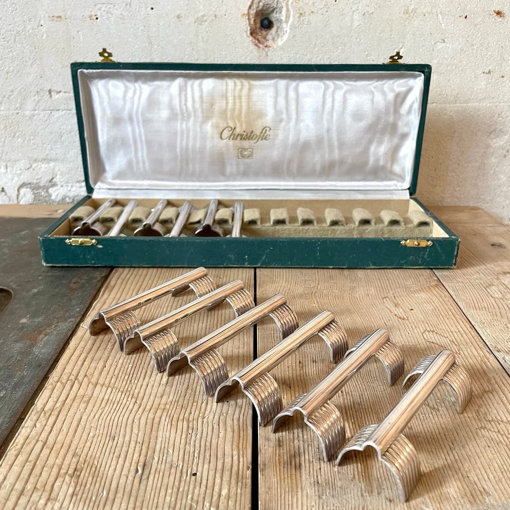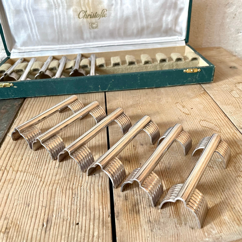 Le modèle Arceau typique du style Art Déco de Christofle a été crée en 1937 sous la direction artistique de Luc Lanel. Ce coffret comprend 12 porte-couteaux en métal argenté en très bon état.