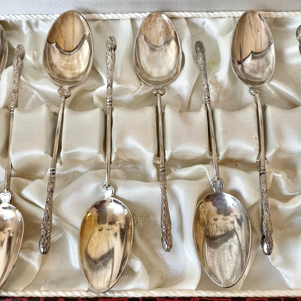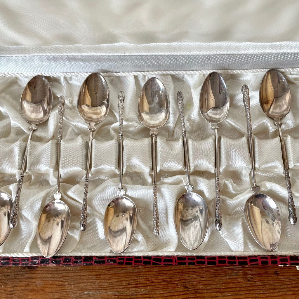 Écrin comprenant 12 cuillères à café à la russe en métal argenté. Le manche est joliment travaillé et se termine en patte de biche. Entre le manche et le cuilleron, un coeur se dessine.