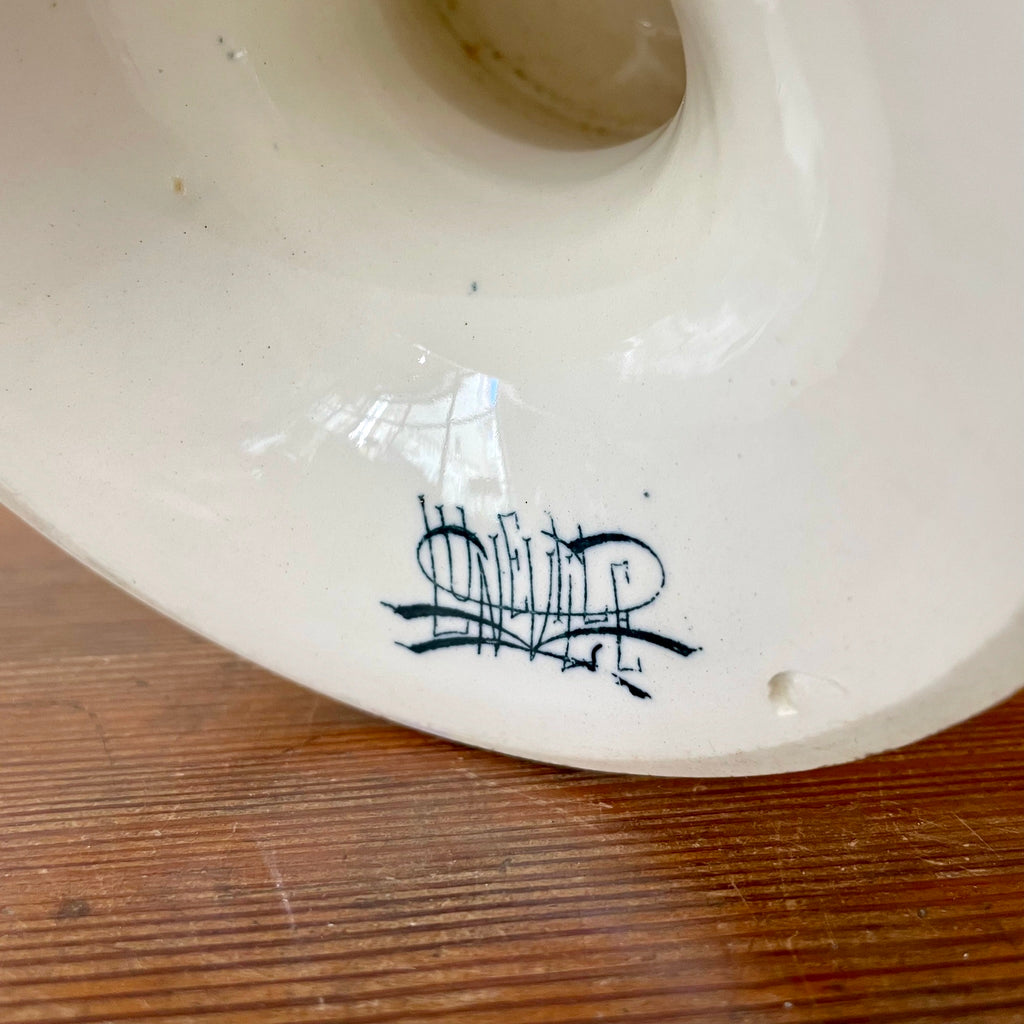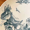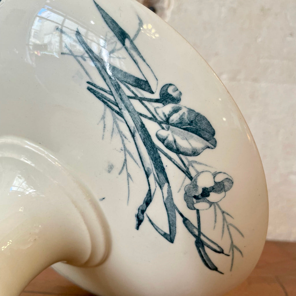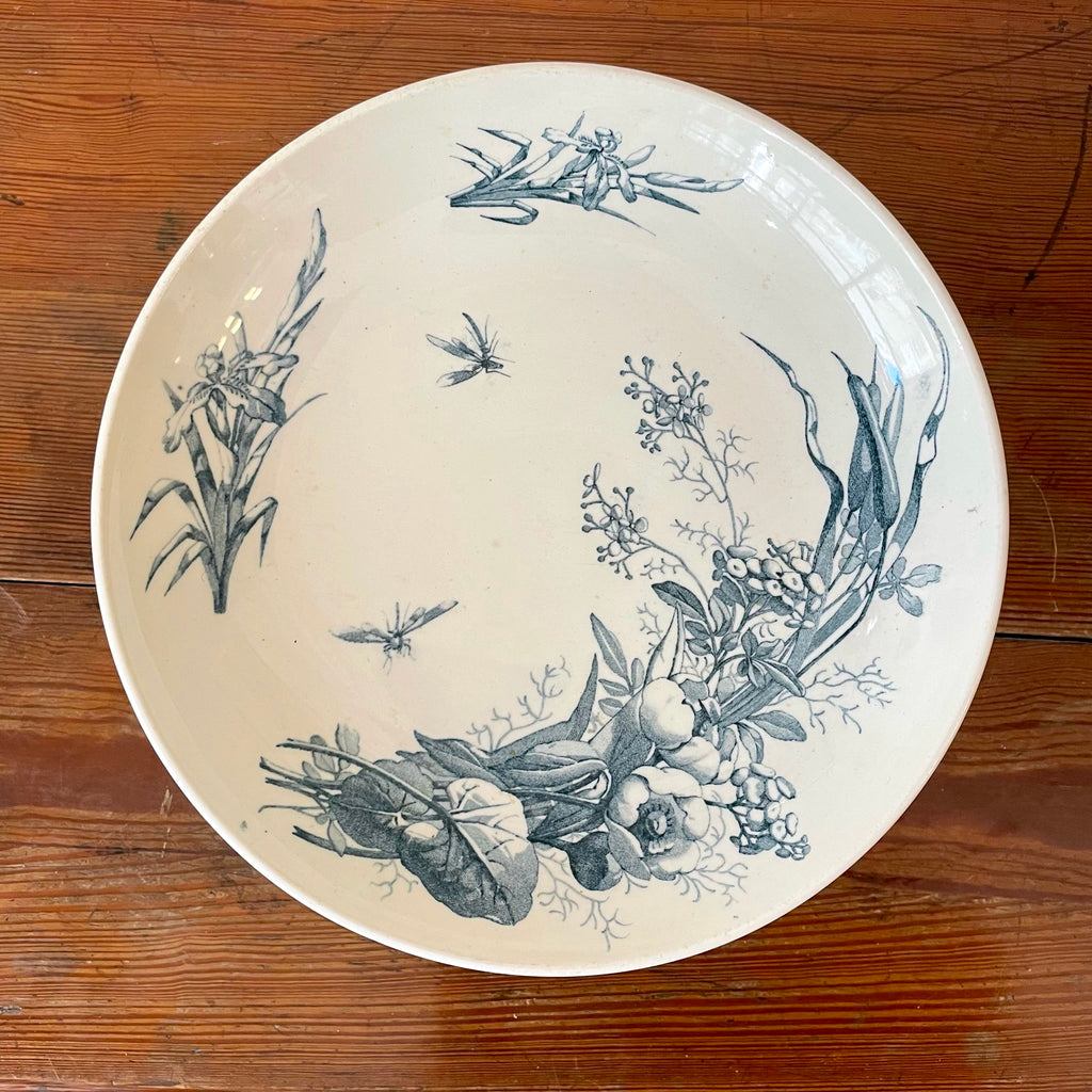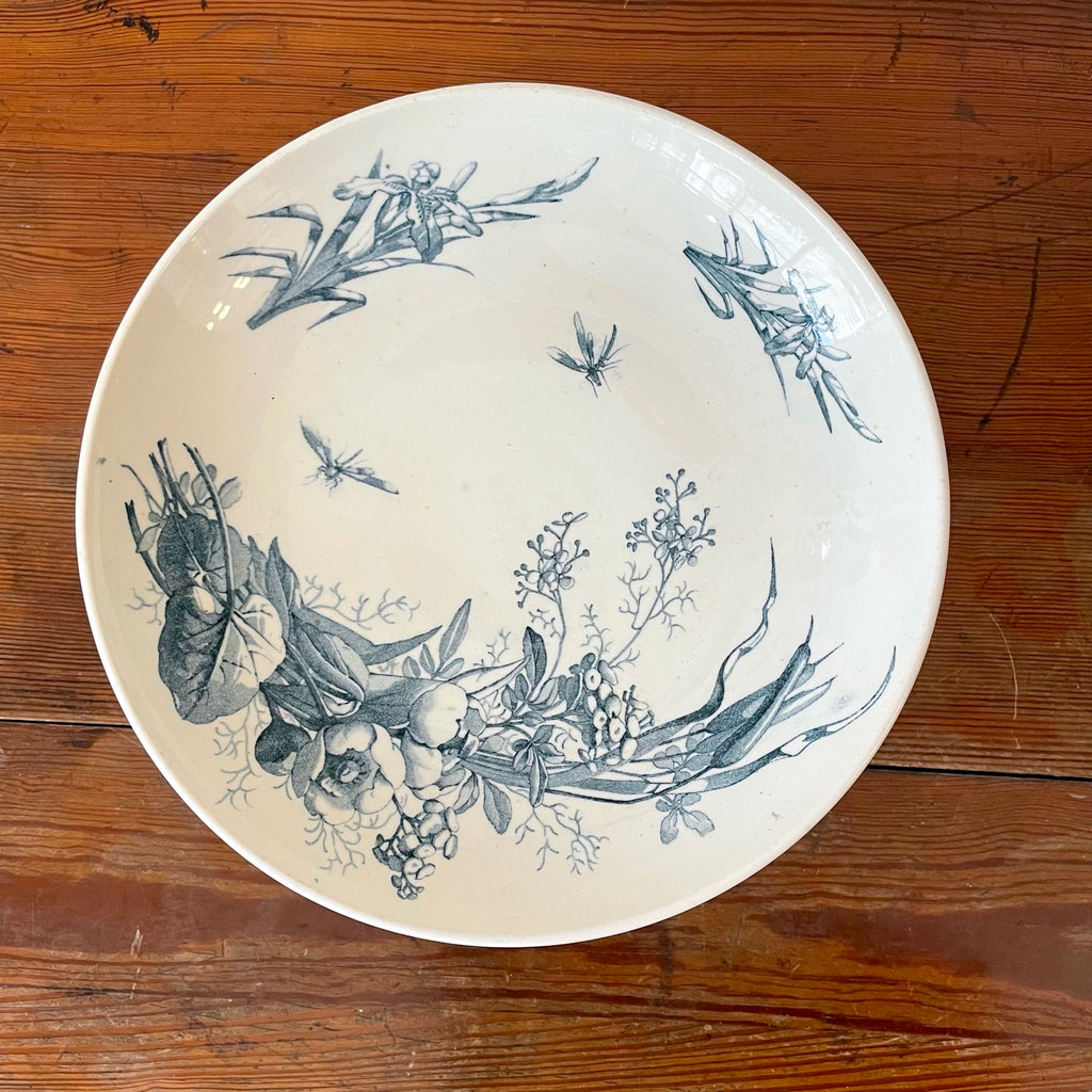 Superbe compotier de la faïencerie de Lunéville début XXe. Motifs floraux et libellules bleus.