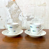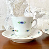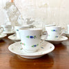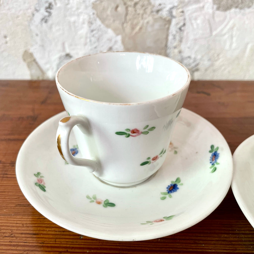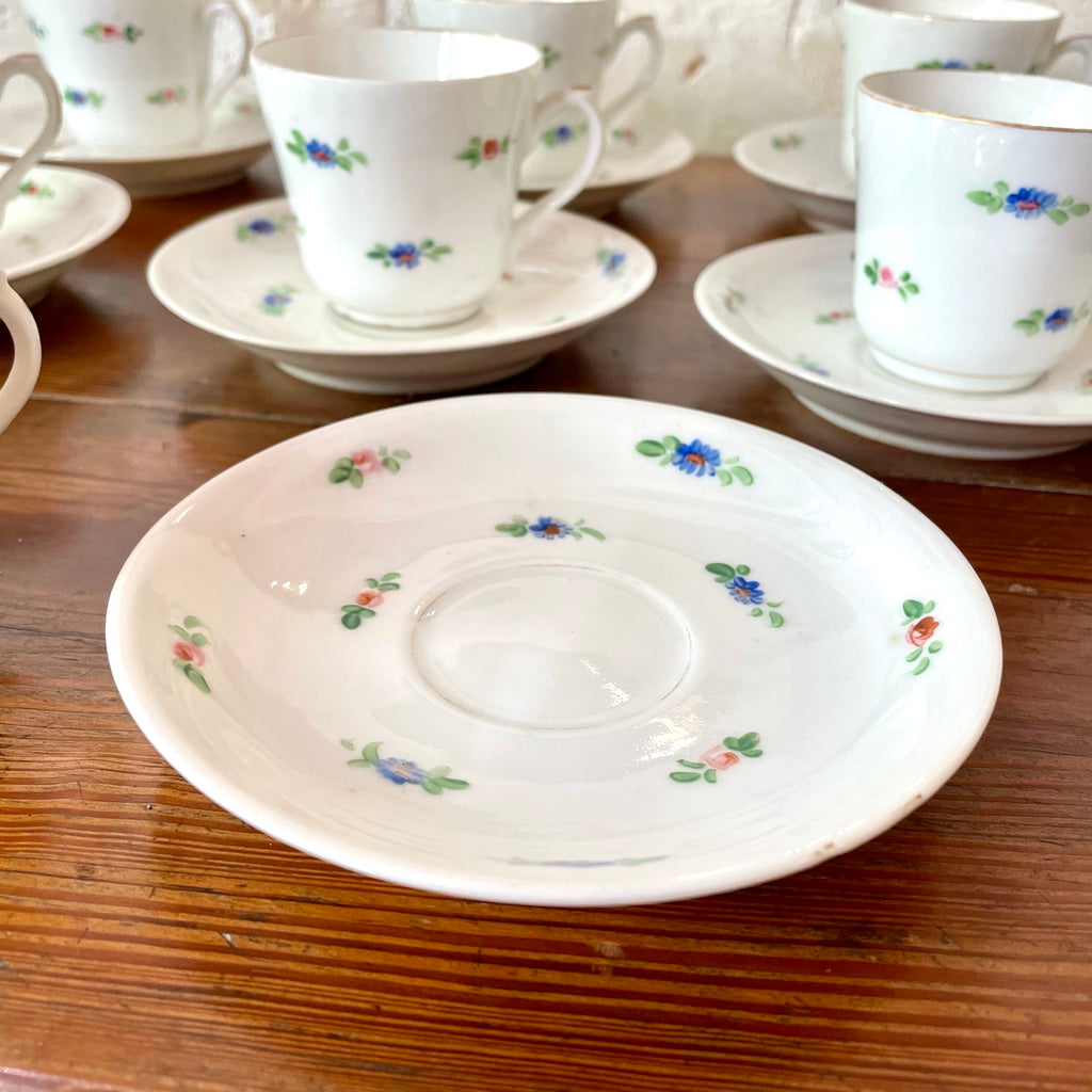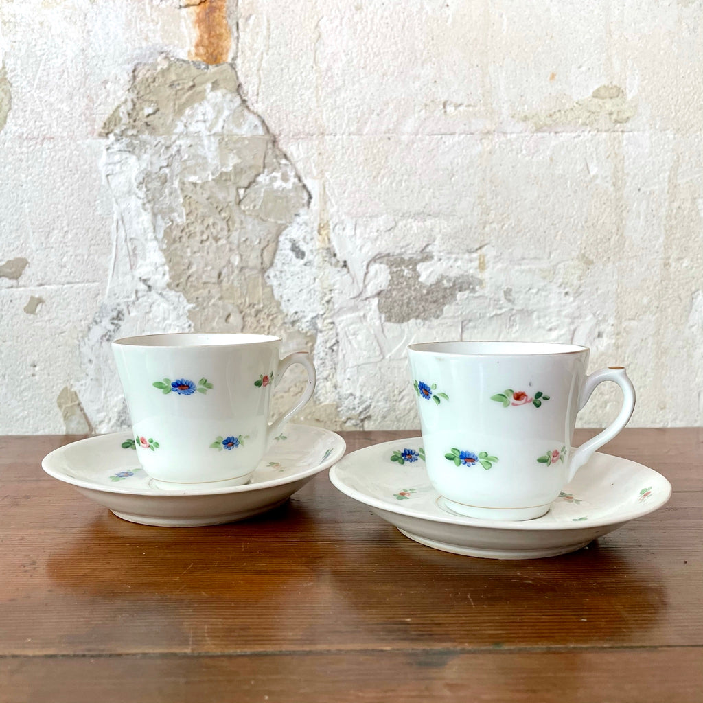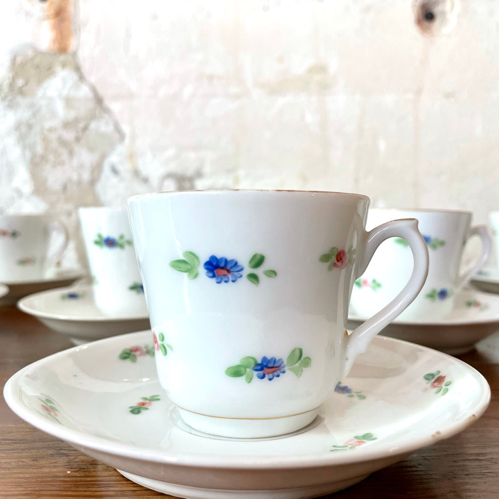 Ravissantes tasses à café et sous-tasses en porcelaine blanche avec petites fleurs colorées.