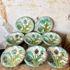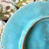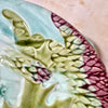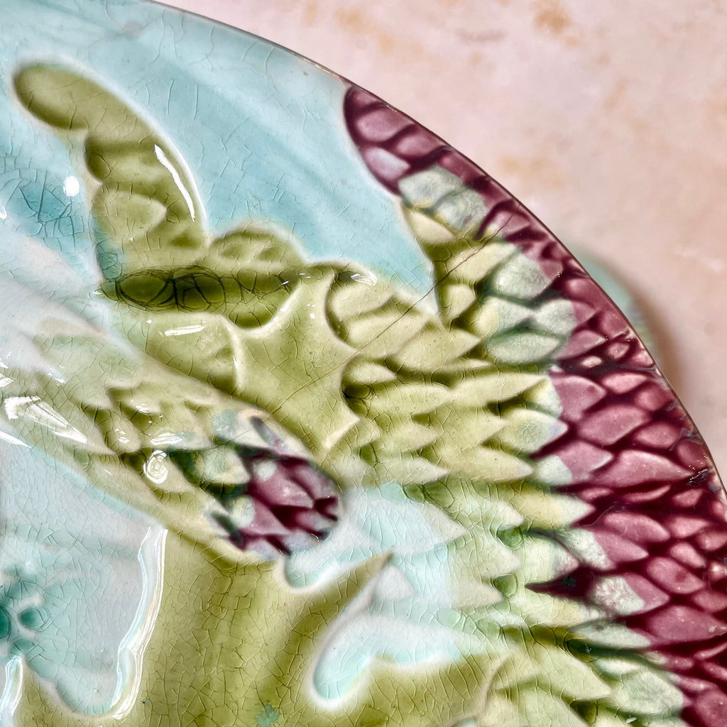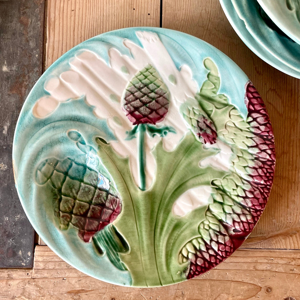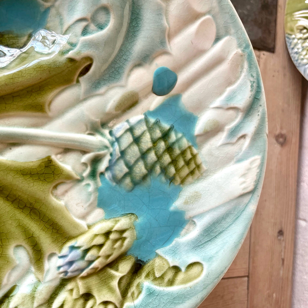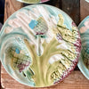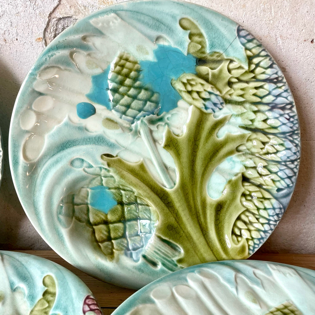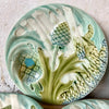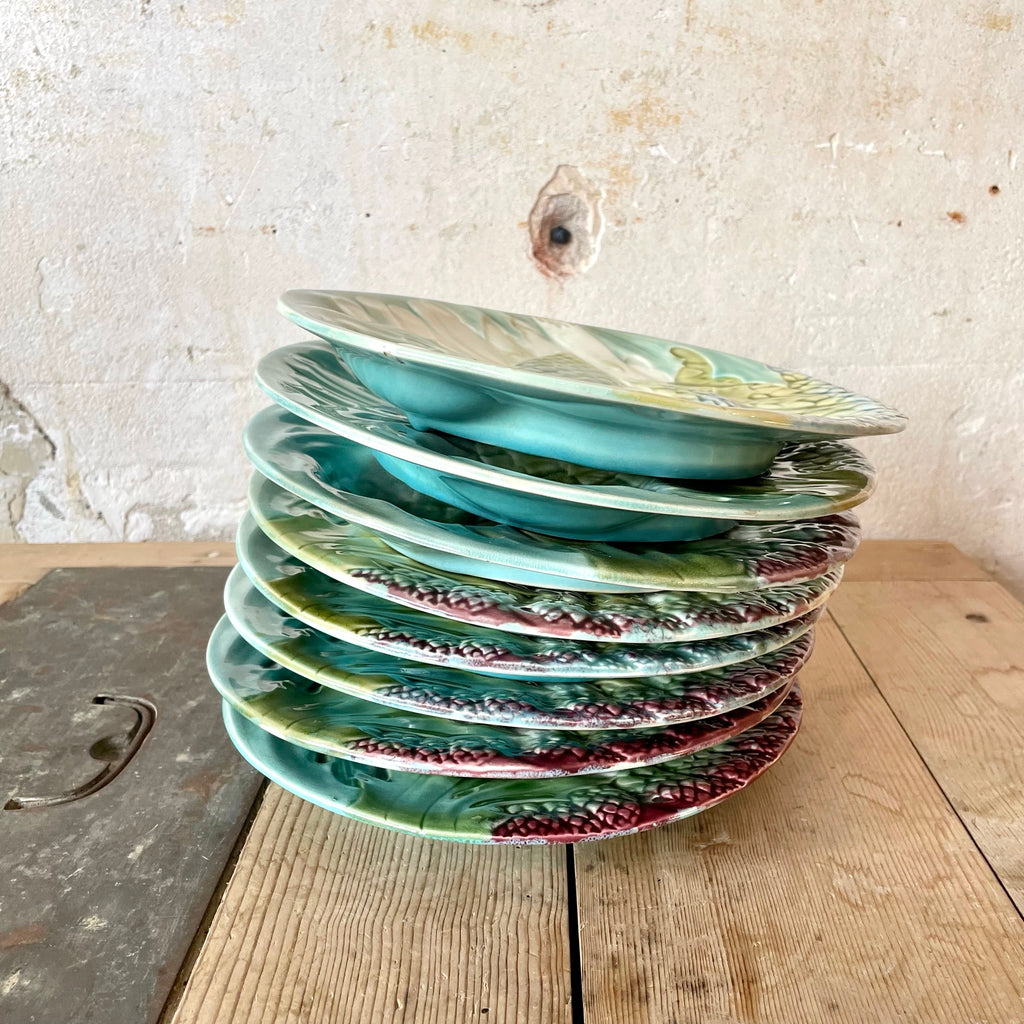 Ensemble de 8 assiettes à asperges en barbotine H K Lunéville décore d'asperges et artichaut dans les tons de turquoise vert et violet.