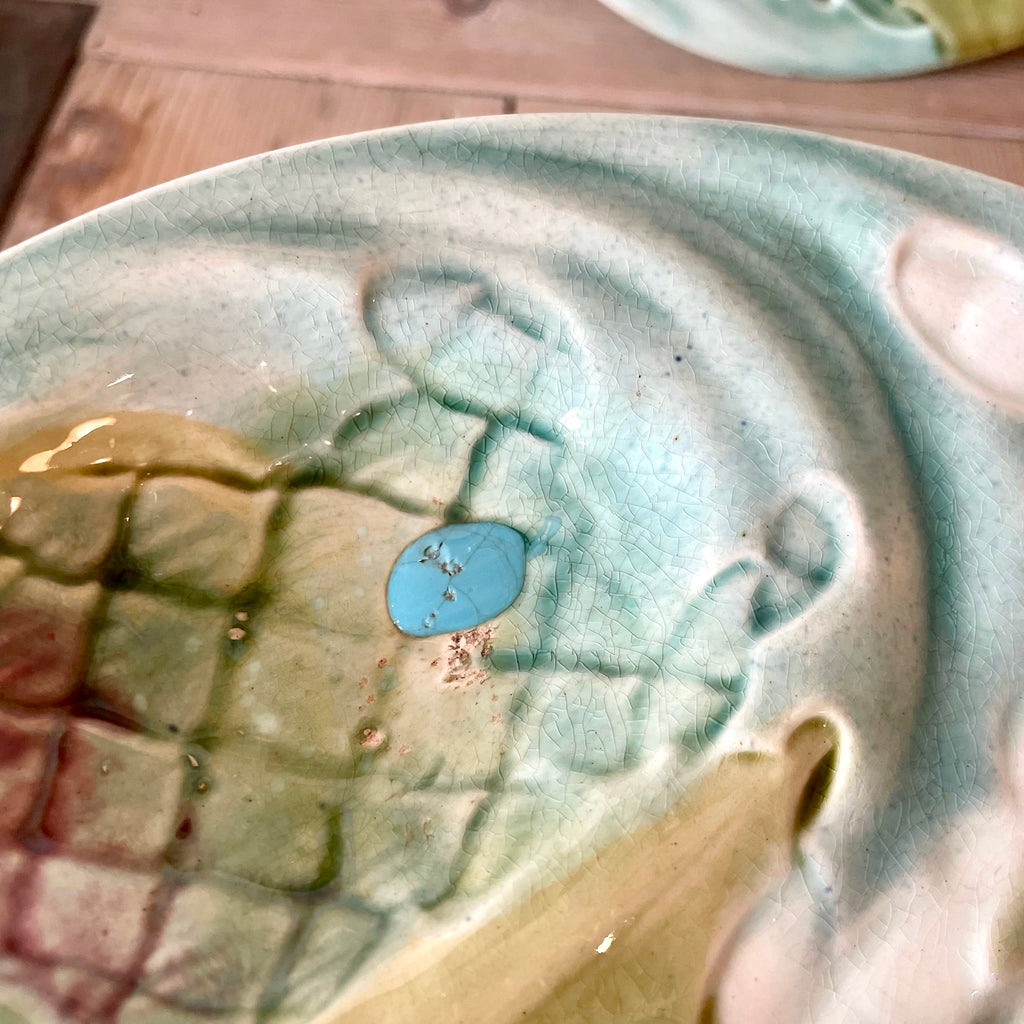 Elles sont quasi toutes imparfaites, différences de couleur, coulures d'émail, une est fêlée mais l'ensemble reste néanmoins superbe. Pour les amoureux de barbotine, d'asperges et de jolies tables !