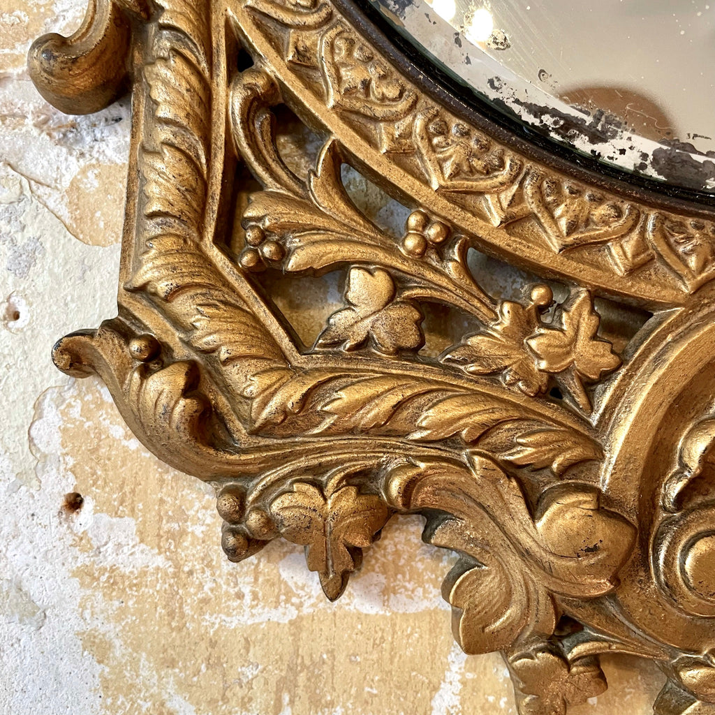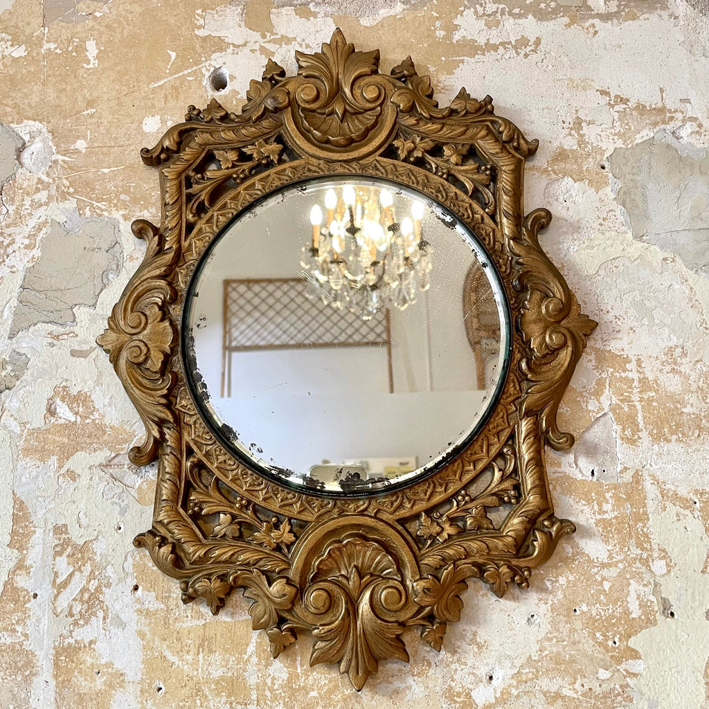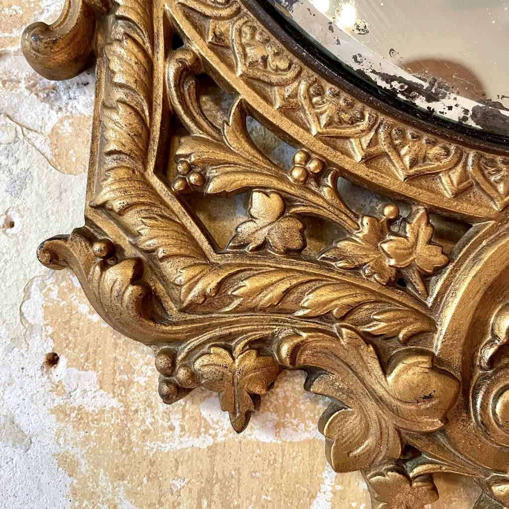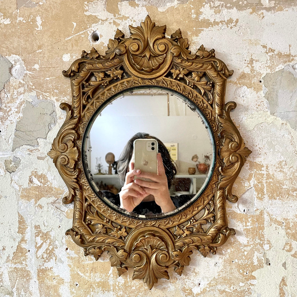 Dimensions : h. 43 cm, l. 32 cm, 21 cm de diamètre pour le miroir seul