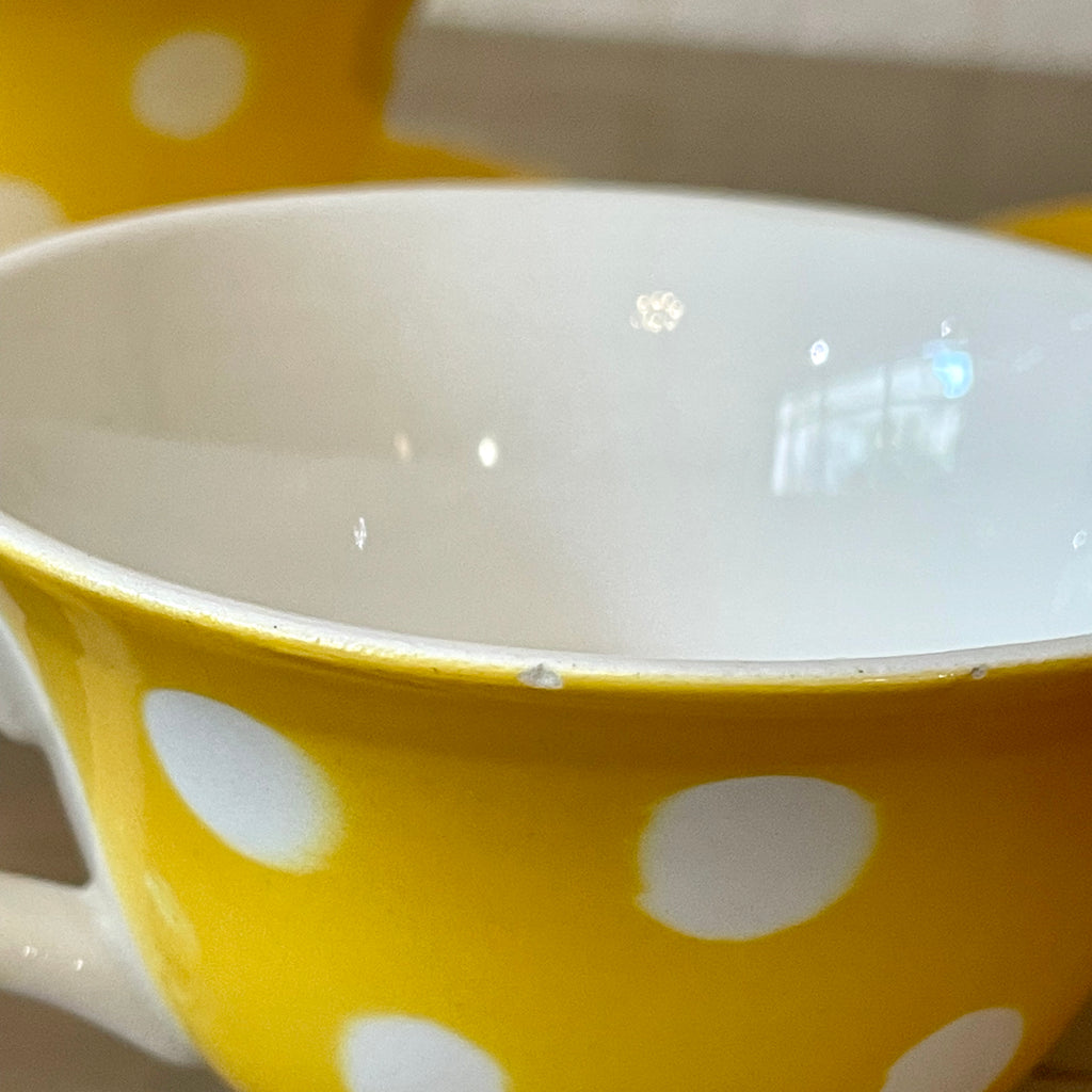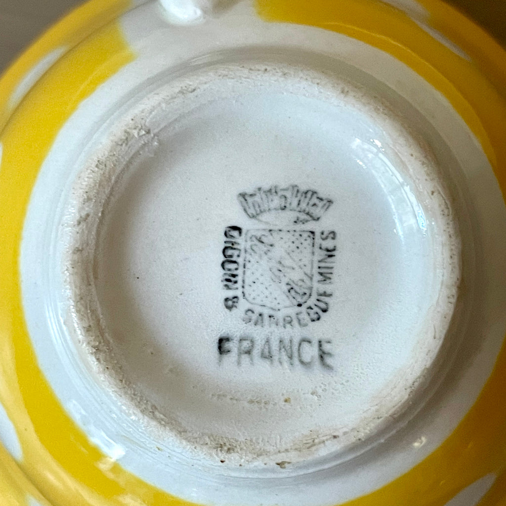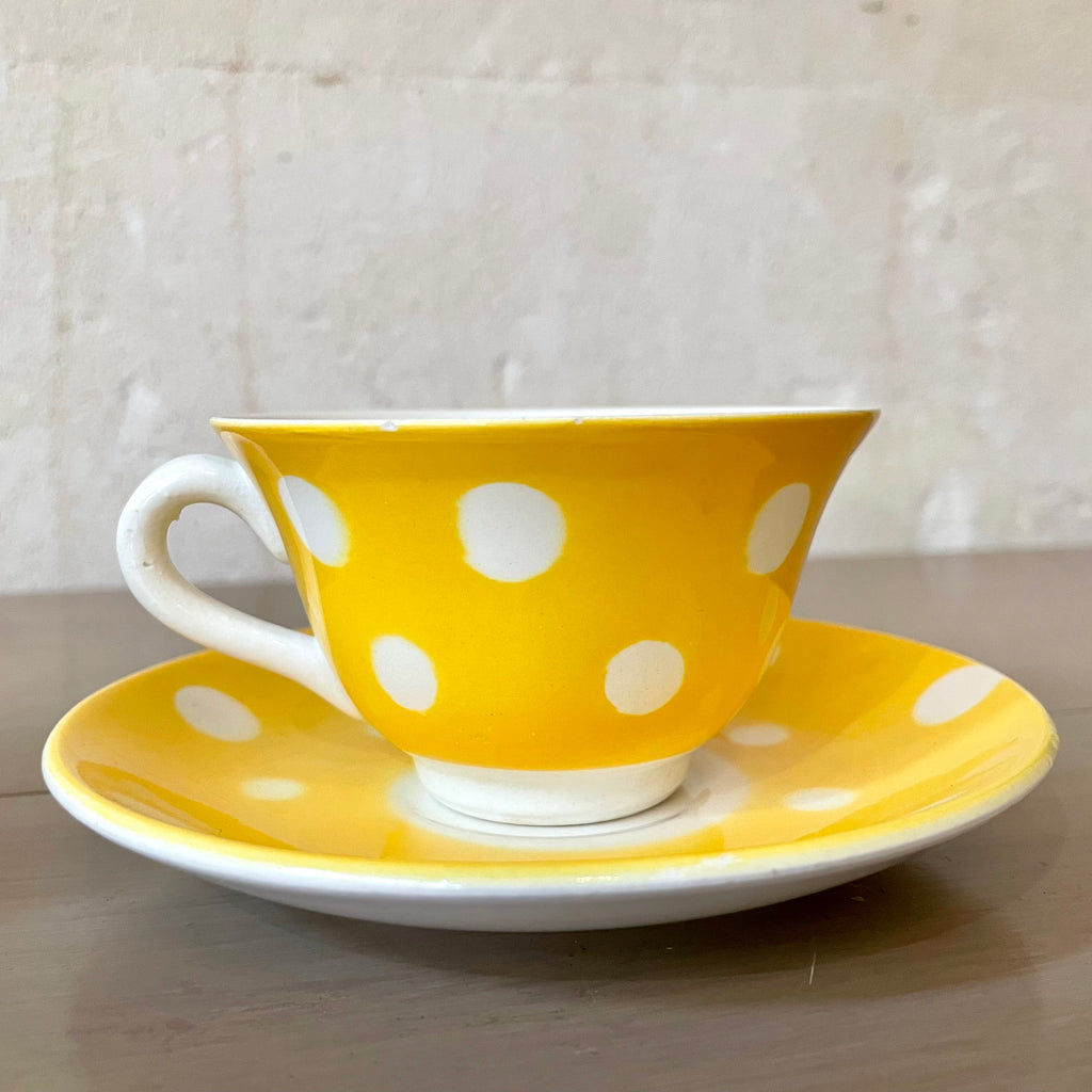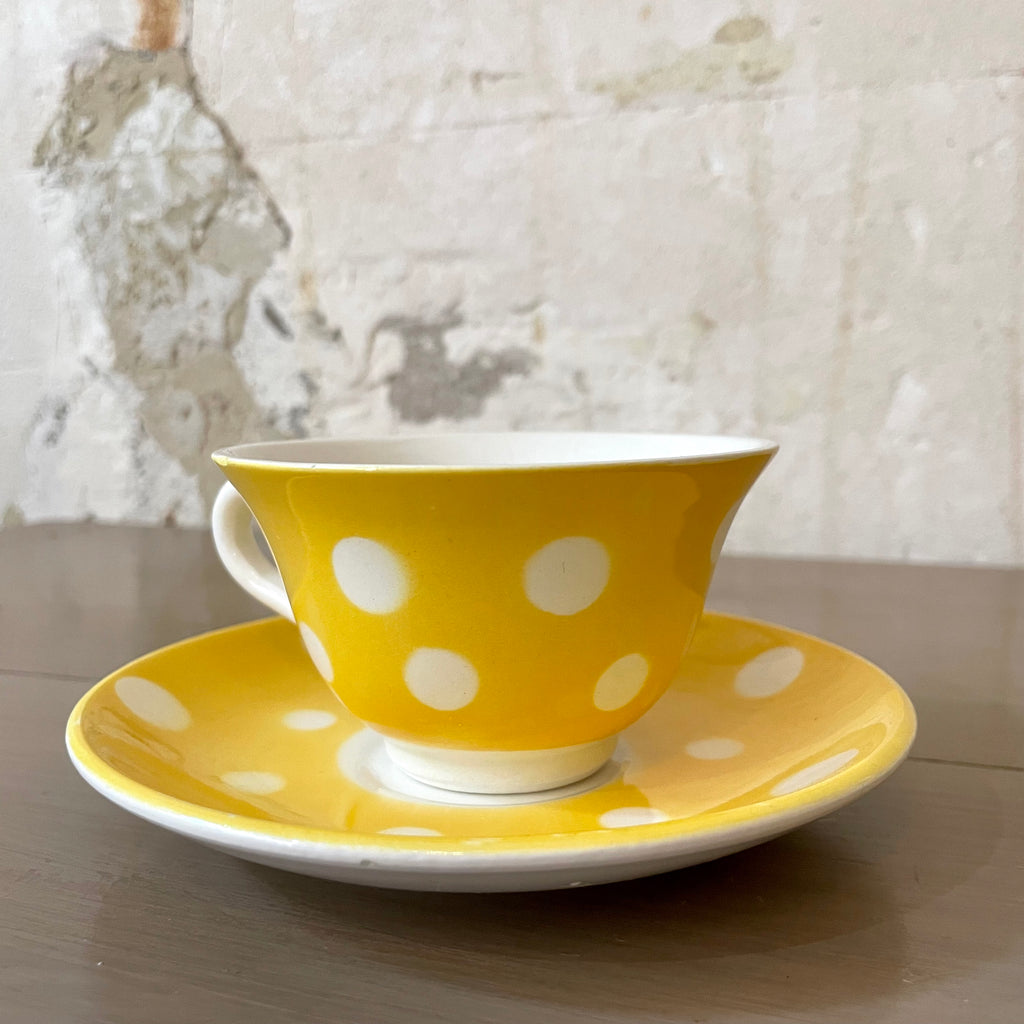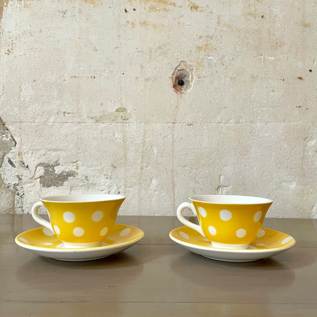 / Paire de tasses et sous-tasses en faïence de Digoin Sarreguemines jaunes à pois
