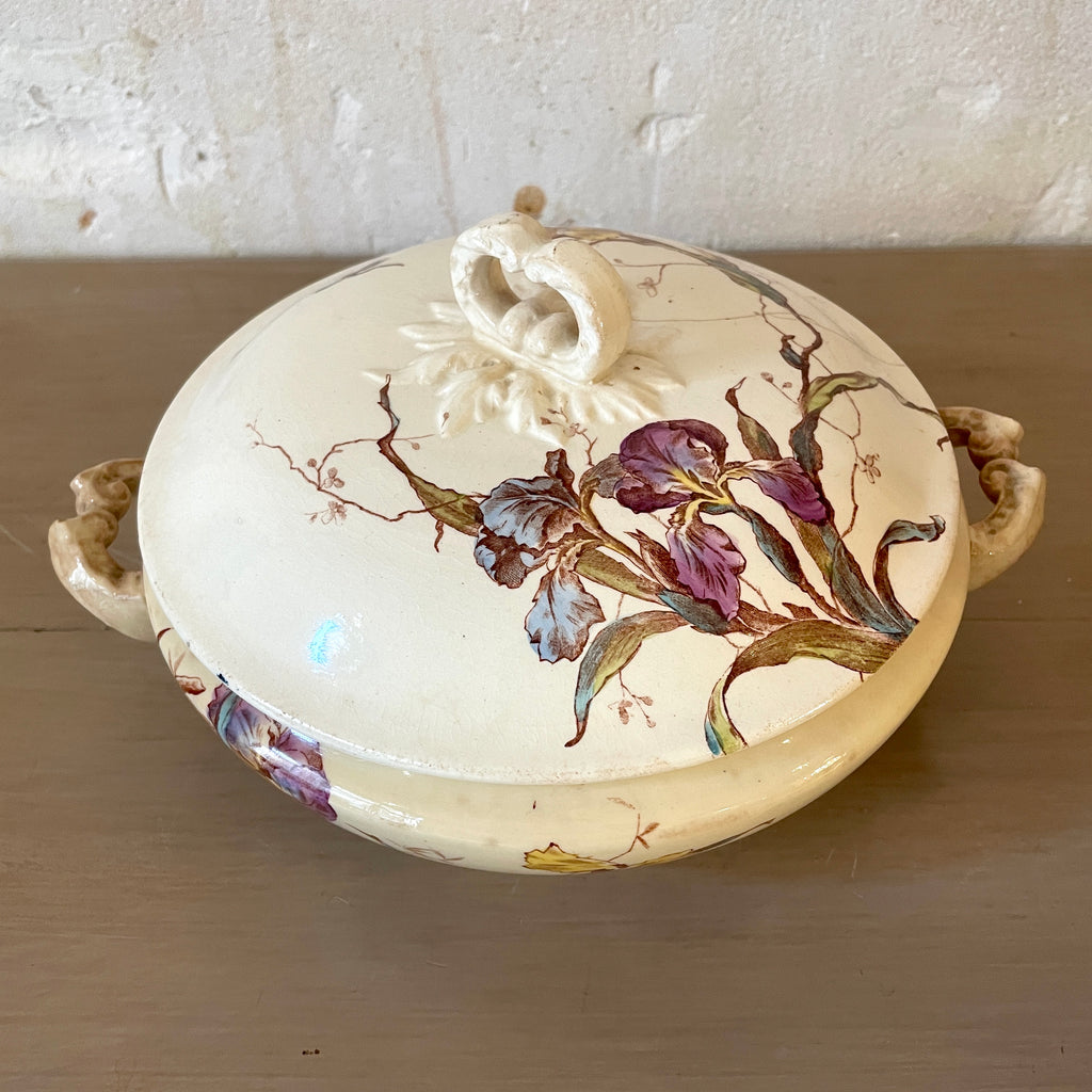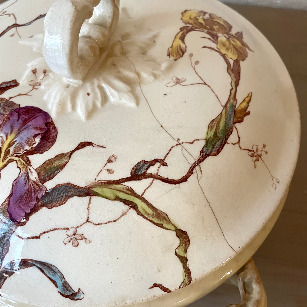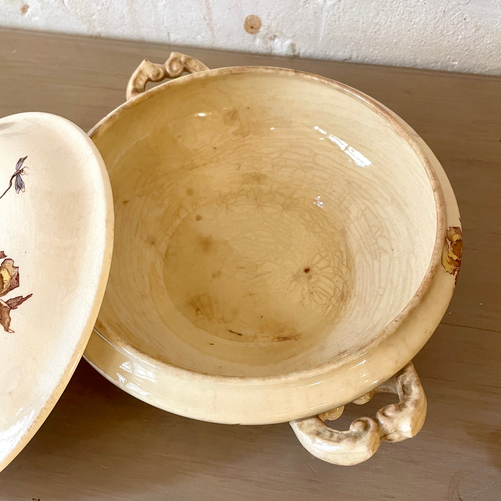 Petite soupière de la faïencerie de Gien Médailles d'or Diplôme d'honneur, modèle Iris et Libéllule, polychrome fin XIXe.
