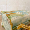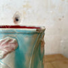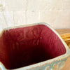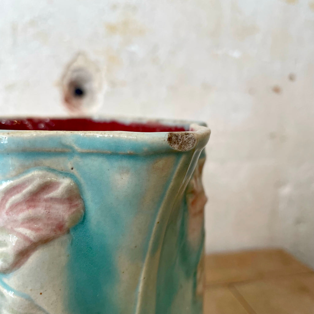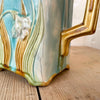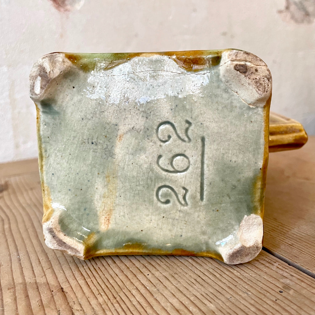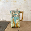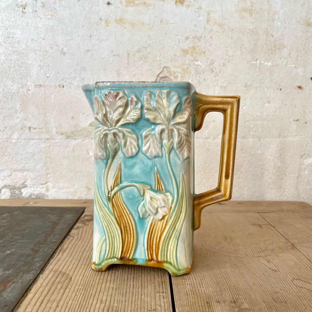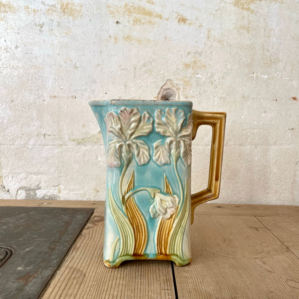 Très joli pichet rectangulaire en barbotine (probablement Onnaing) motifs floraux dans des tons de turquoise, ocre et vert pâle assez doux. Numéroté 262 sur le dessous.