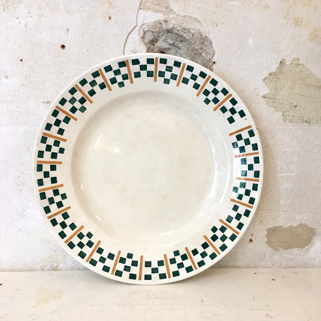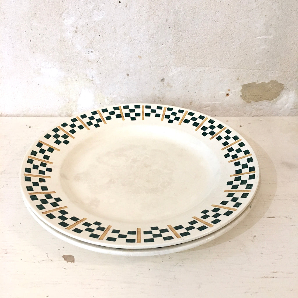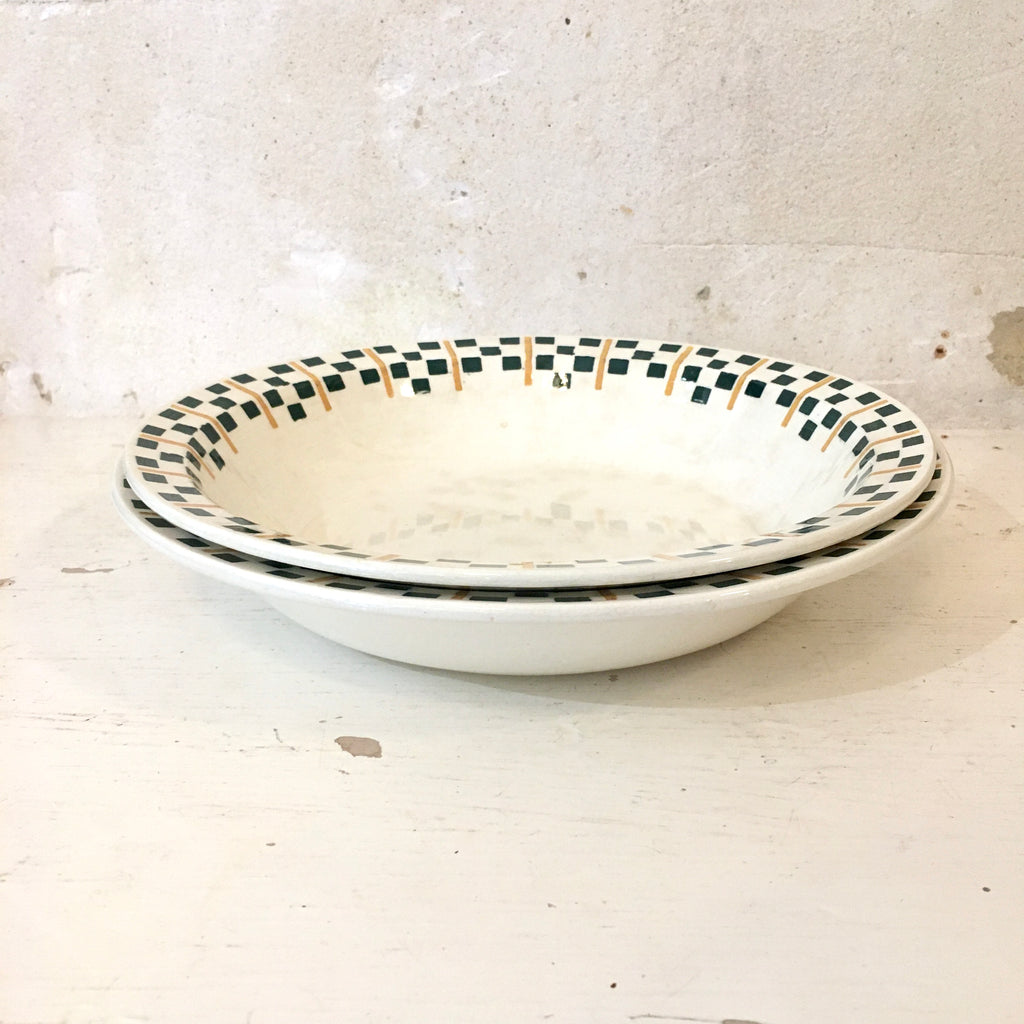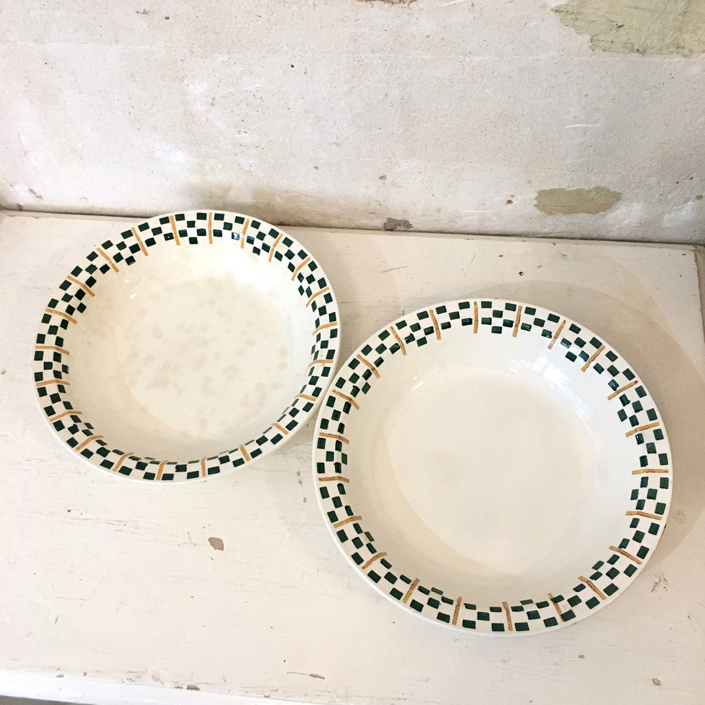 Il existe 3 tailles et formes différentes pour ces plats Art Déco. Joli décor en damier vert et blanc cassé rehaussé de lignes jaune moutarde.