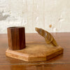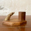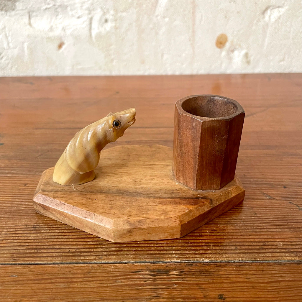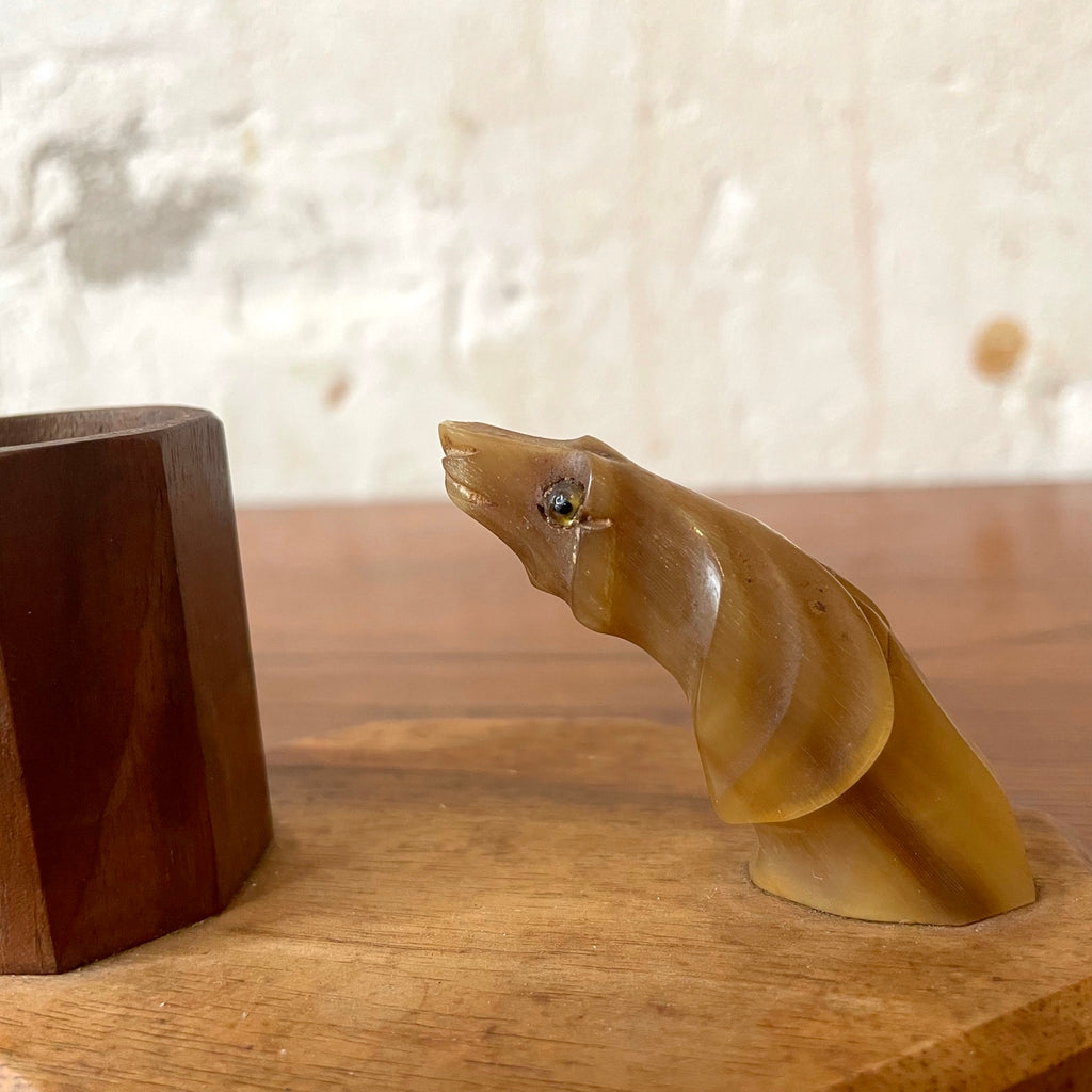 En bois et corne, ce joli porte piques (les piques sont manquants) à escargots ou cure-dents de forme typique de l'Art Déco est tout à fait ravissant. Il est orné d'une tête de teckel en corne qui pointe son nez vers le pot octogonal qui reçoit les piques.