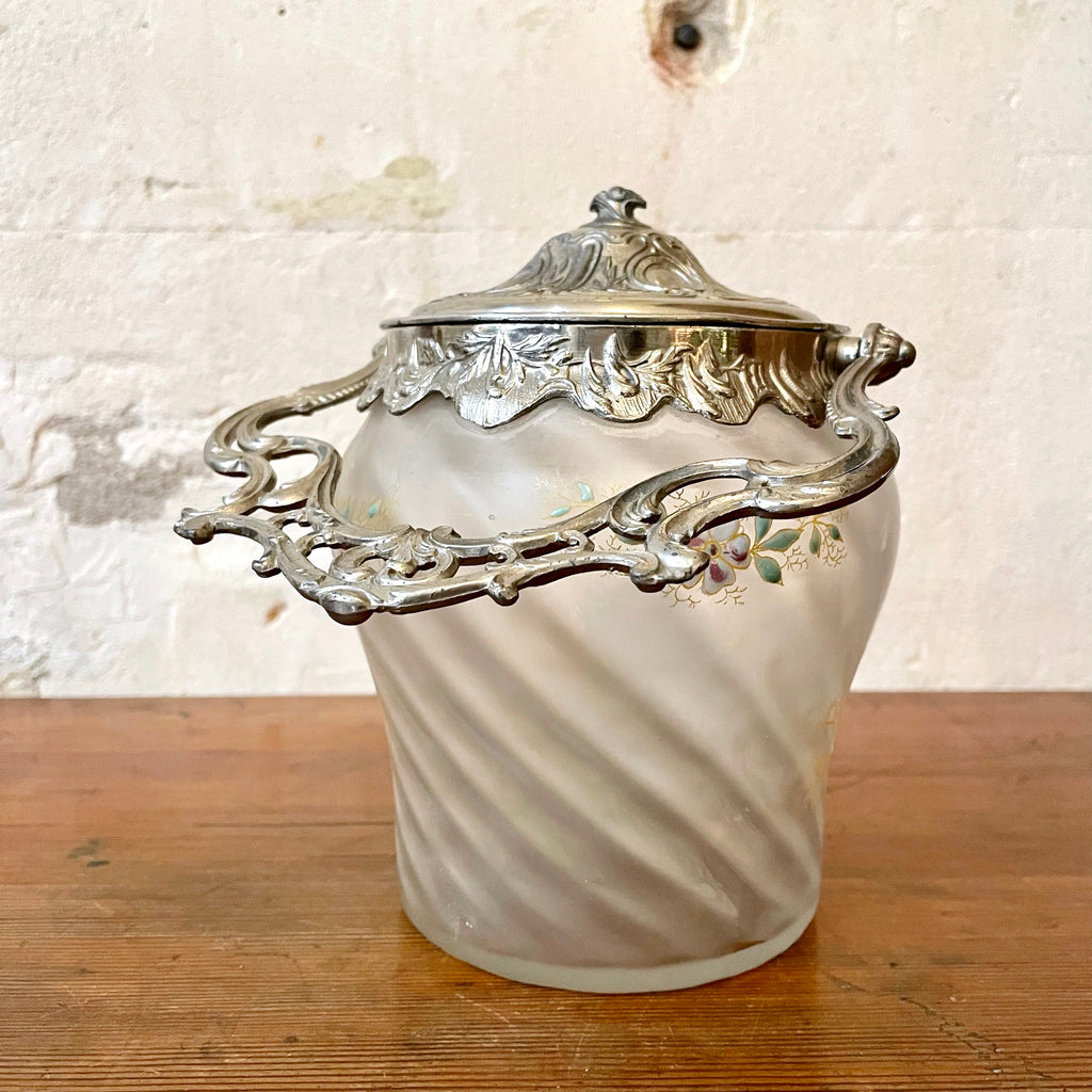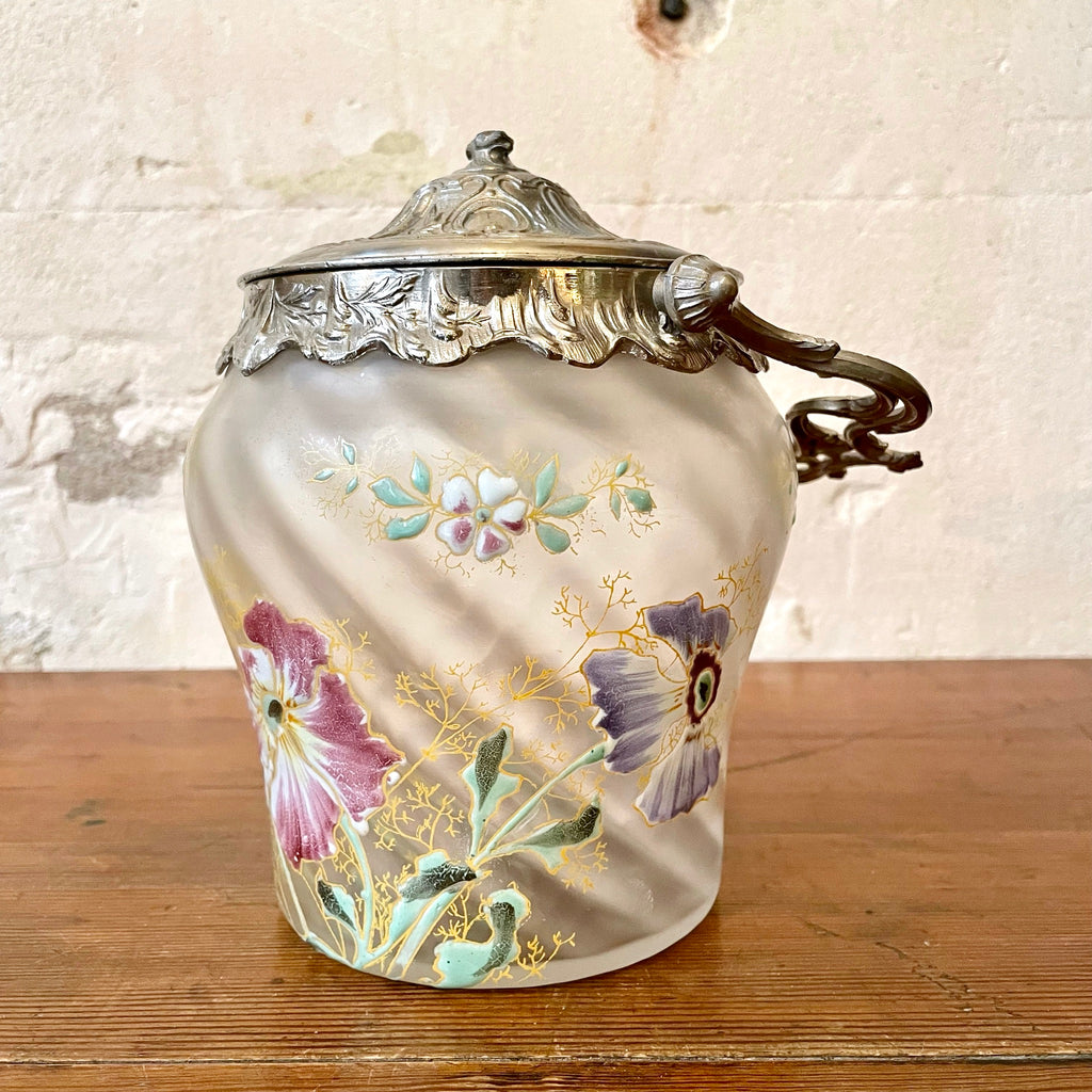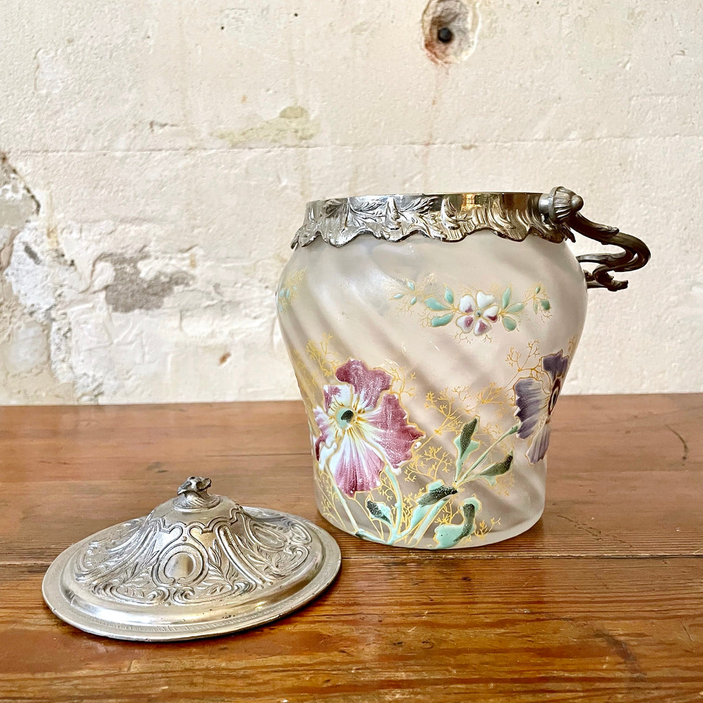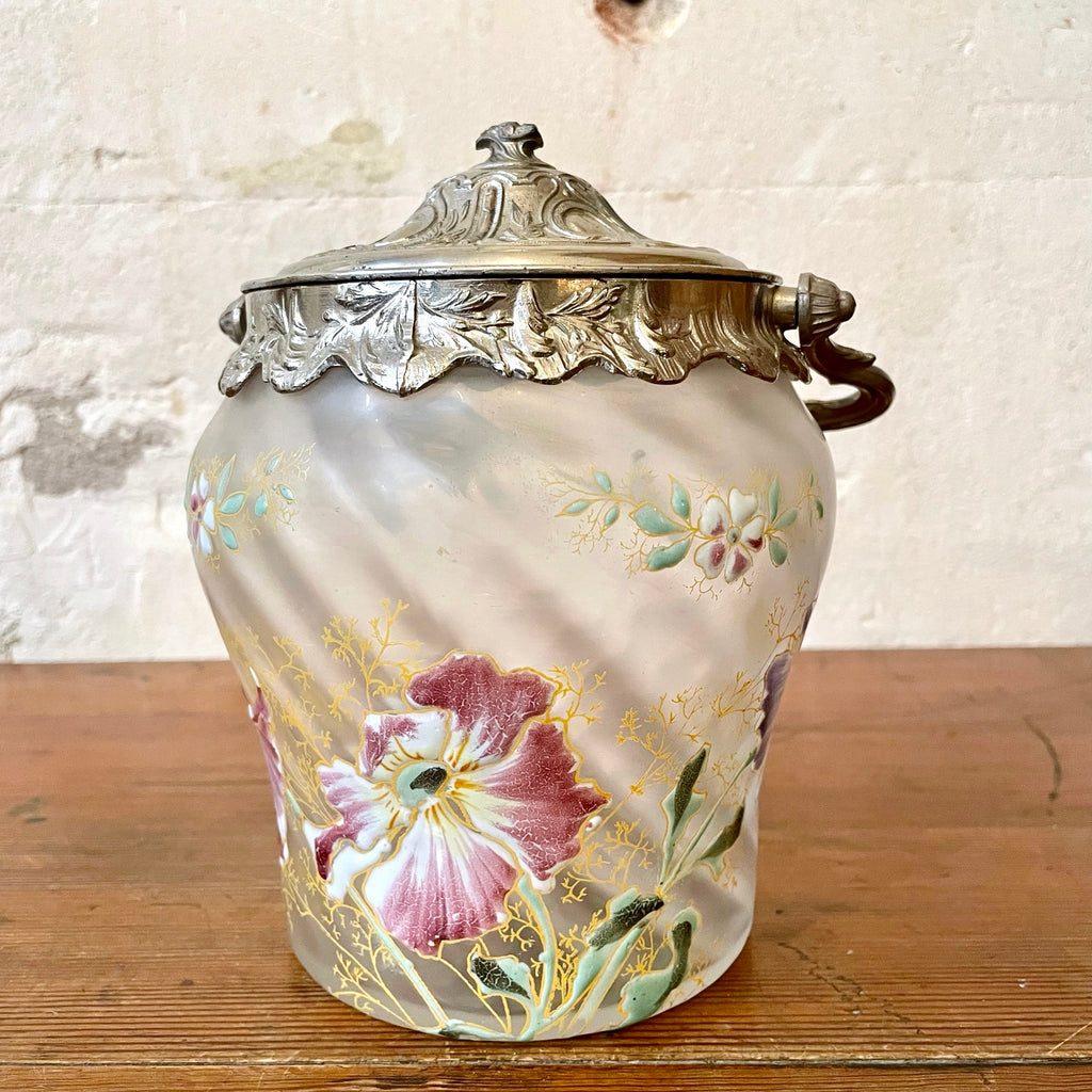 / Pot à biscuit en verre torsadé émaillé décor floral LEGRAS