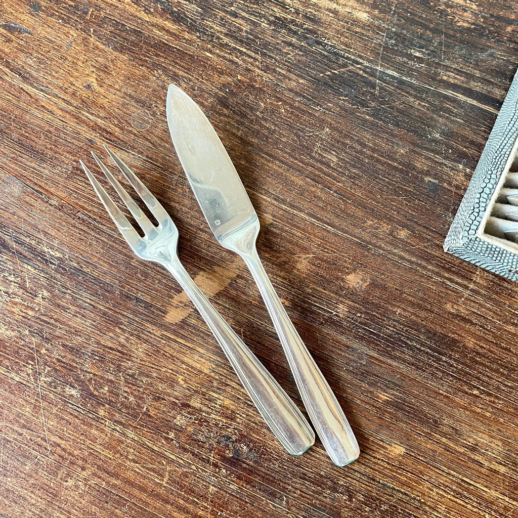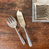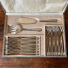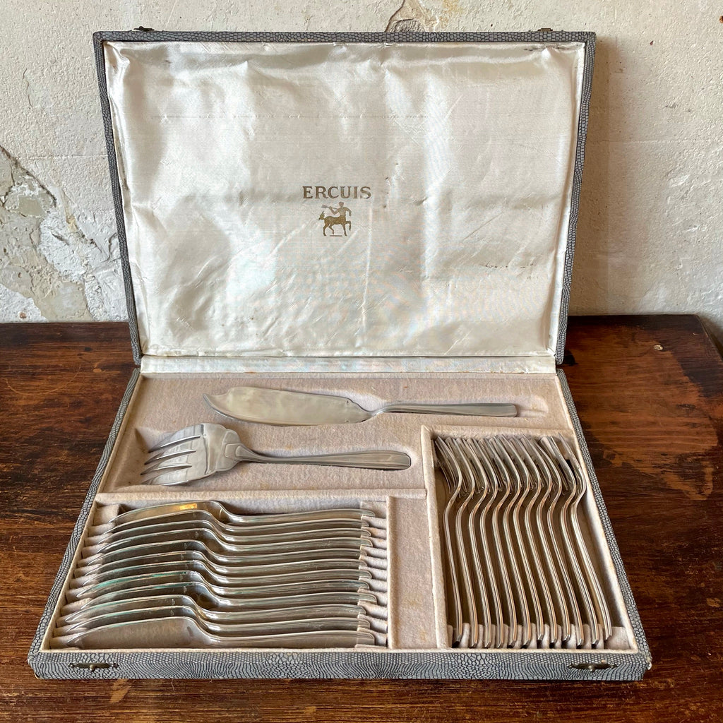En métal argenté de l'orfèvrerie Ercuis, ce service 26 pièces comprend 12 fourchettes et 12 couteaux à poisson ainsi que les couverts de service.