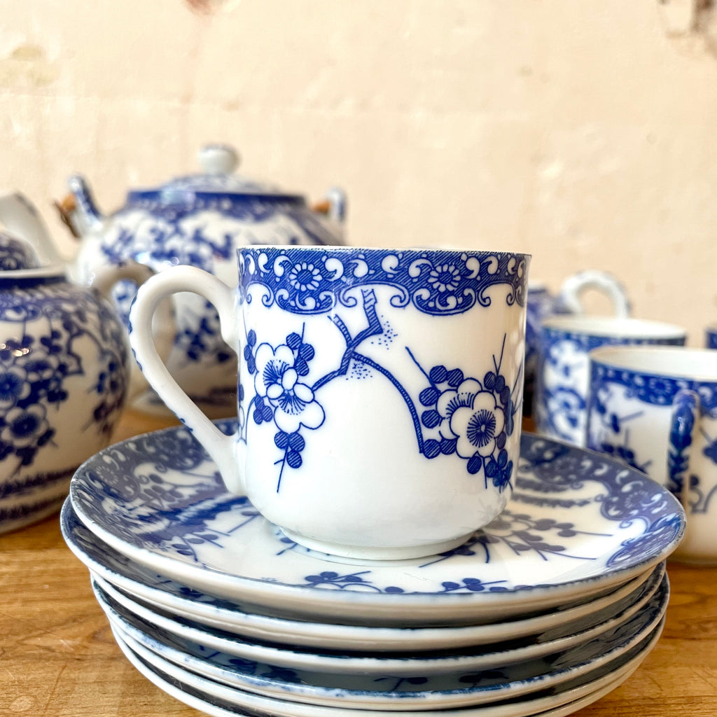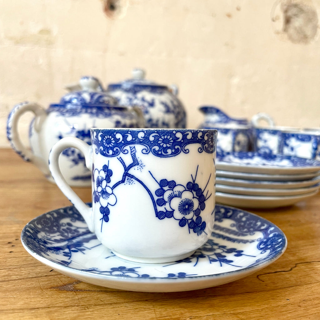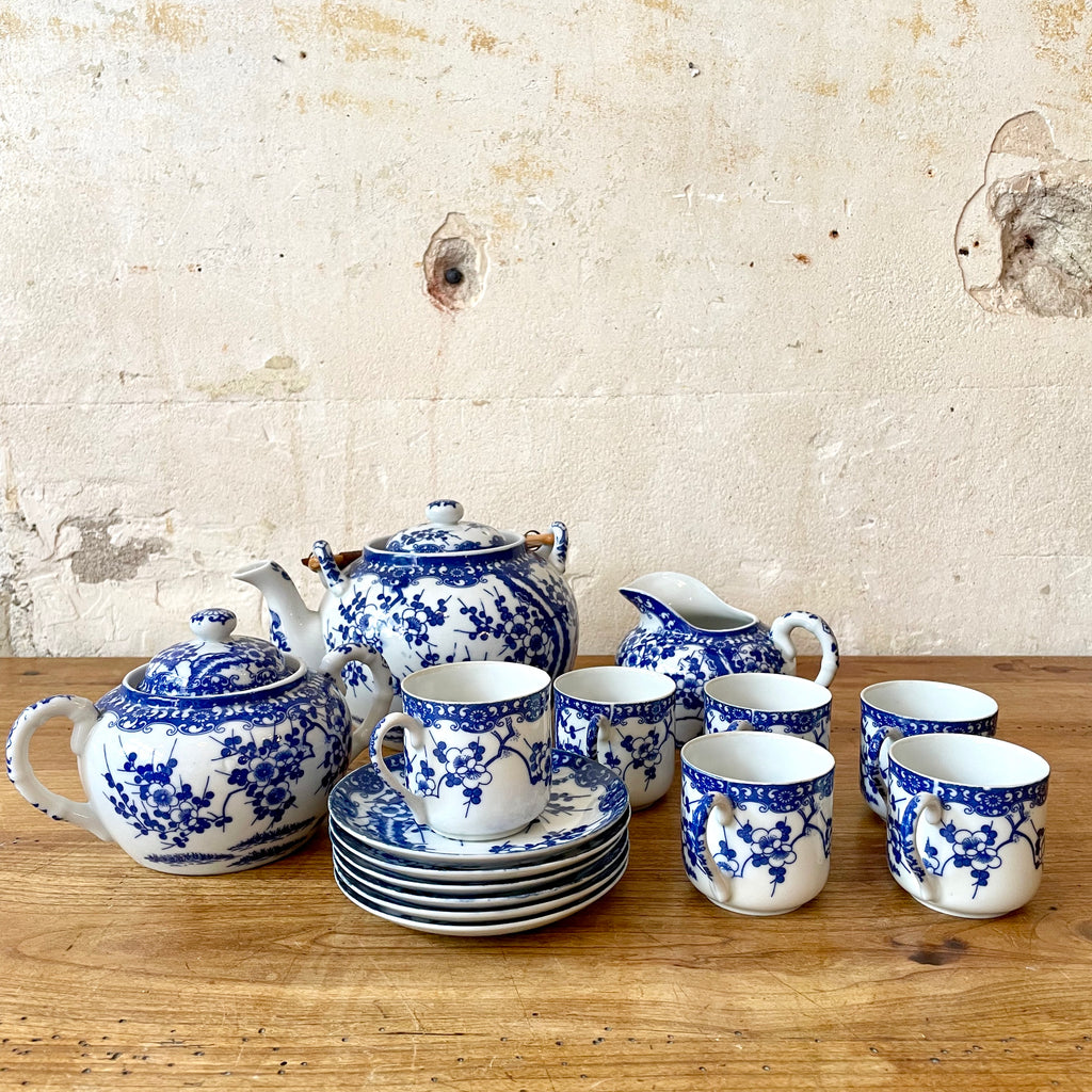 Ravissant service en porcelaine fine du Japon. Motifs cerisier dans les tons de bleu. Composé de 6 tasses et sous-tasses, une théière, un sucrier et le pot à lait.
