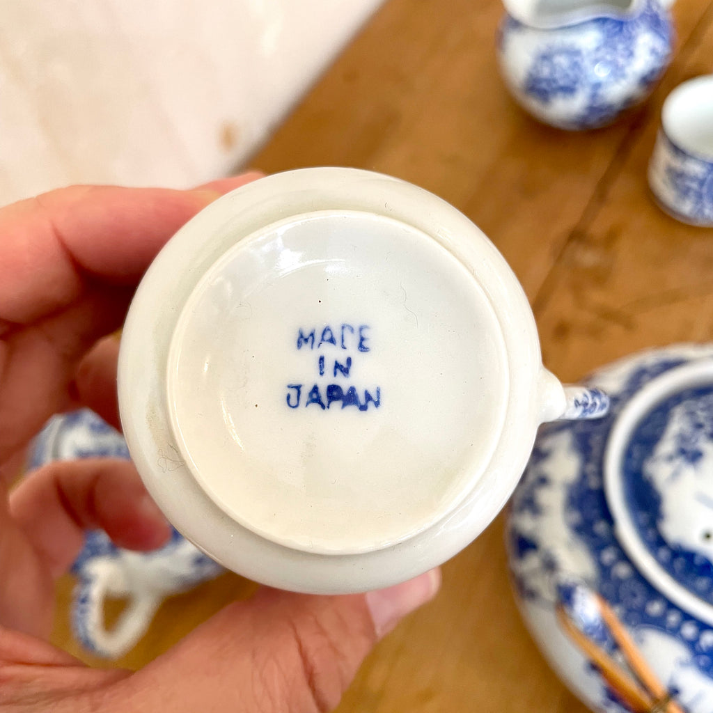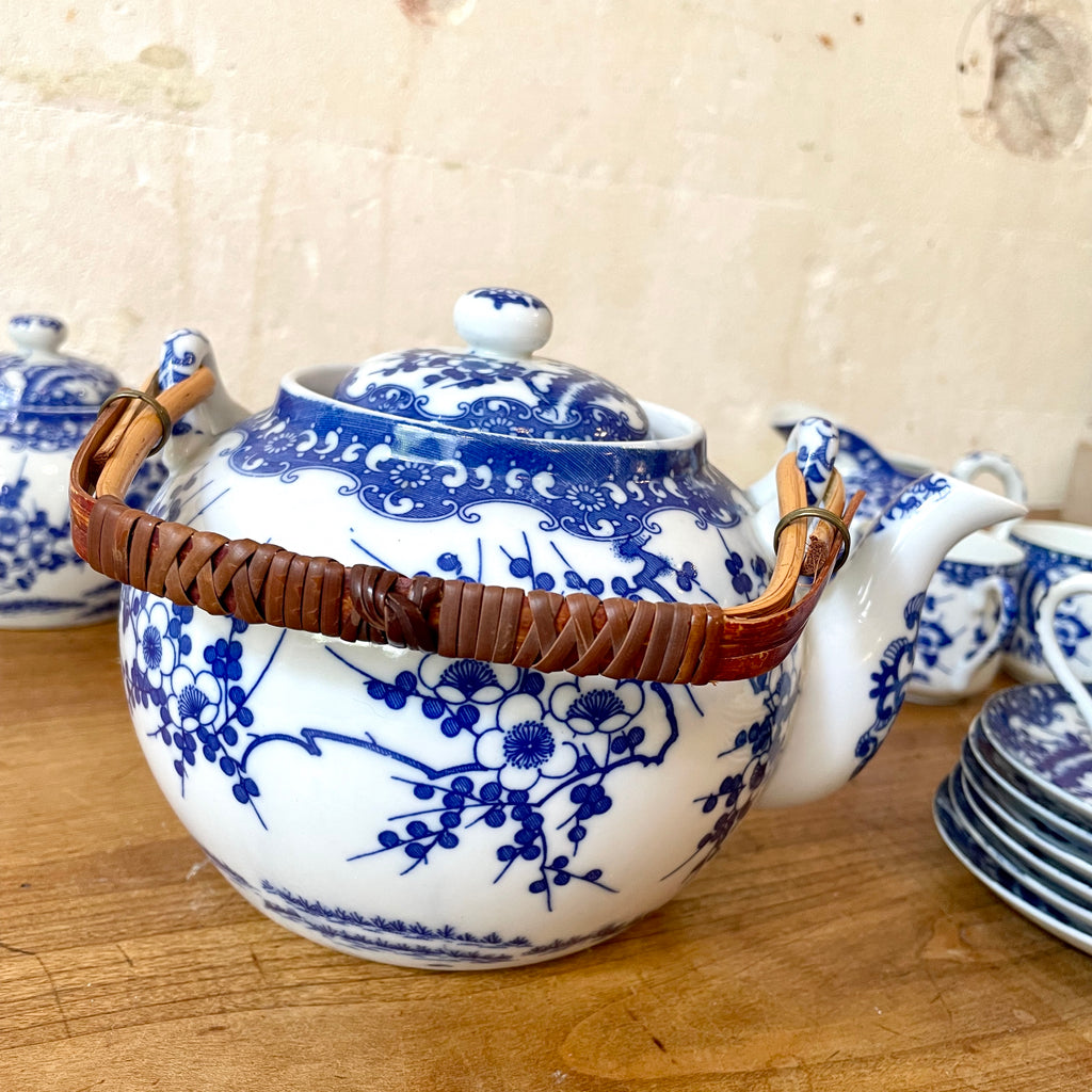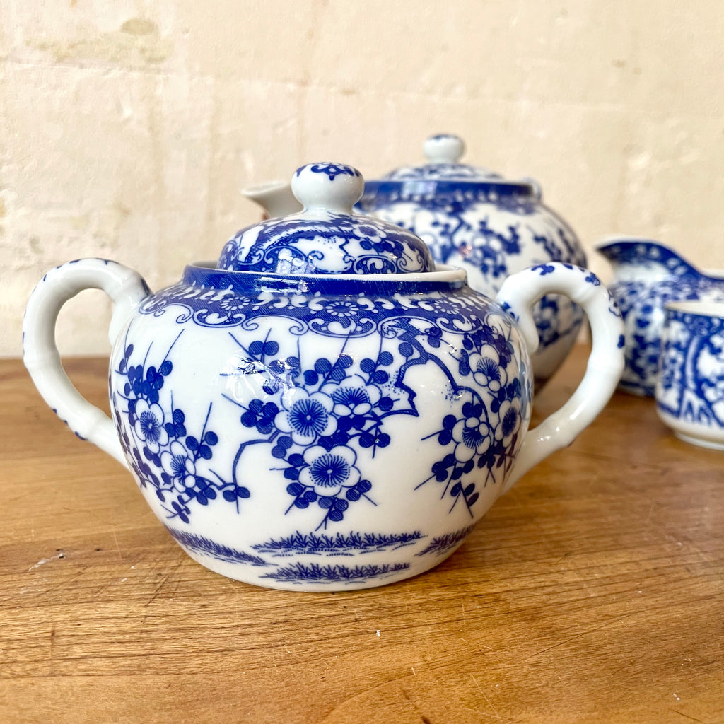 Ravissant service en porcelaine fine du Japon. Motifs cerisier dans les tons de bleu. Composé de 6 tasses et sous-tasses, une théière, un sucrier et le pot à lait.
