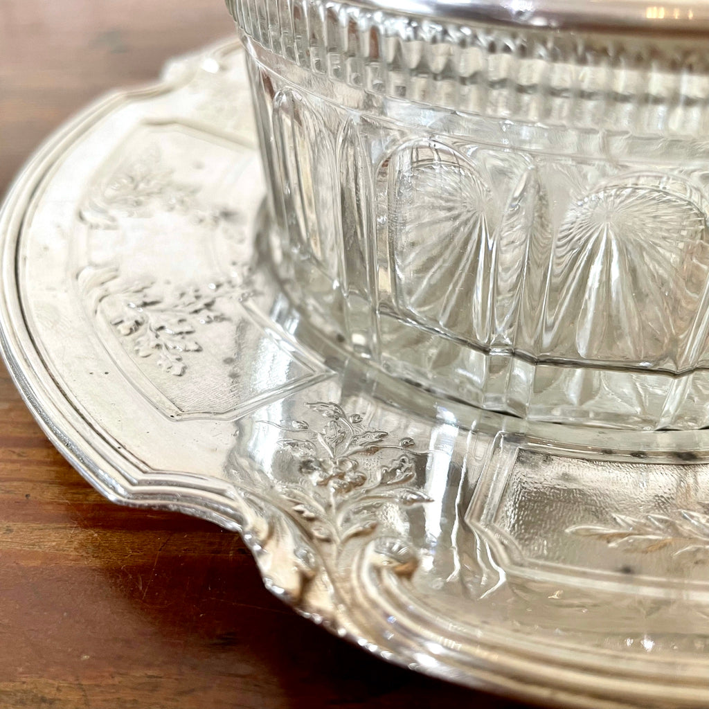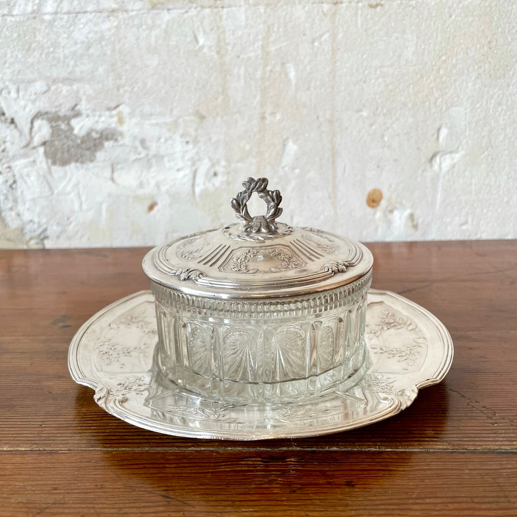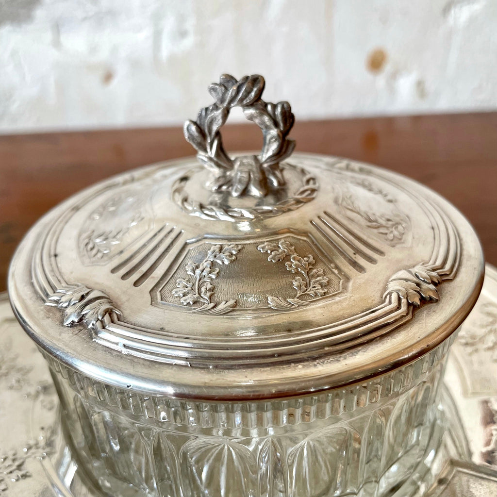 Ravissant sucrier ou bonbonnière en verre et métal argenté composé d'une soucoupe, du ramequin et de son couvercle joliment travaillé