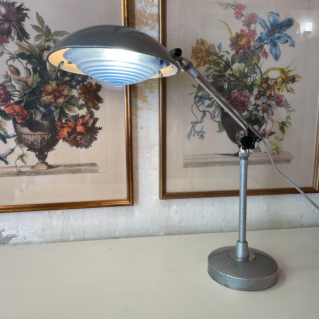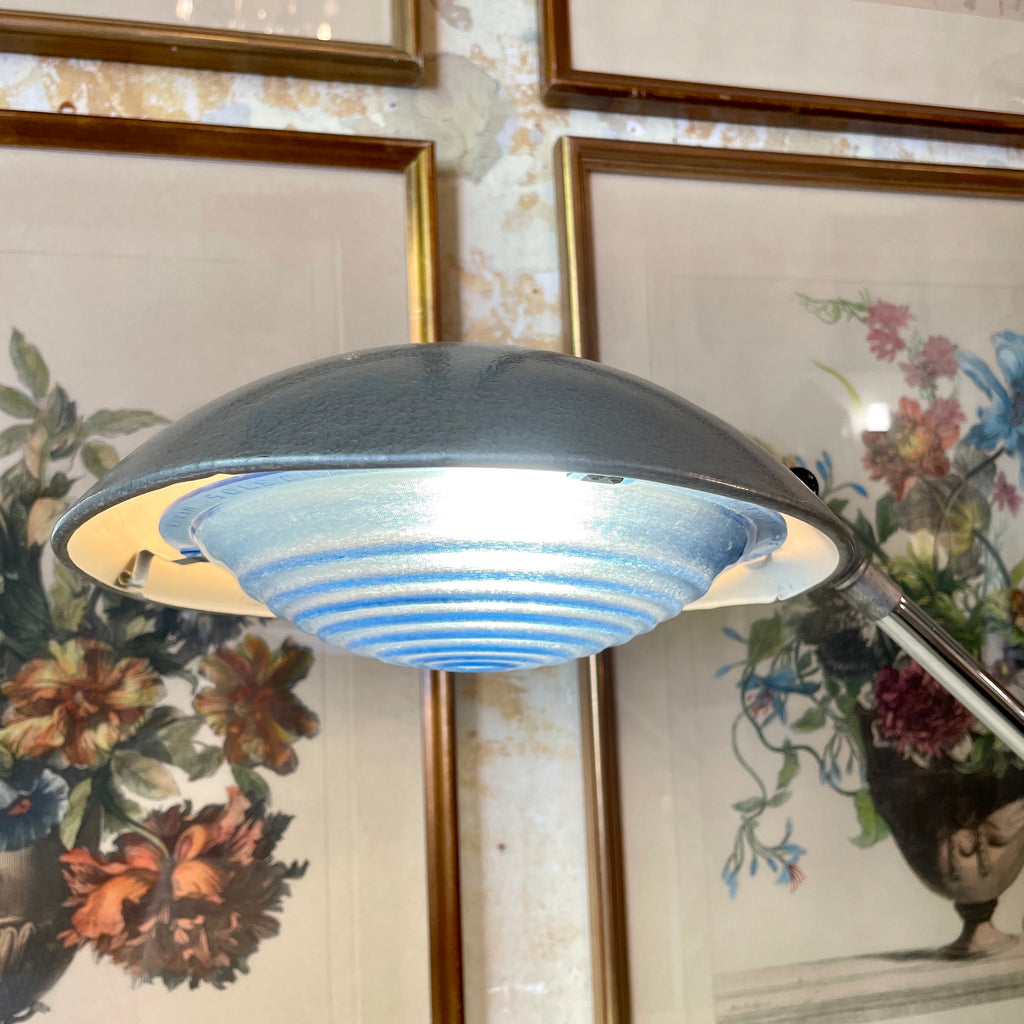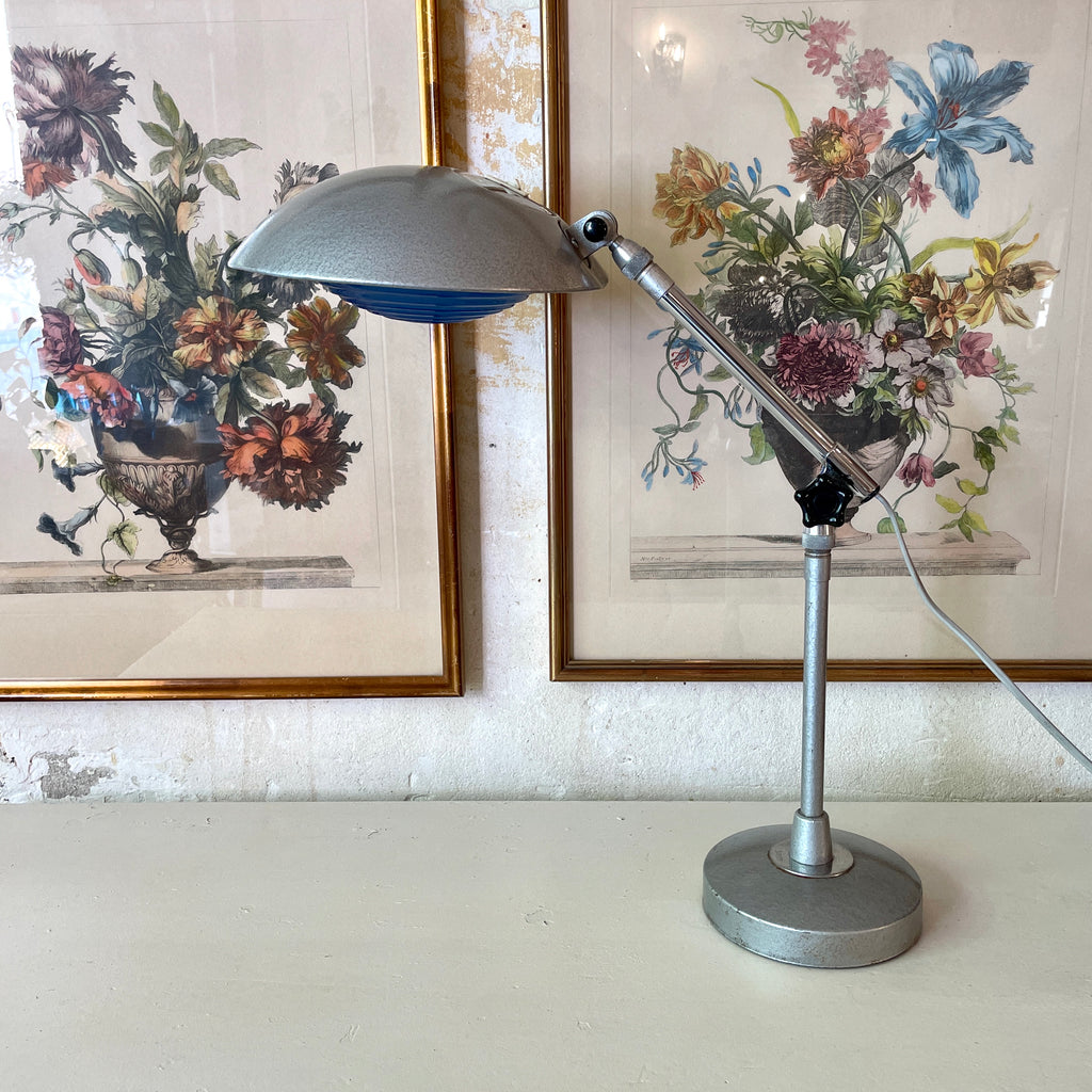 Lampe de bureau d'architecte de Ferdinand Solere années 50. Complète avec encore présent le tamiseur diffuseur en résine bleu ciel